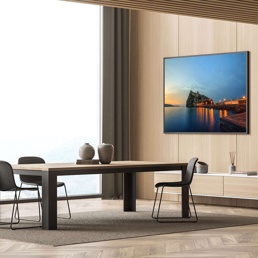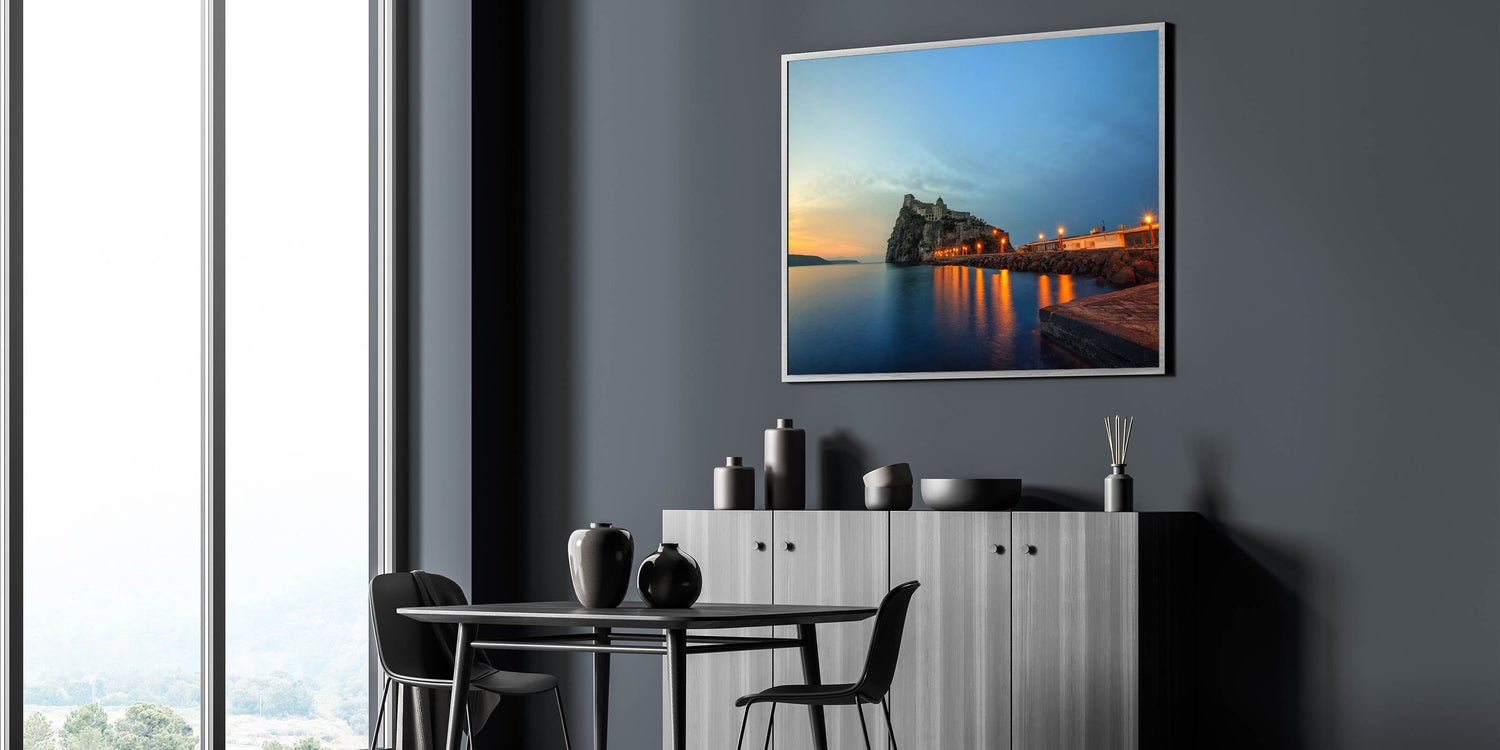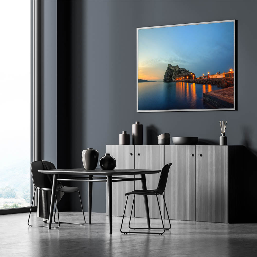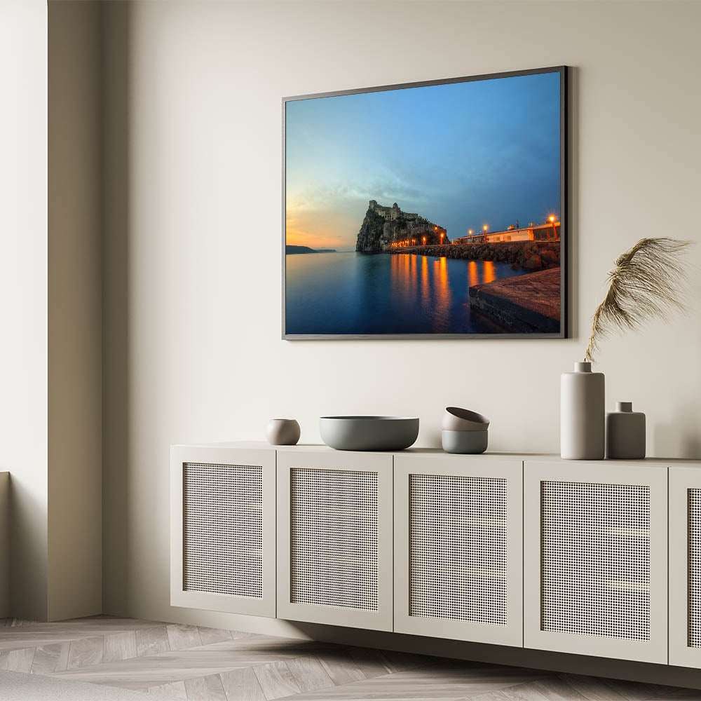Enhance your space with this breathtaking Naples Skyline Wall Decor, featuring the silhouette of a coastal castle as the sun sets over the Mediterranean. This stunning piece from the Beautiful Naples Wall Art Collection showcases the serene and mystical atmosphere of Naples’ historic coastline, making it a perfect addition for those who love Naples Coastal Scene Art.