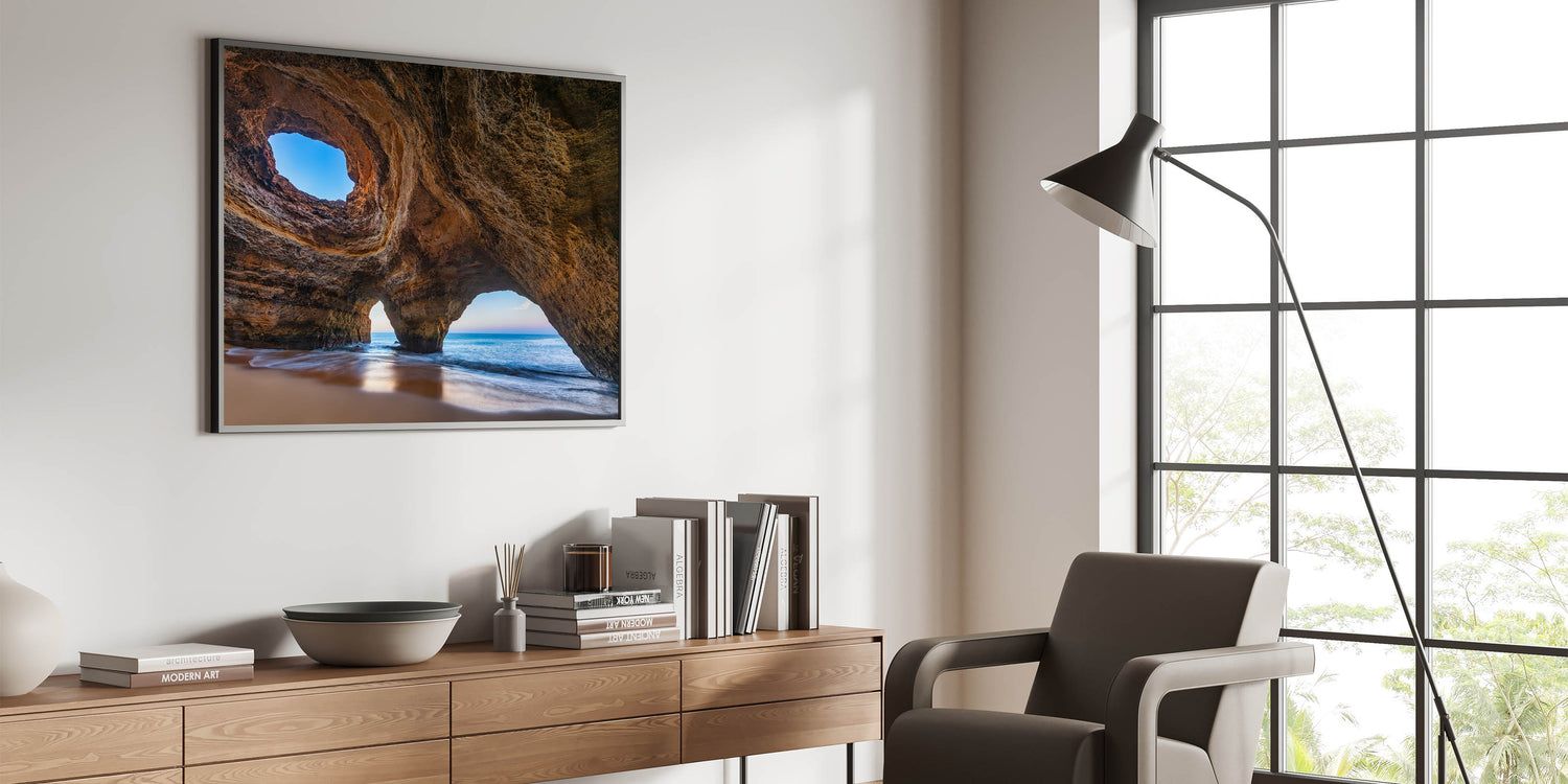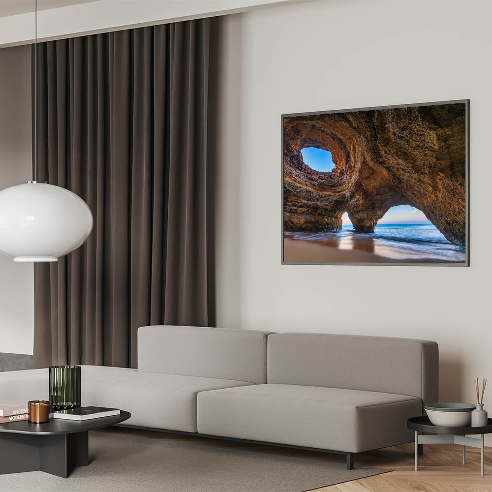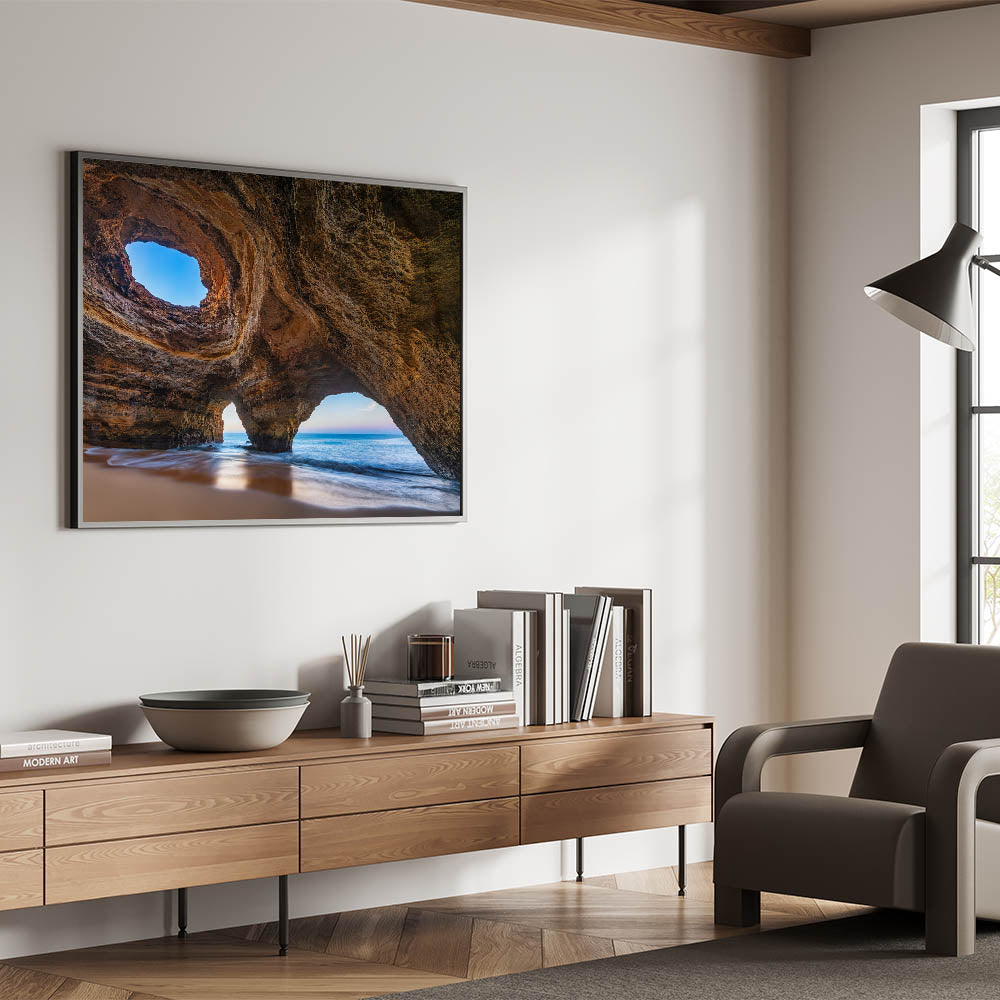 This scenic coastal cave photography print will transform your living space, offering a window into the peaceful and timeless beauty of nature. Whether in a living room, bedroom, or office, this piece will bring a sense of calm and elegance to your decor.