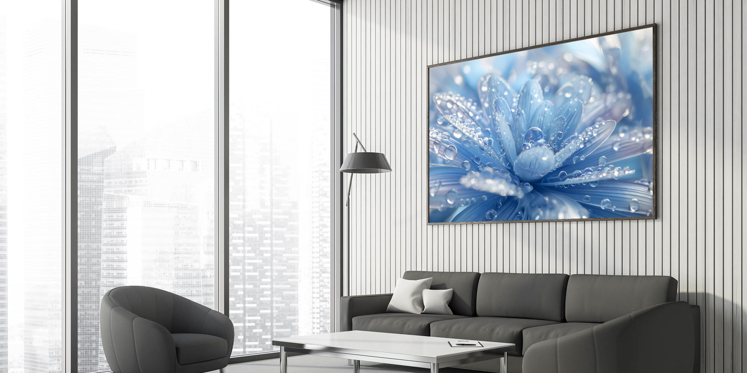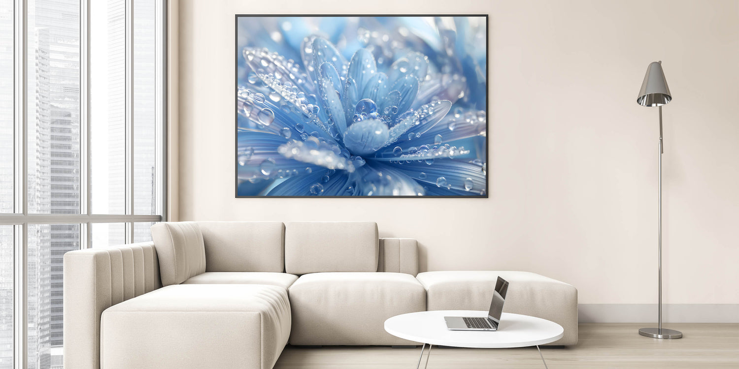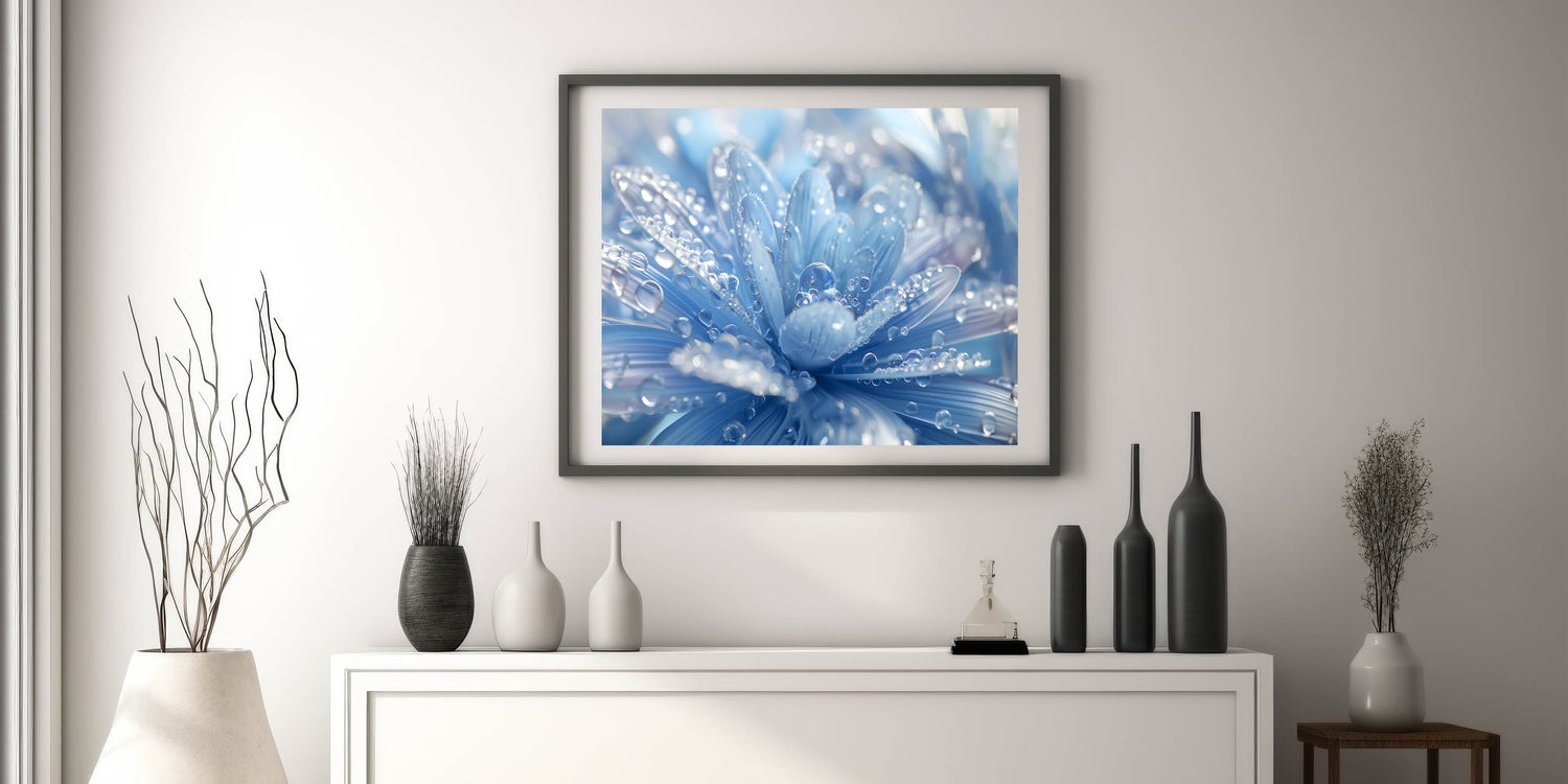 - Nature close-up prints that highlight the fine details of water droplets on vibrant blue petals.