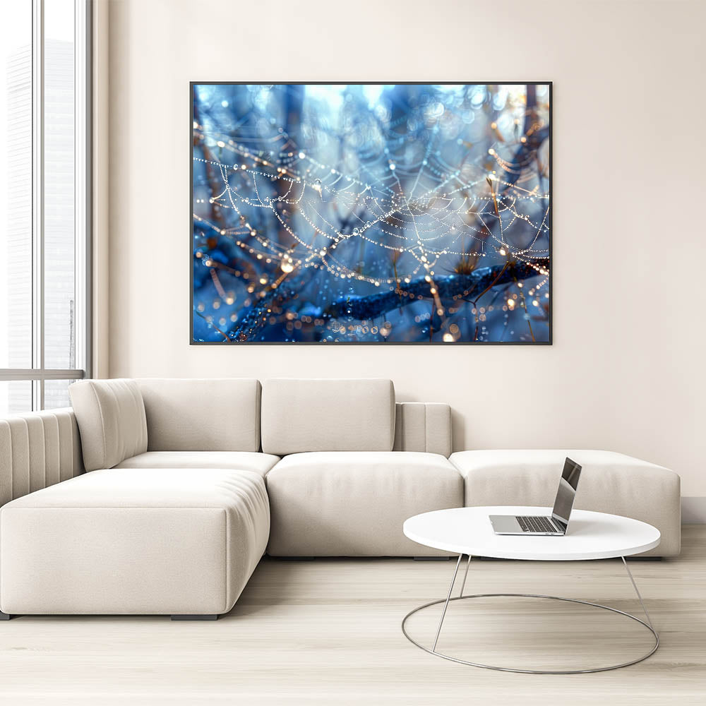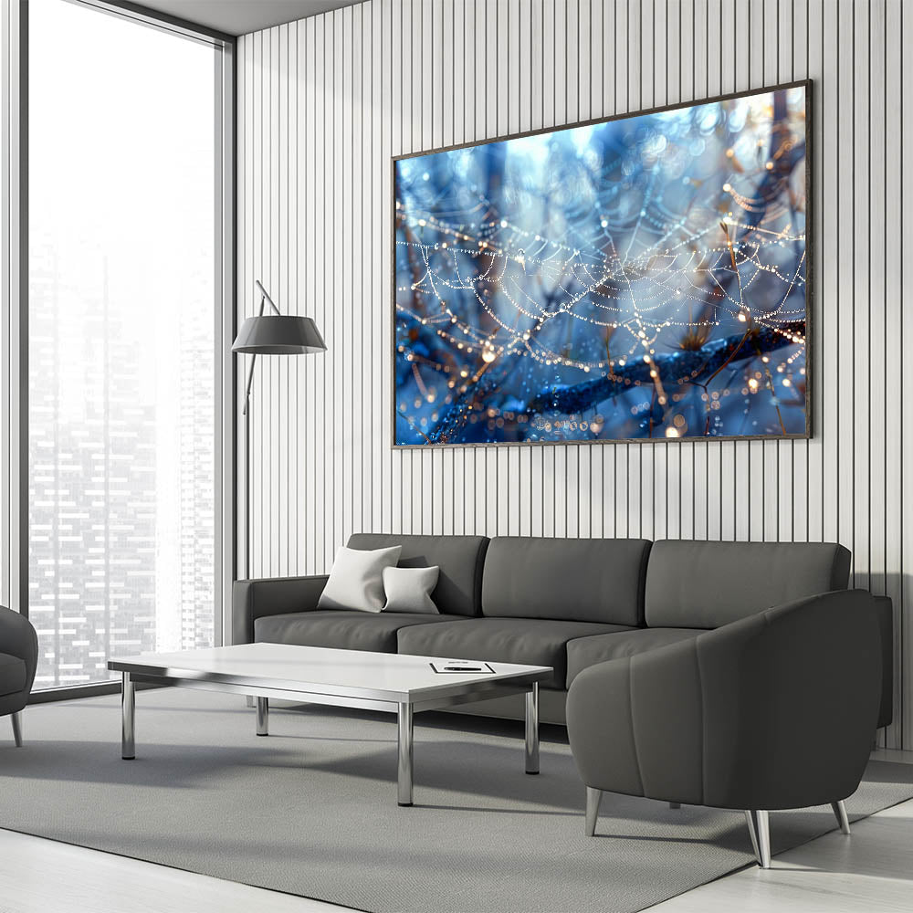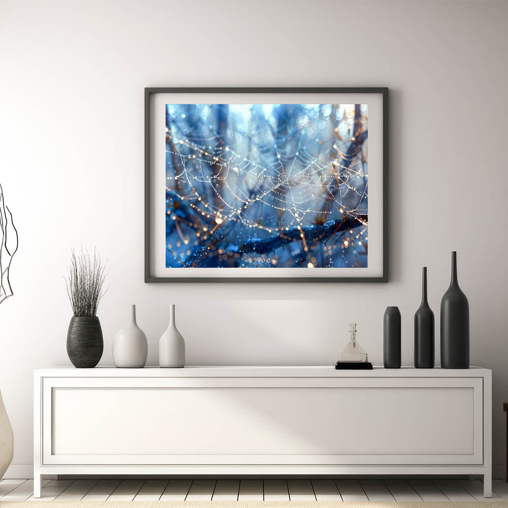 Bring a touch of nature's delicate beauty into your space with this stunning close-up of a dew-covered spiderweb. The glistening water droplets hanging from the fine strands of the web create a magical and ethereal scene. With rich blue tones and intricate details, this piece of water-inspired wall art adds a sense of wonder and tranquility to any room.