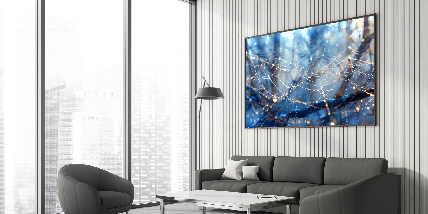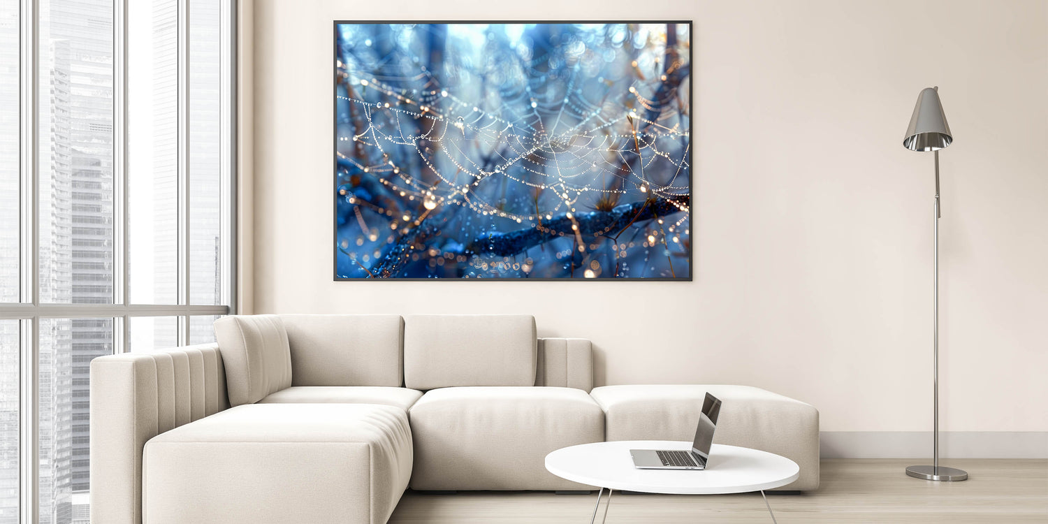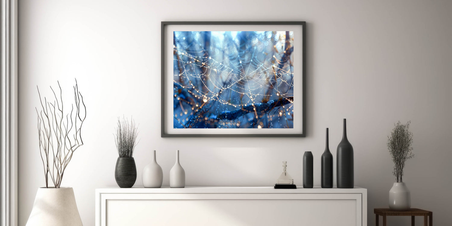 Bring a touch of nature's delicate beauty into your space with this stunning close-up of a dew-covered spiderweb. The glistening water droplets hanging from the fine strands of the web create a magical and ethereal scene. With rich blue tones and intricate details, this piece of water-inspired wall art adds a sense of wonder and tranquility to any room.