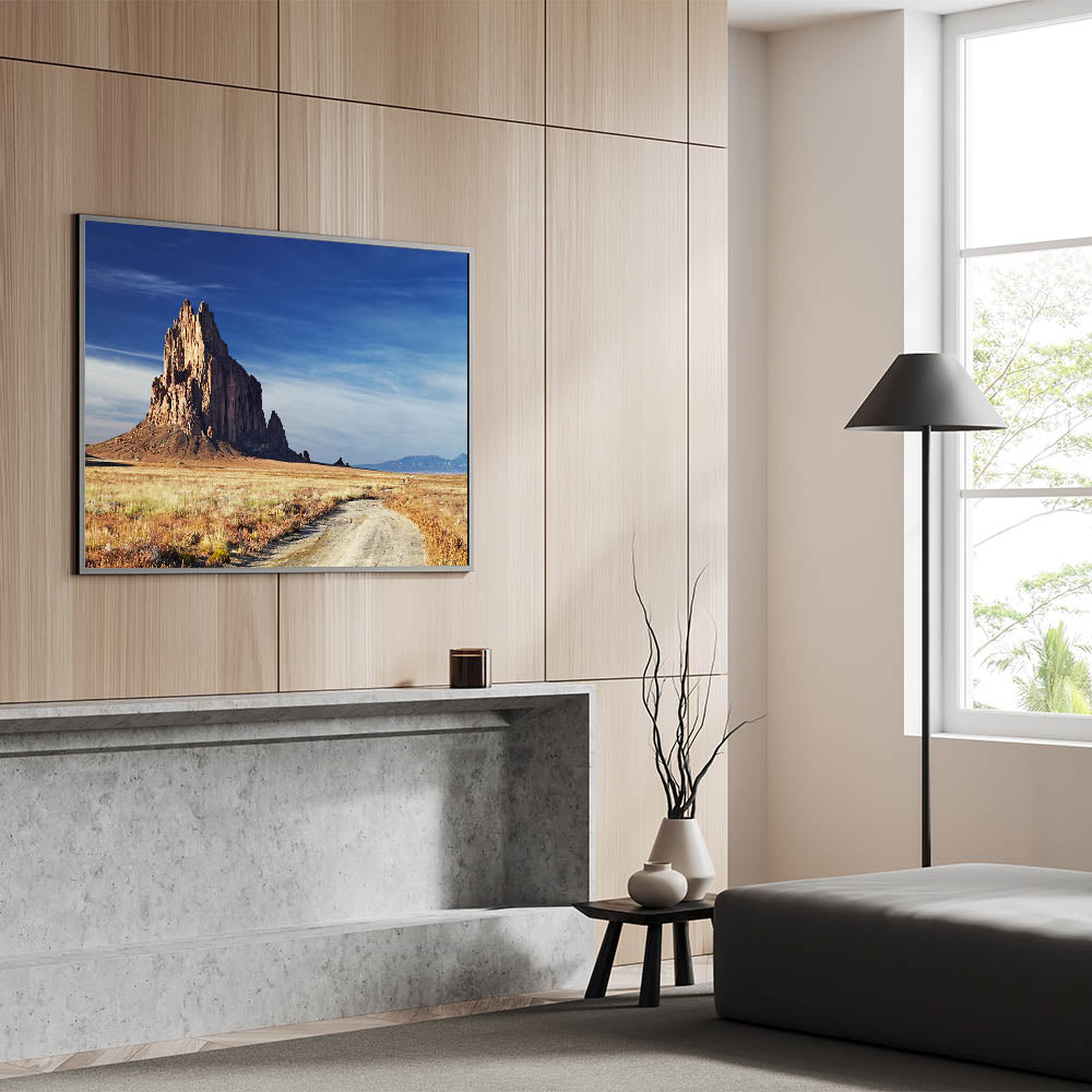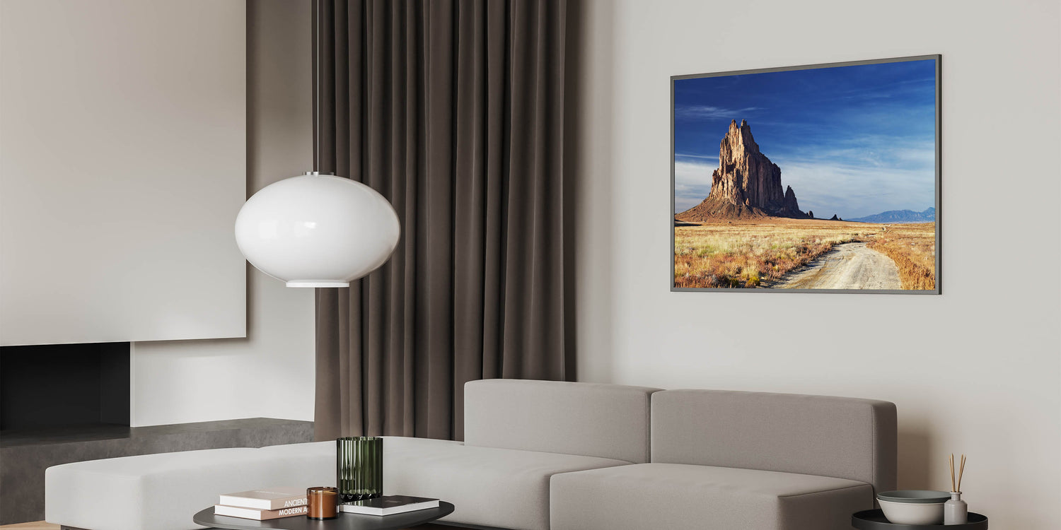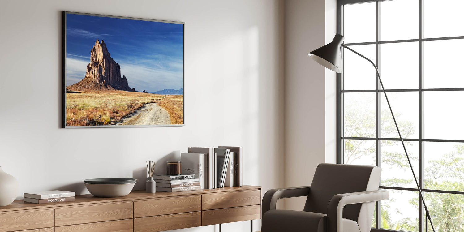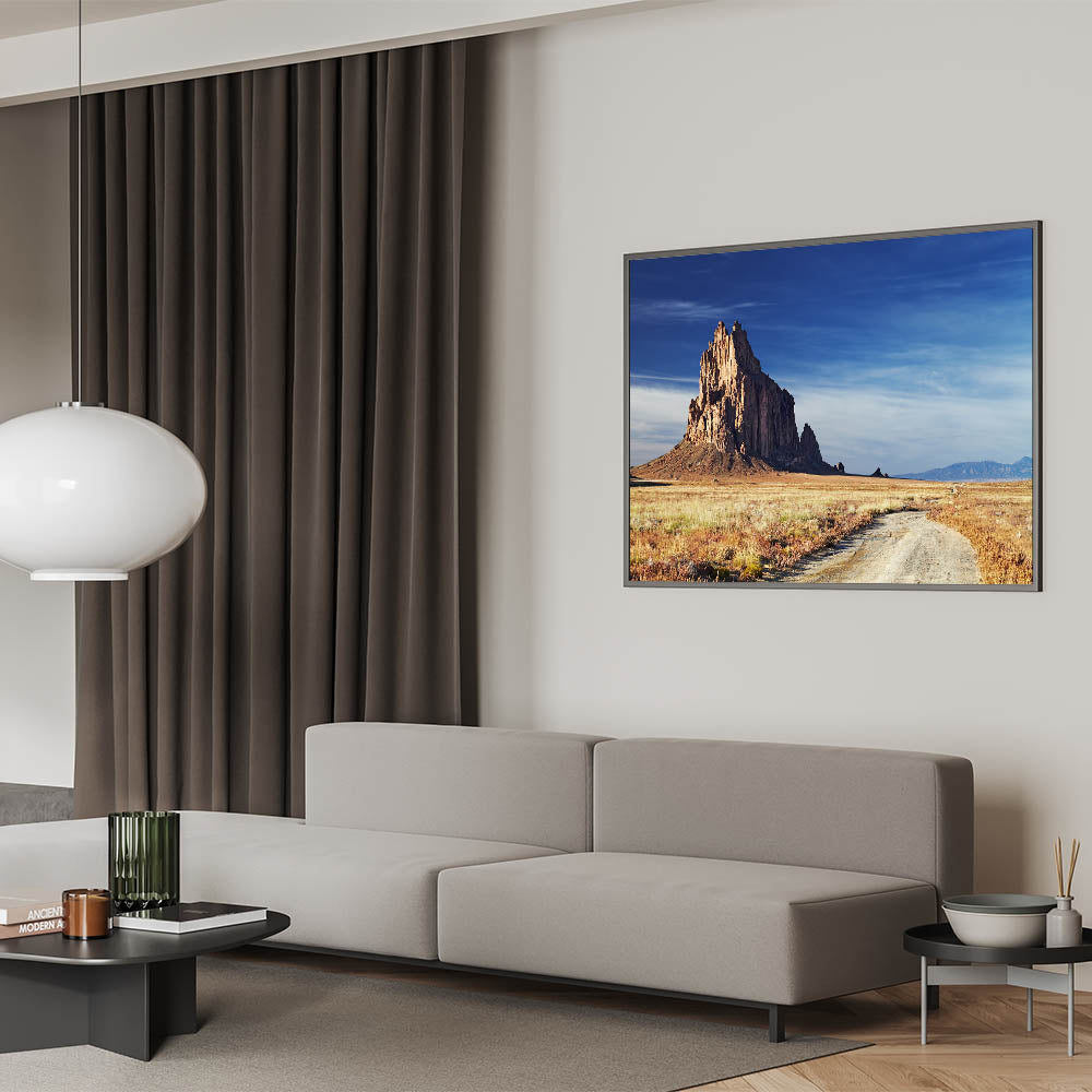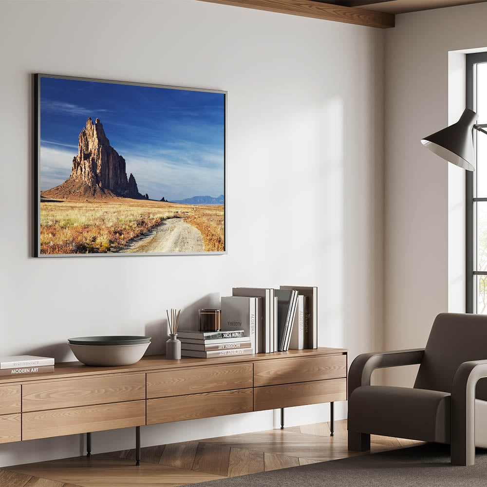 Celebrate the breathtaking beauty of New Mexico’s iconic Shiprock Peak with this stunning landscape wall art. This high-quality New Mexico landscape art showcases the dramatic rock formation rising from the desert floor, set against a vibrant blue sky. Perfect for those looking to bring the majesty of Southwestern nature into their home decor.