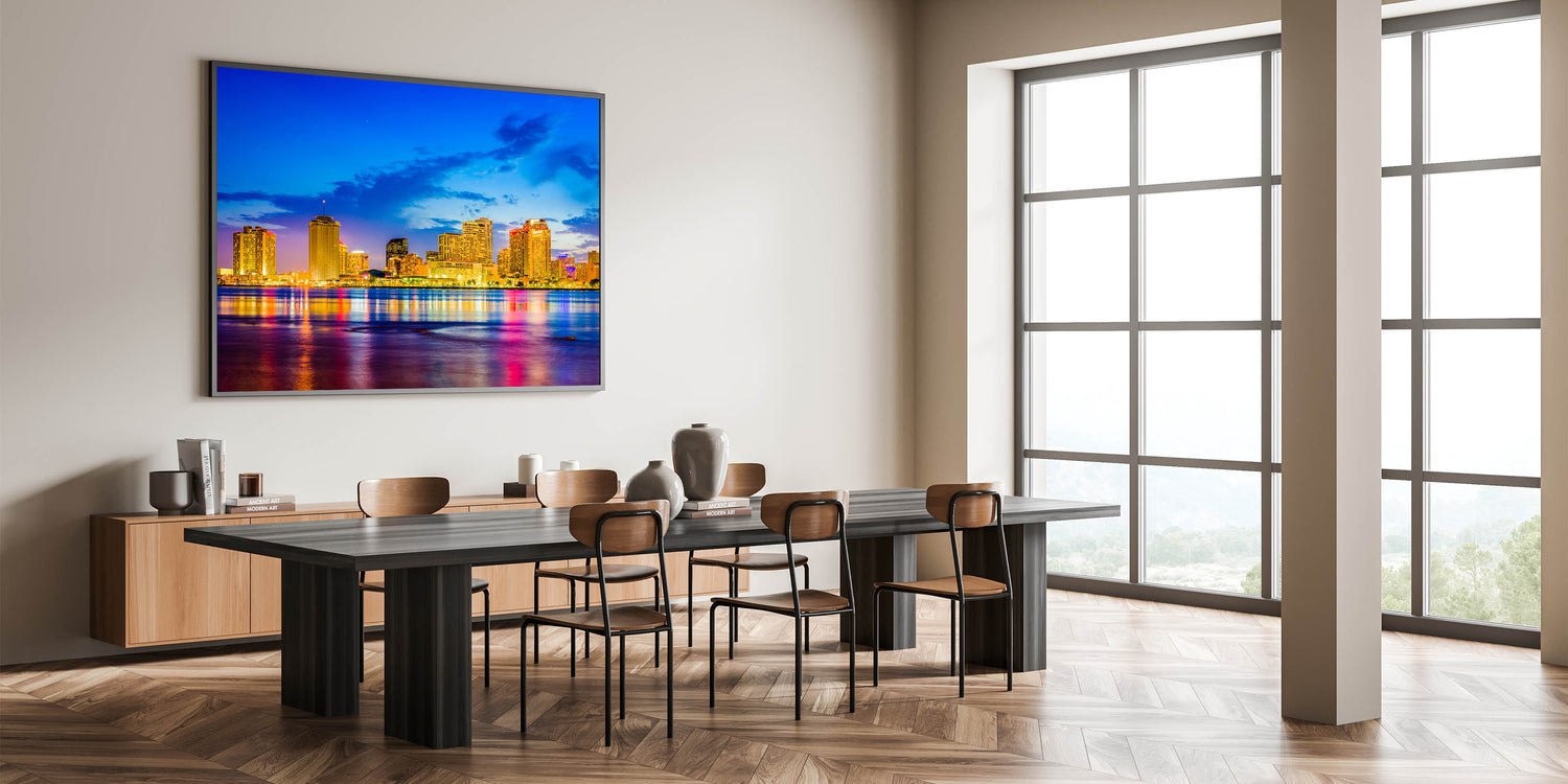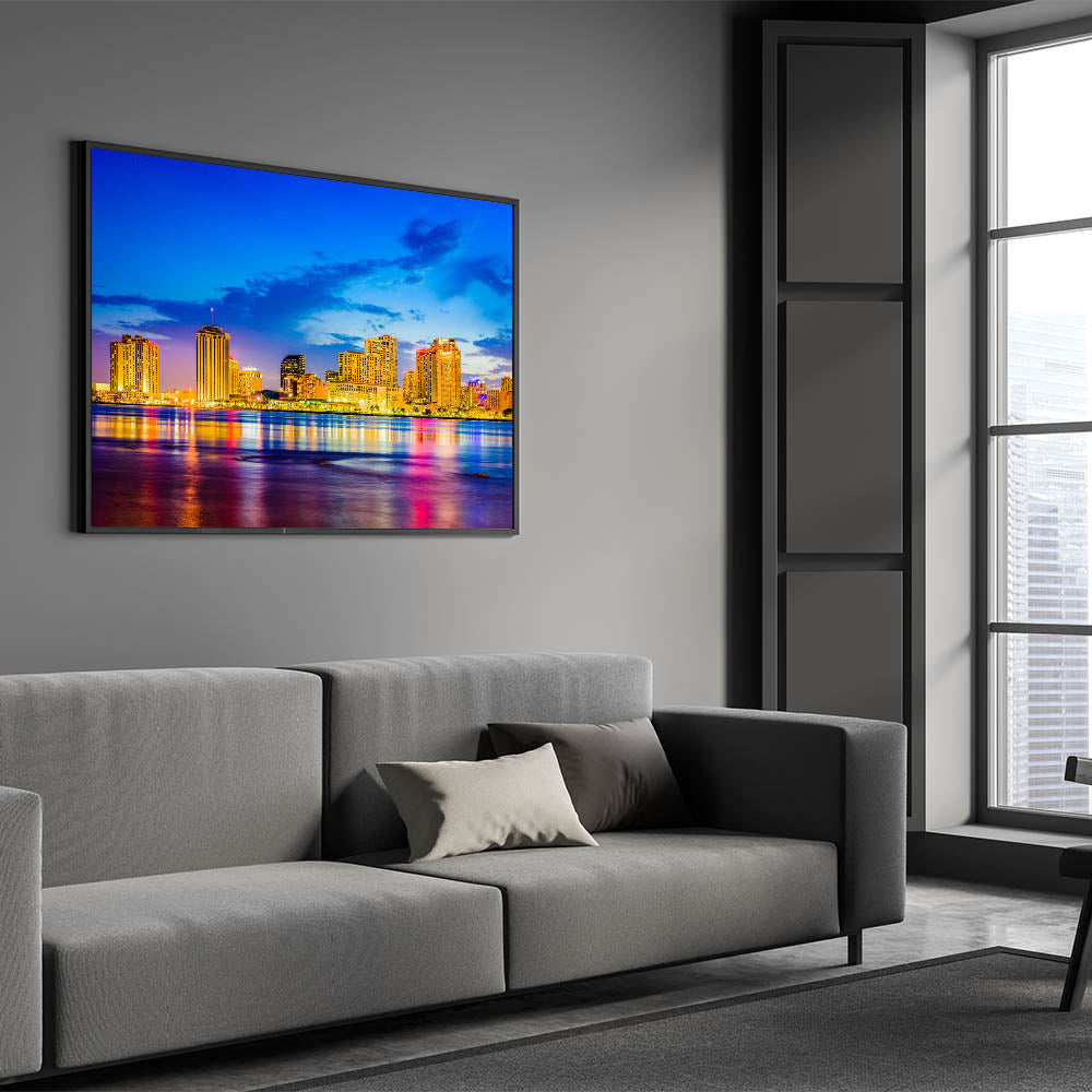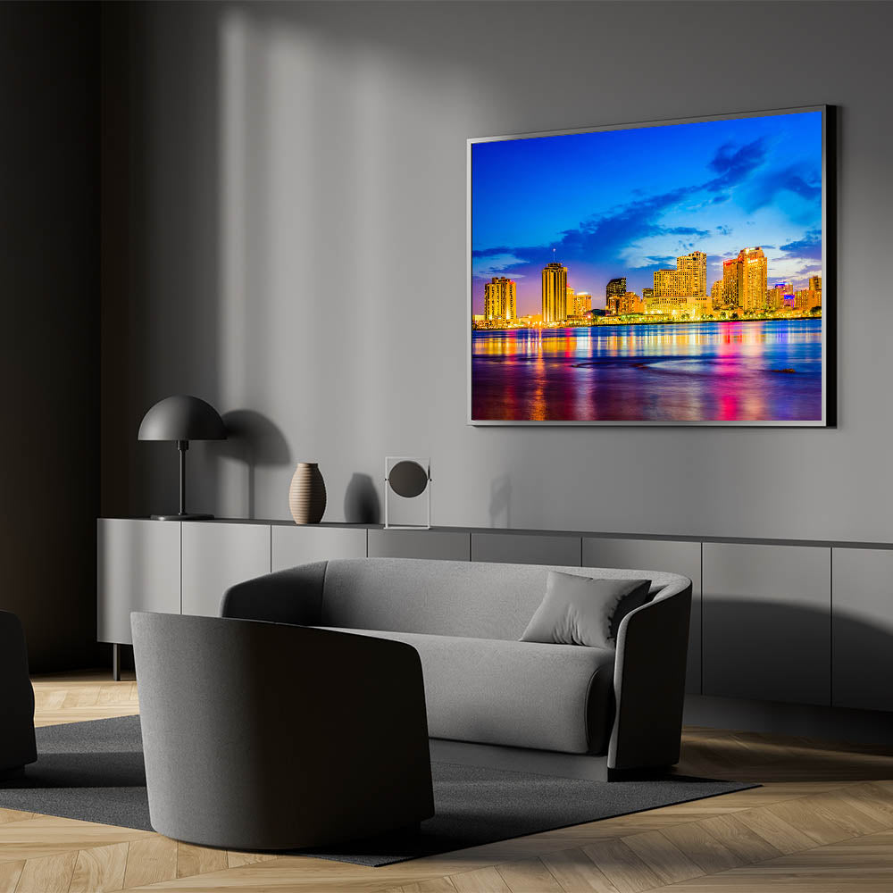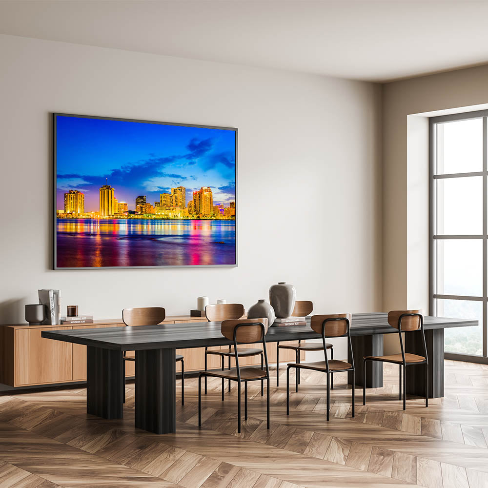 Add a burst of vibrant color to your space with this stunning photograph of the New Orleans skyline at night. Capturing the city's iconic buildings reflecting on the Mississippi River, this piece highlights the rich, dynamic beauty of the Crescent City. Whether you're a lover of Louisiana scenery or simply looking to enhance your decor with a stunning cityscape, this artwork delivers a perfect balance of urban energy and natural beauty.
