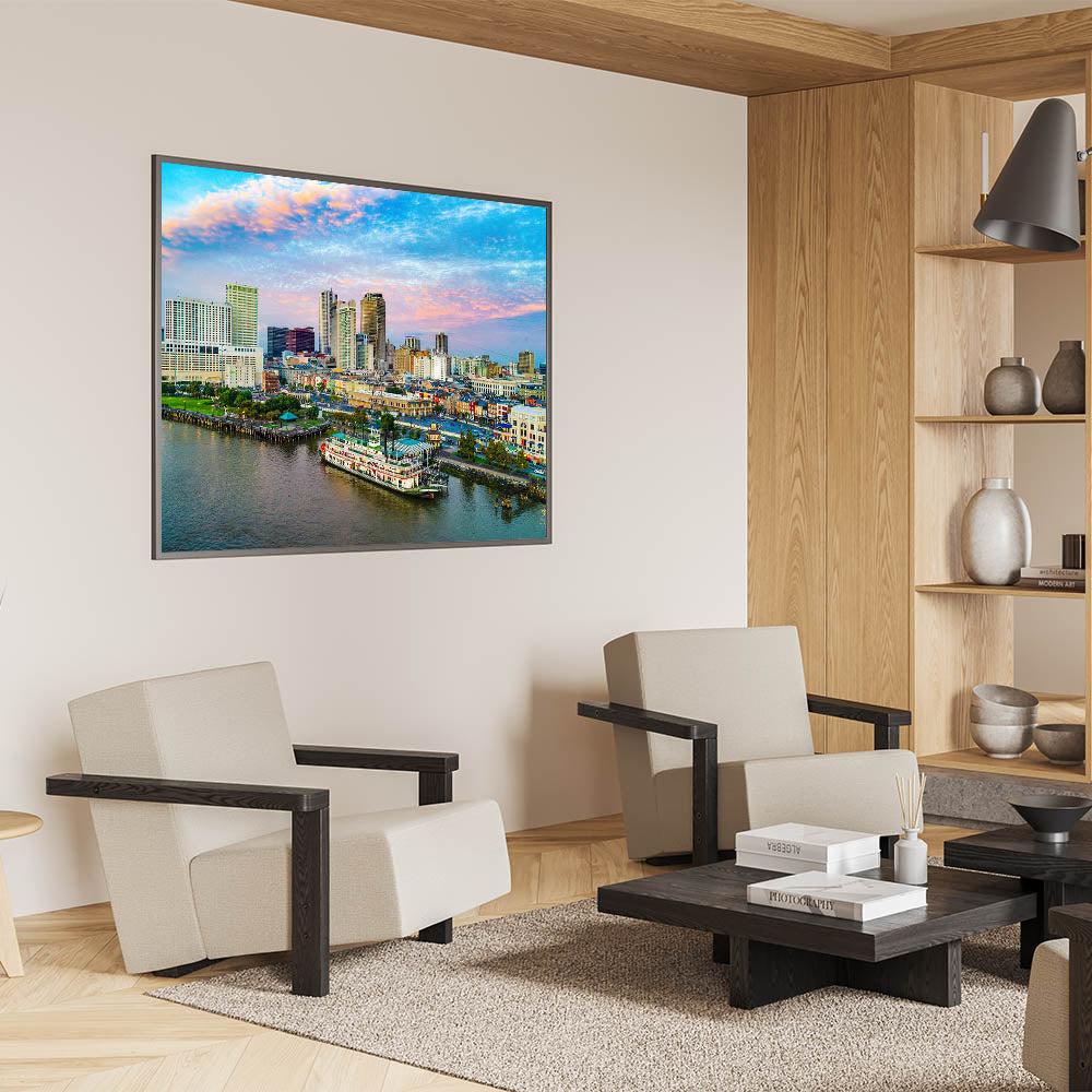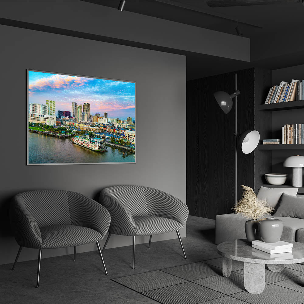 Capture the essence of New Orleans with this vibrant riverfront cityscape print, featuring the iconic skyline and a historic steamboat. The dynamic mix of warm and cool tones, along with the pastel sky, creates a visually stunning piece that brings the charm and spirit of New Orleans into any room. Perfect for those who love both the cultural heritage and modern energy of this unique city.