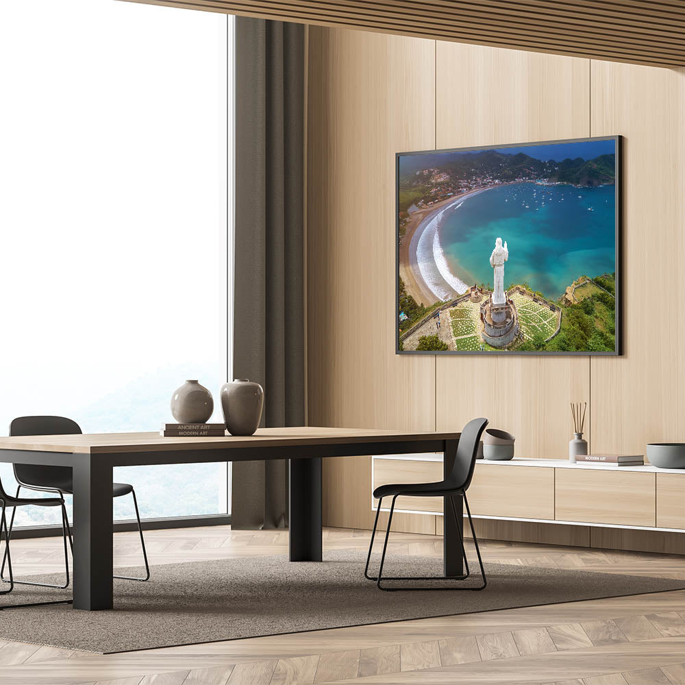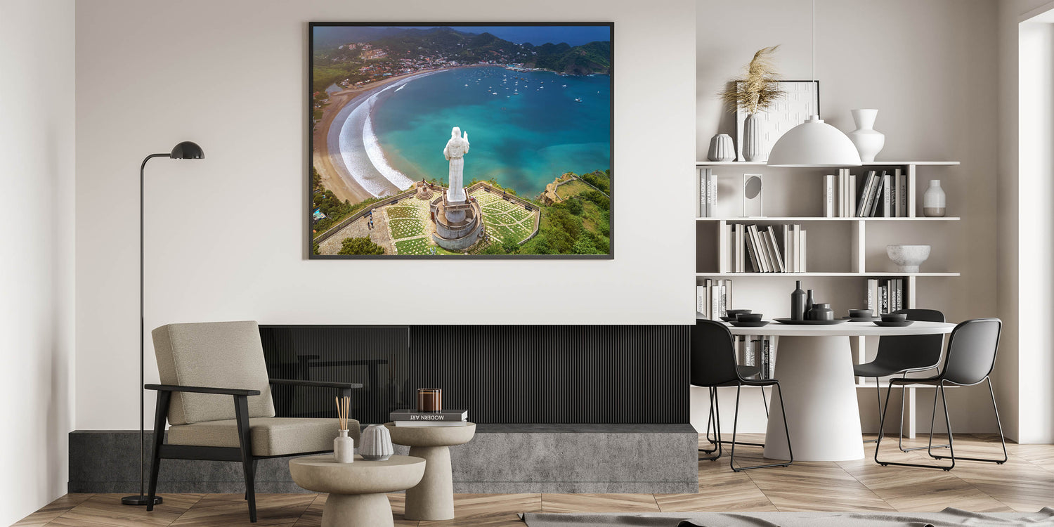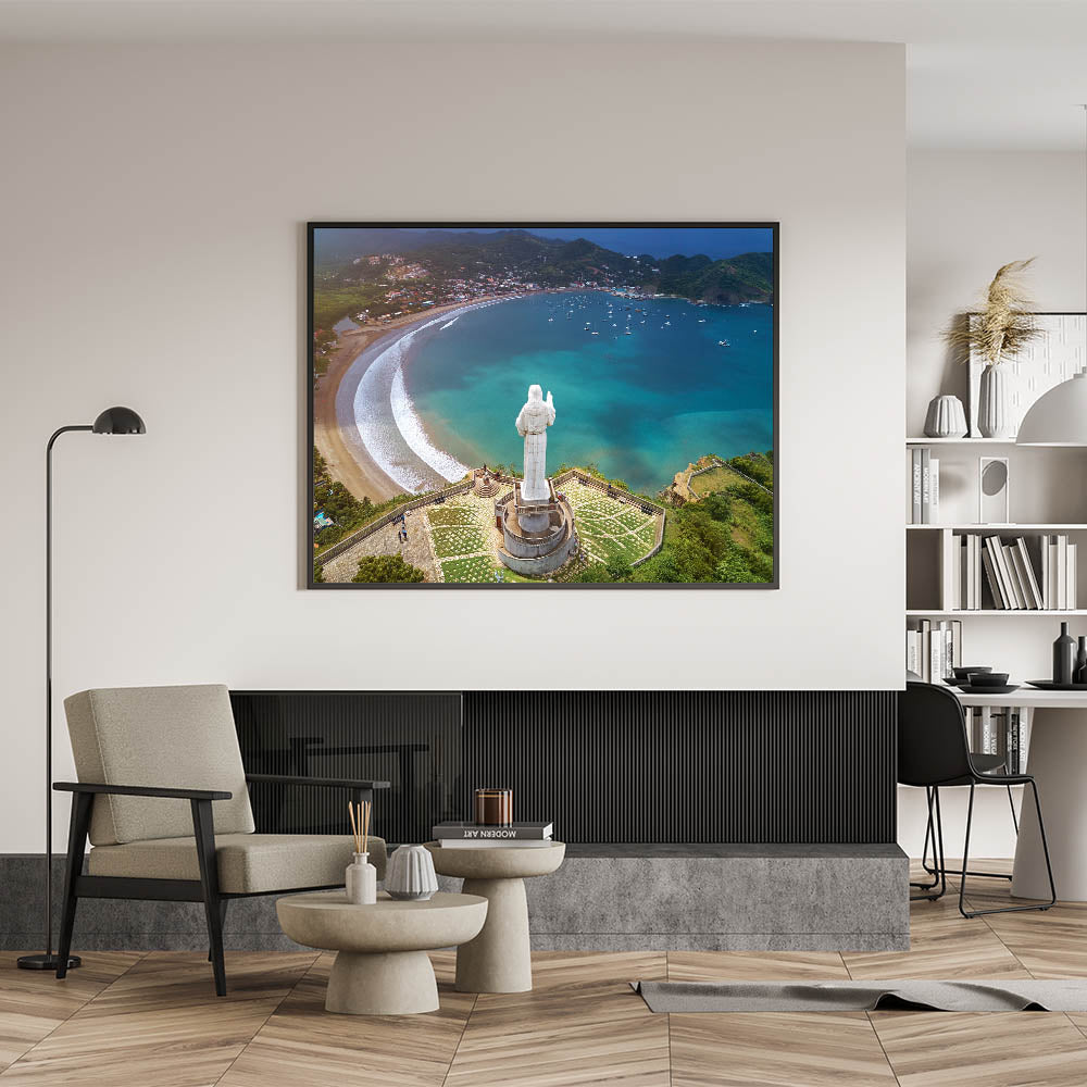 Elevate your space with the "Nicaraguan Bay View Statue - Coastal Landscape Canvas," capturing the serene and majestic presence of a grand statue overlooking the sparkling waters of a Nicaraguan bay. This canvas print offers a unique perspective that combines human artistry with natural beauty, ideal for those who appreciate scenic landscapes and cultural landmarks.