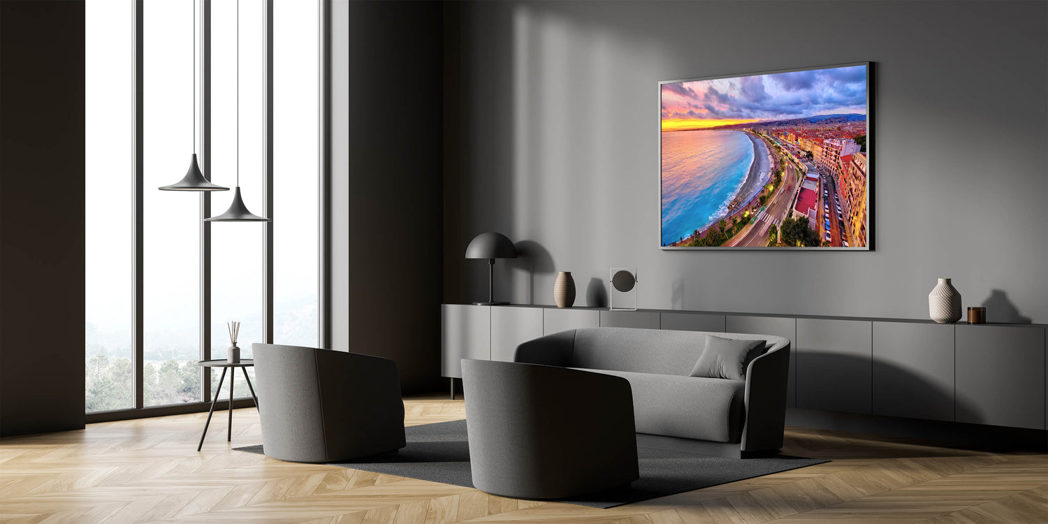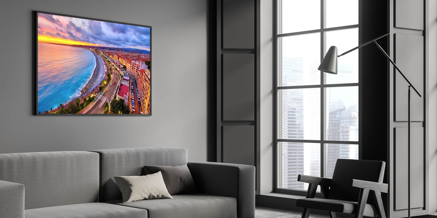 Capture the vibrant energy of Nice, France, with this stunning Nice Cityscape Art. This artwork features a breathtaking view of the Promenade des Anglais during sunset, where the skies burst with hues of pink, orange, and purple, reflecting on the Mediterranean Sea. The curved coastline, bustling promenade, and radiant city lights make this Scenic Nice Canvas a lively addition to any space. Perfect for those looking to bring a piece of the French Riviera’s beauty into their home.