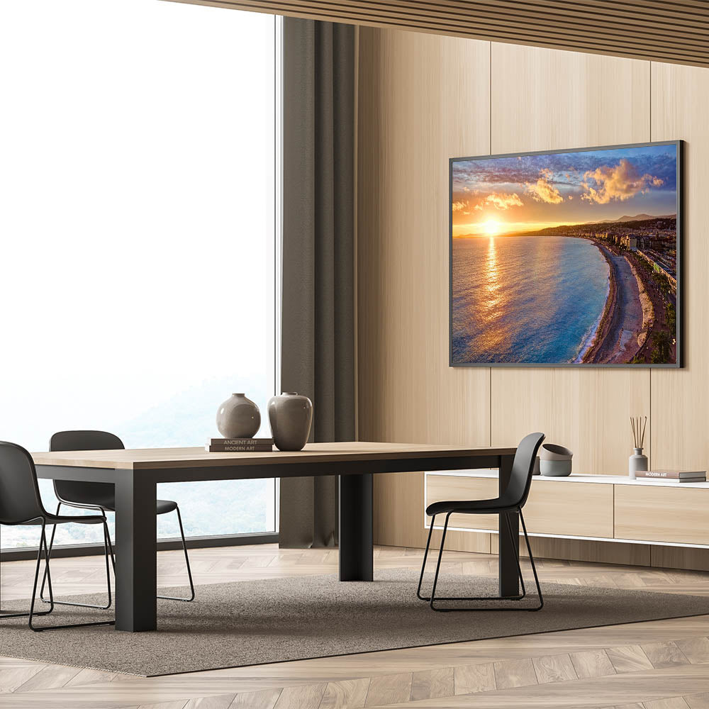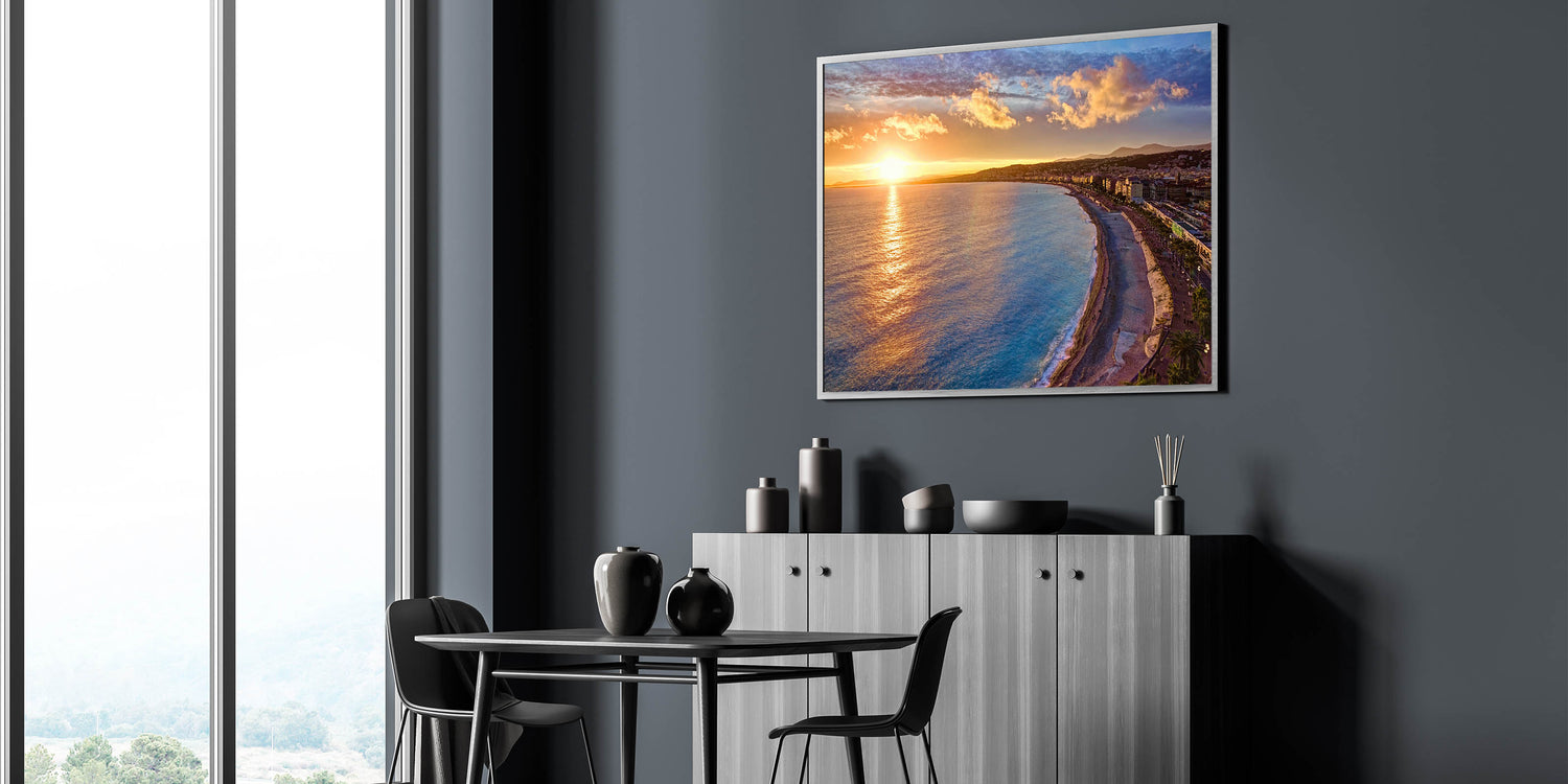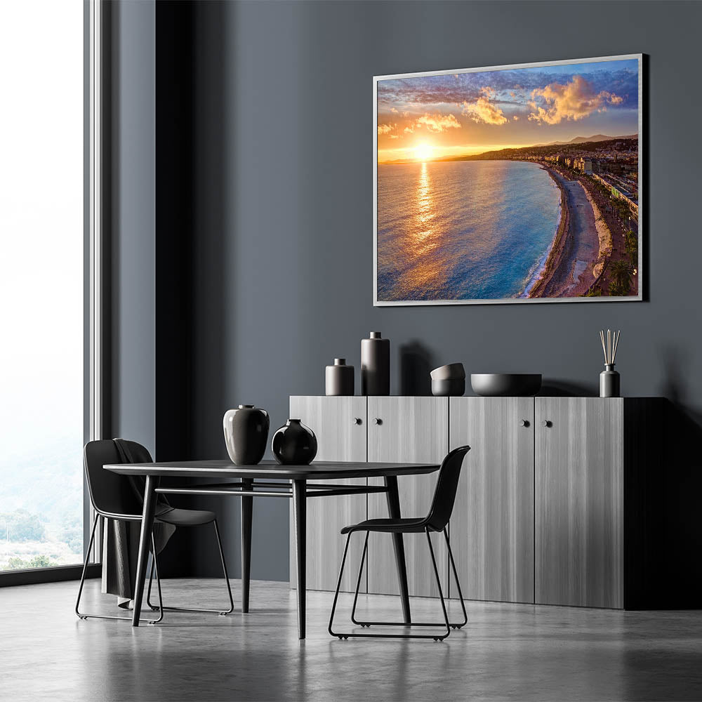 Bring the golden glow of a Mediterranean sunset into your home with this stunning Nice Coastal Art. Capturing the iconic Promenade des Anglais at sunset, this artwork features the brilliant orange and yellow hues of the setting sun as they reflect over the calm Mediterranean waters. The peaceful atmosphere, coupled with the lively energy of the coastline, makes this Scenic Nice Canvas a perfect addition to any space, offering a touch of elegance and serenity.