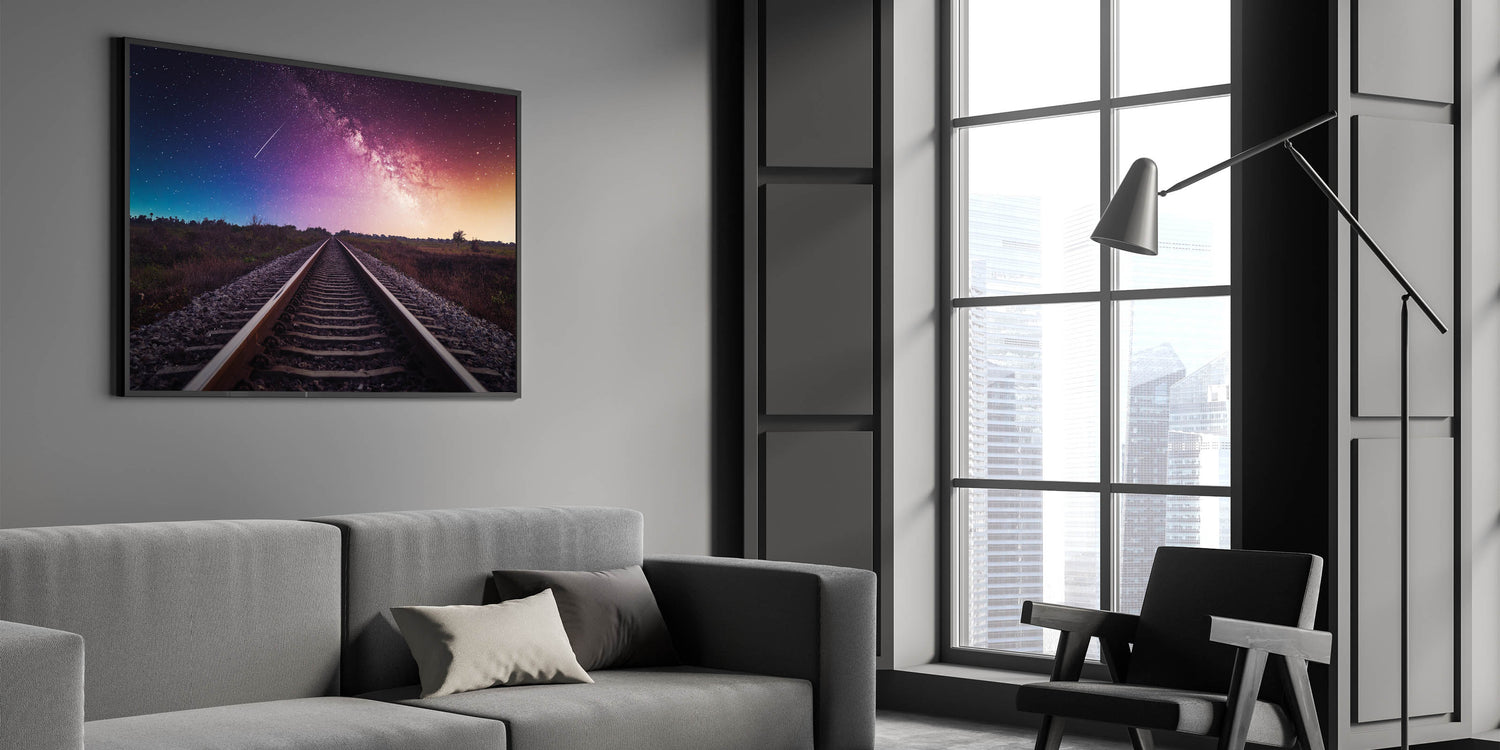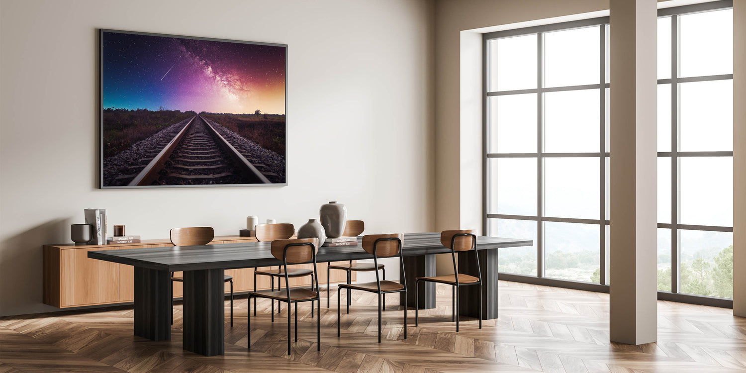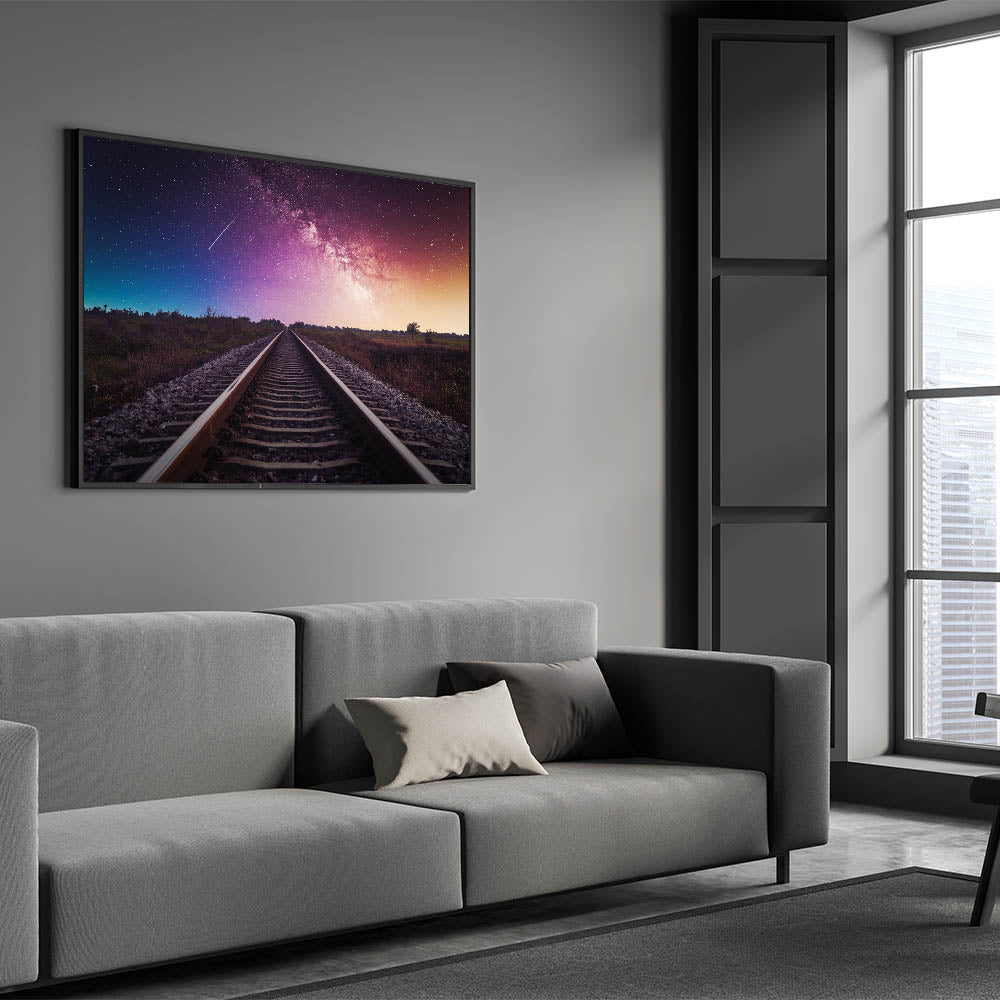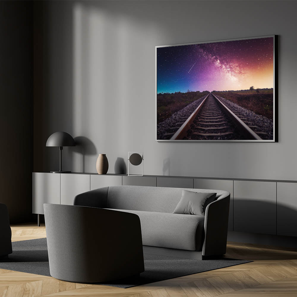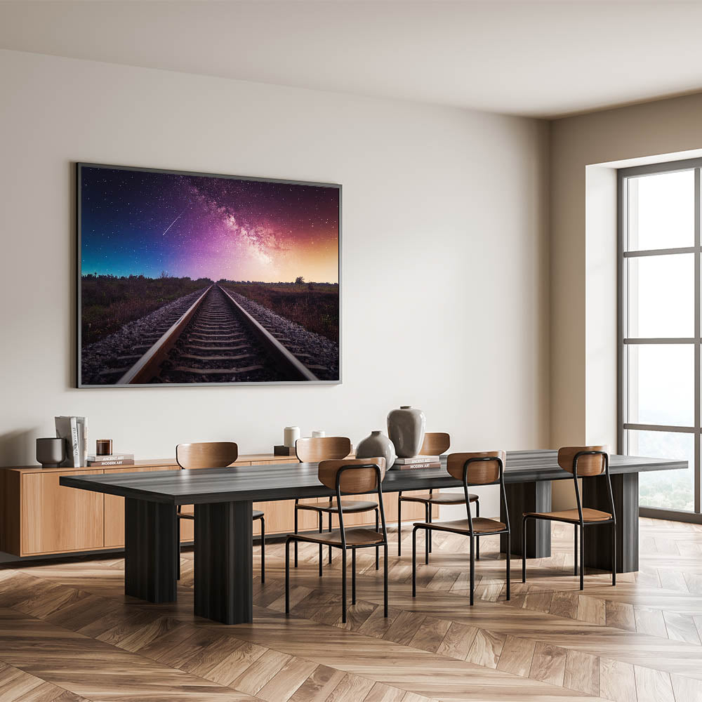 This starry night railway art piece is a perfect addition for stargazers and dreamers alike. Whether you're inspired by the cosmos or simply appreciate breathtaking photography, this artwork will bring the beauty of the universe into your home.