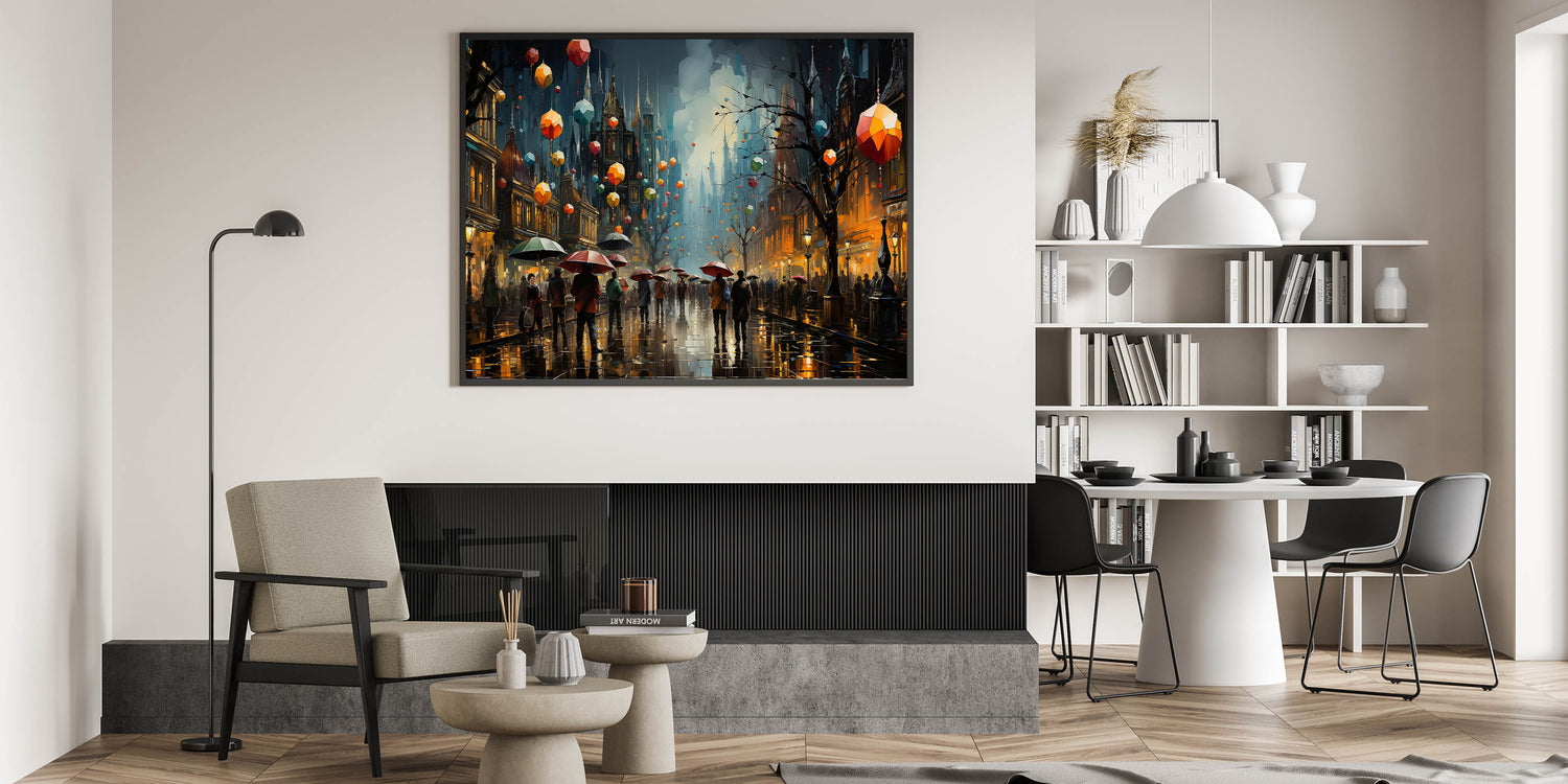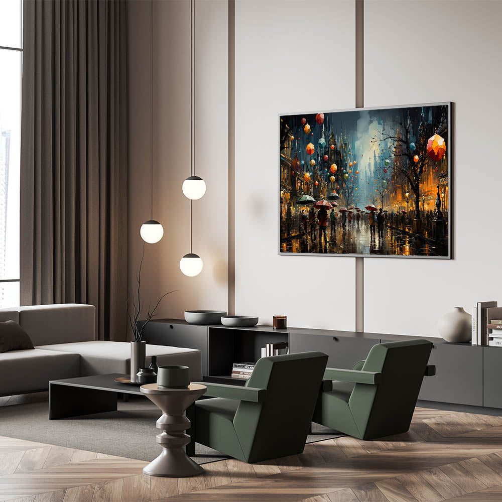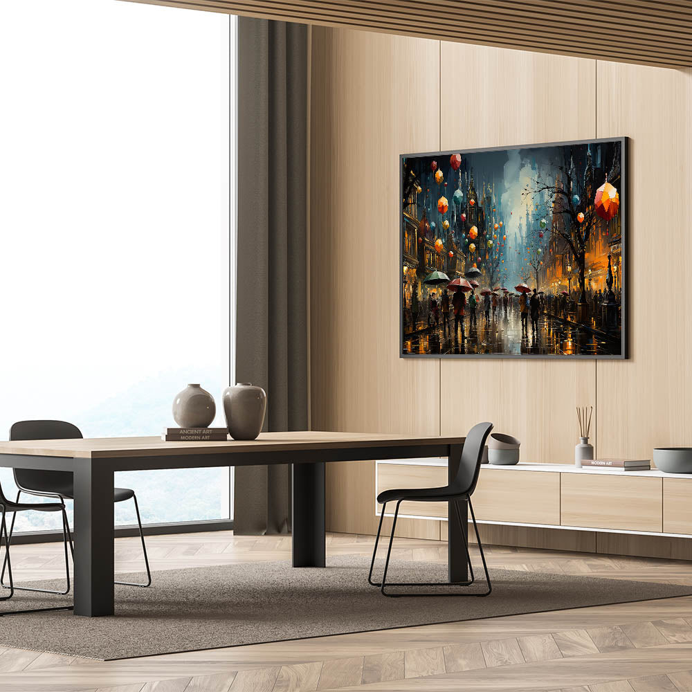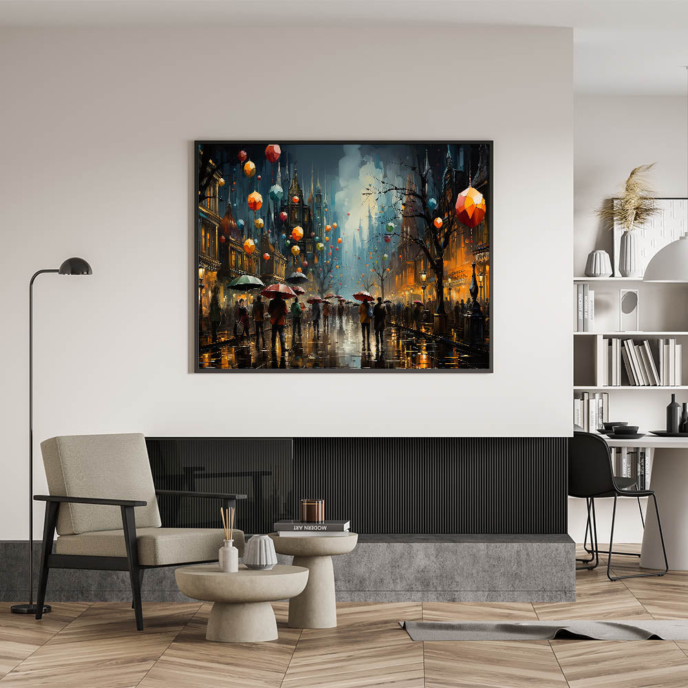 Infuse your space with the dynamic energy of a bustling city night with this stunning nighttime lantern street scene art. This canvas print captures the lively atmosphere of a busy urban street, where colorful lanterns float above a crowd of people carrying umbrellas under the glowing city lights. The rich hues of red, orange, and blue contrast beautifully against the darkened buildings, creating a mesmerizing and immersive scene. Perfect for adding a touch of vibrancy and intrigue to any room, this artwork is a standout piece in any decor.