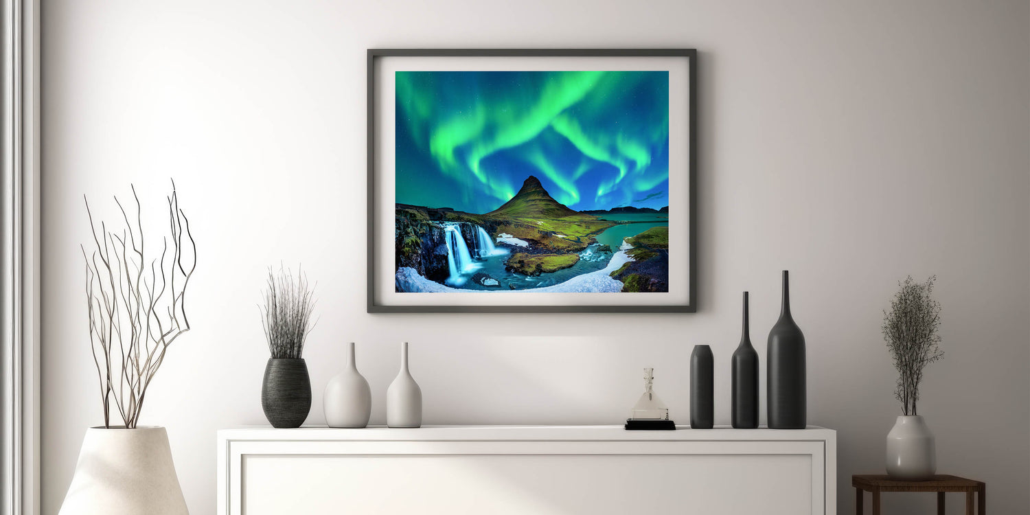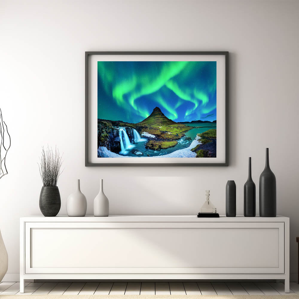Experience the mesmerizing beauty of Iceland with this stunning Nordic Wall Art featuring the Aurora Borealis over the iconic Kirkjufell Mountain. This artwork captures the vibrant green lights of the Northern Lights as they dance across the sky, reflecting on the cascading waterfalls and surrounding landscape. This piece is perfect for anyone looking to bring the magic of Iceland’s natural wonders into their home.