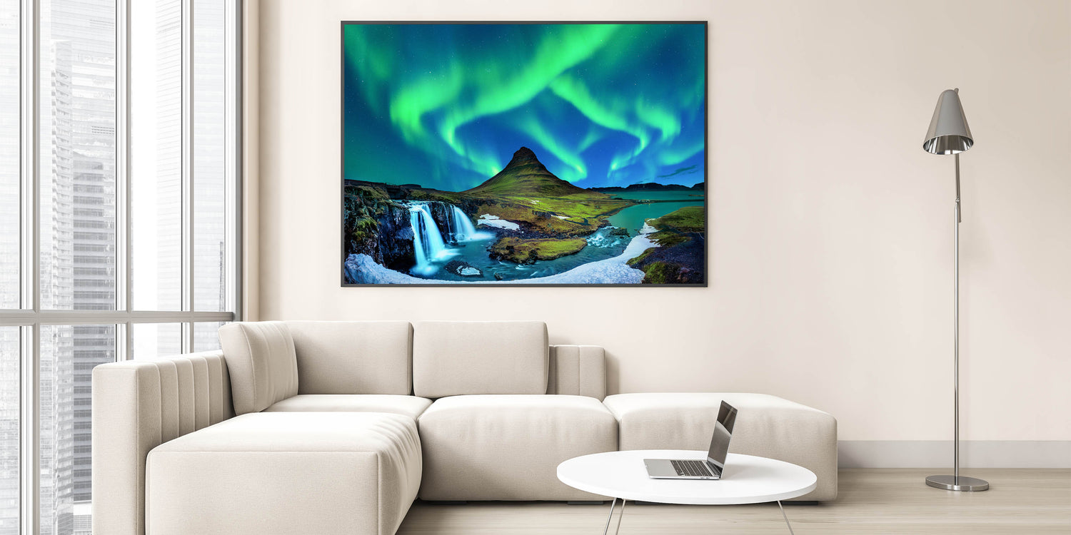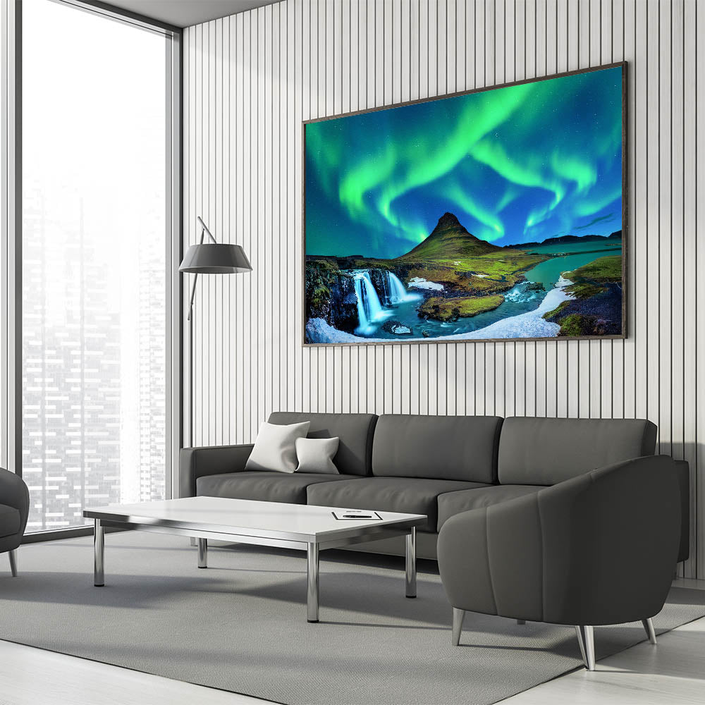 - Vivid details of the aurora, waterfalls, and mountain create a serene yet striking visual.