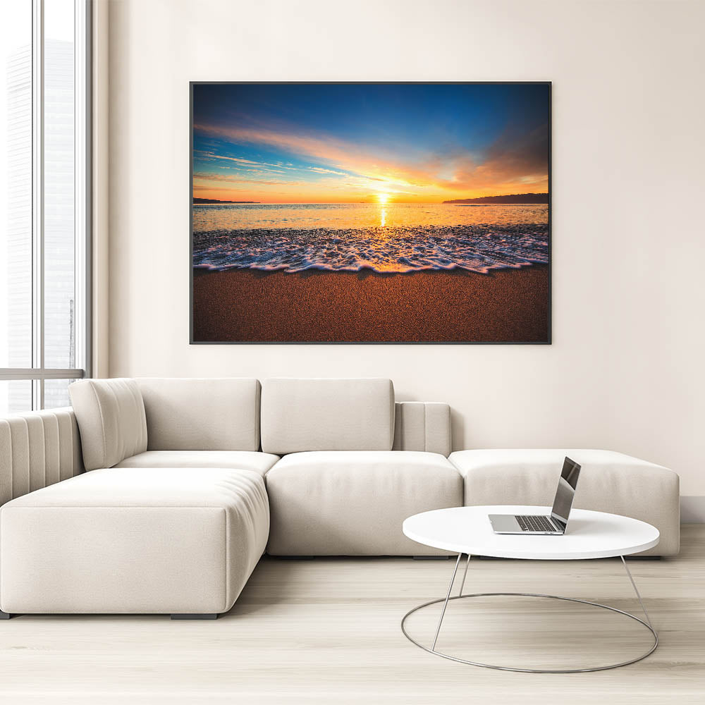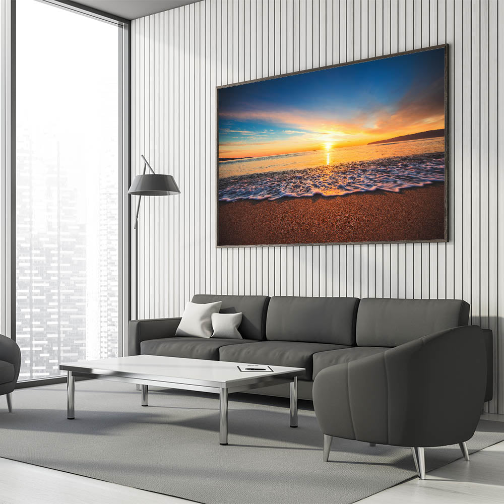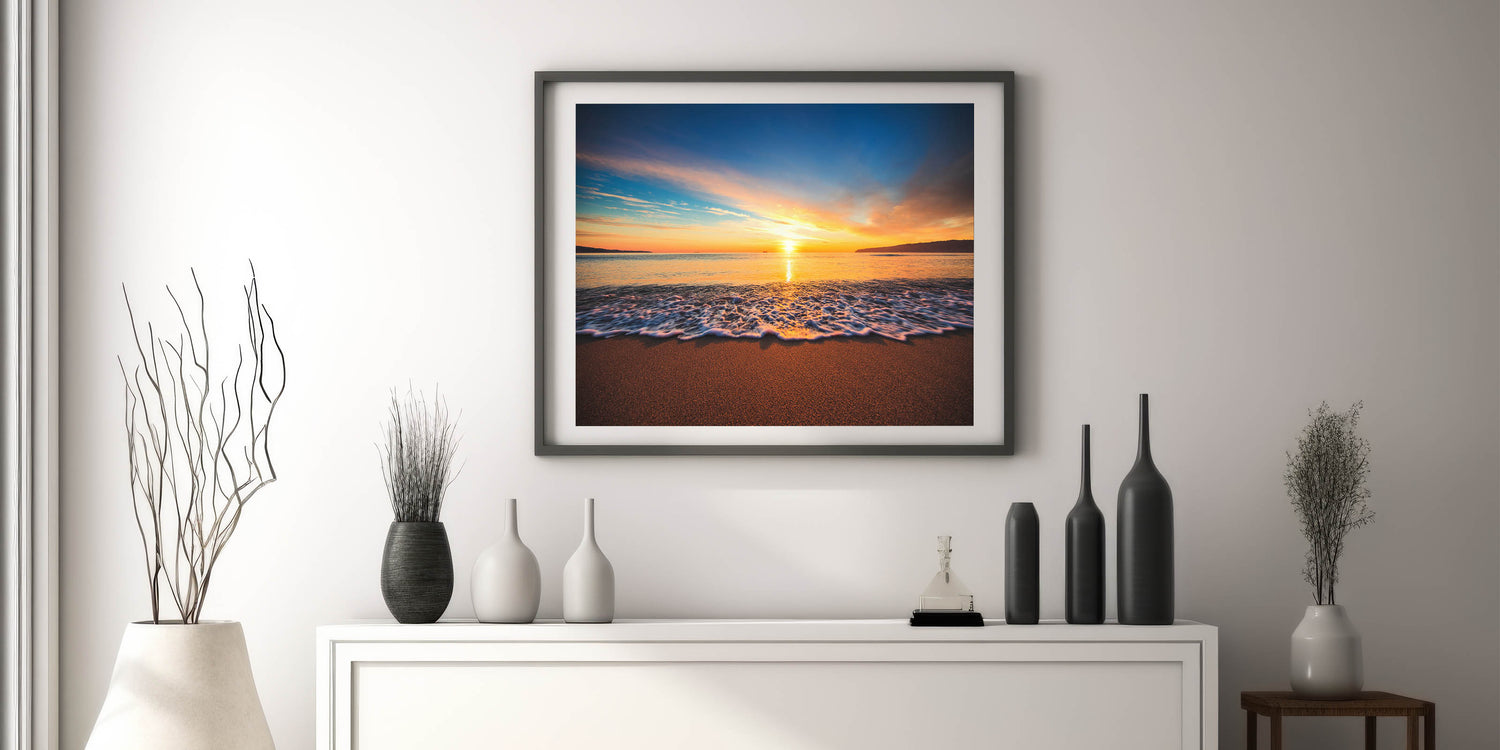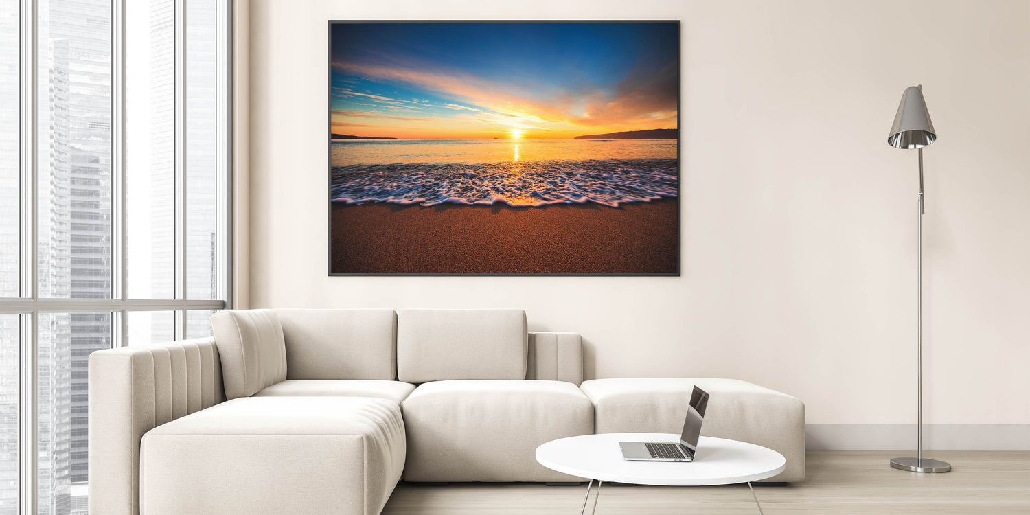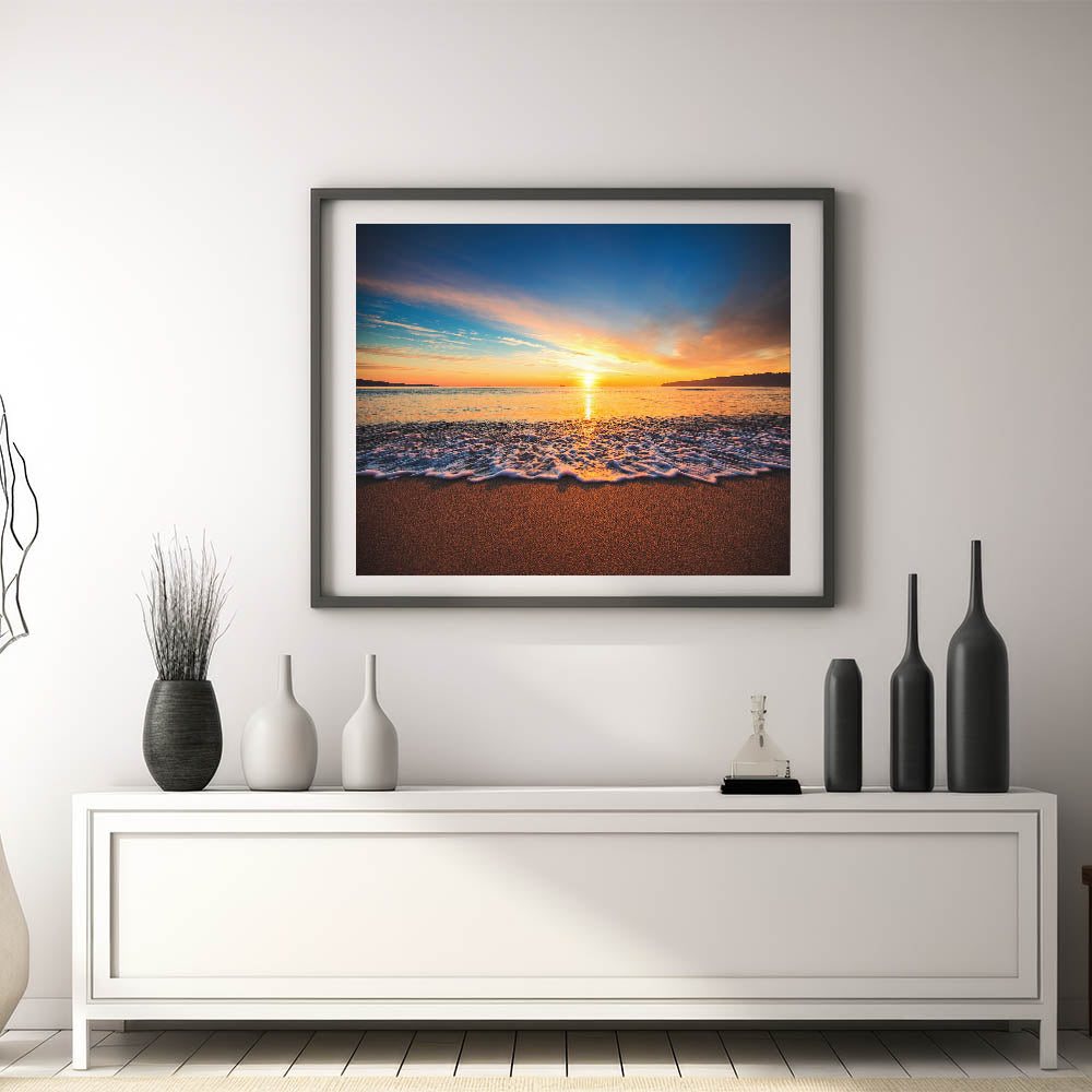 Capture the breathtaking beauty of a Hawaiian sunset with this stunning Oahu Nature Art, featuring the serene glow of the sun as it dips below the horizon. The soft waves roll gently onto the sandy shore, illuminated by vibrant hues of gold, orange, and blue. This high-quality Oahu Art is perfect for bringing a touch of natural beauty and tranquility into your home, ideal for creating a peaceful and calming atmosphere.