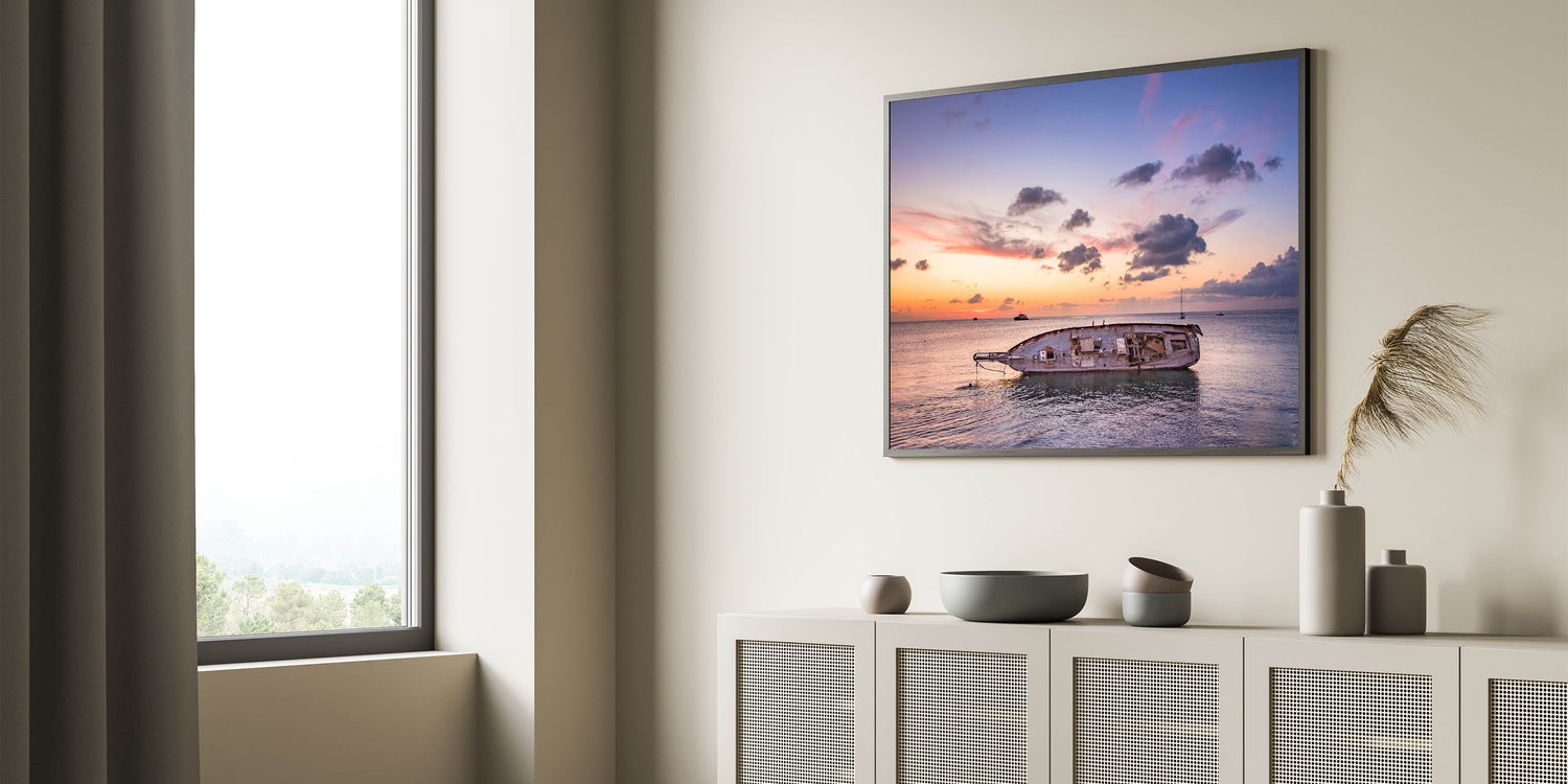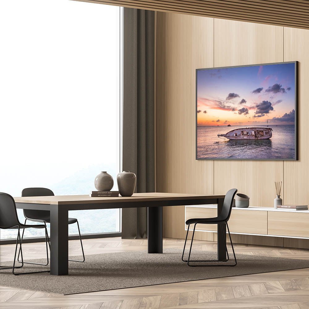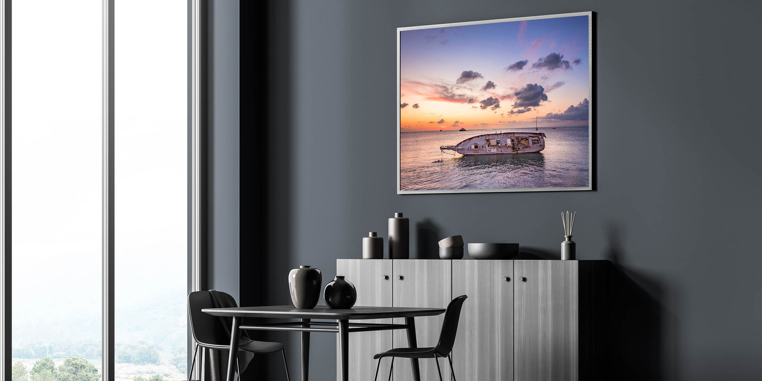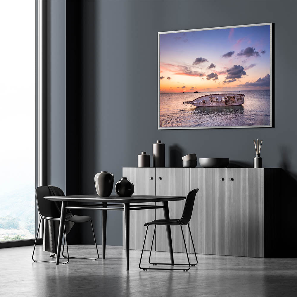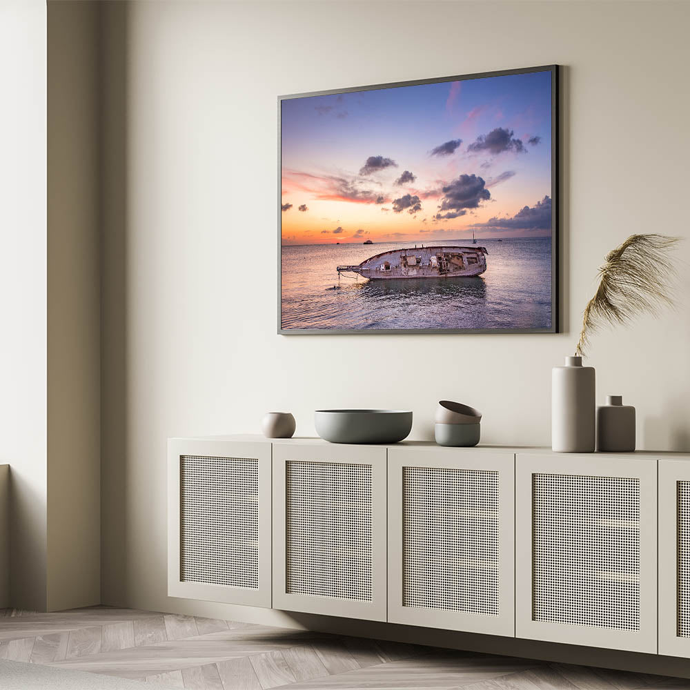 Bring the tranquil beauty of Oaxaca's coastline into your space with this stunning seascape wall art. Capturing the peaceful moment of a sunset over the calm ocean, this piece showcases the remnants of an old boat floating in the water, evoking a sense of nostalgia and serenity. The warm hues of the sunset blend harmoniously with the cool tones of the sky, creating a breathtaking contrast that makes this artwork a perfect addition to any space.