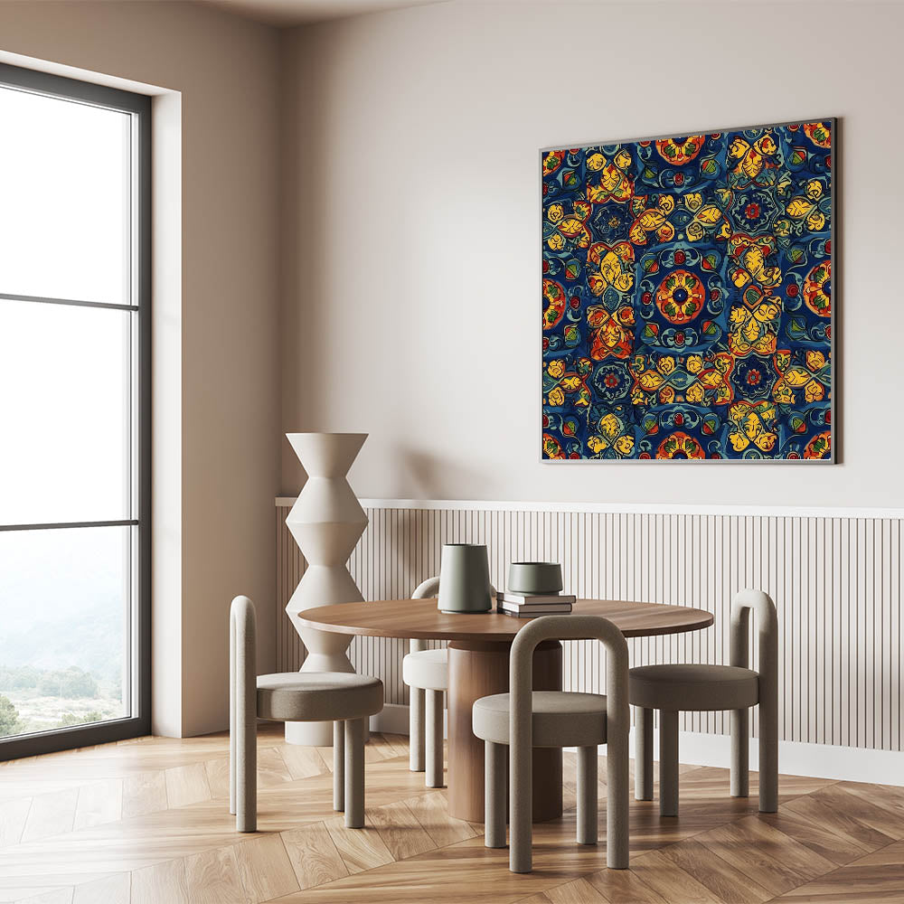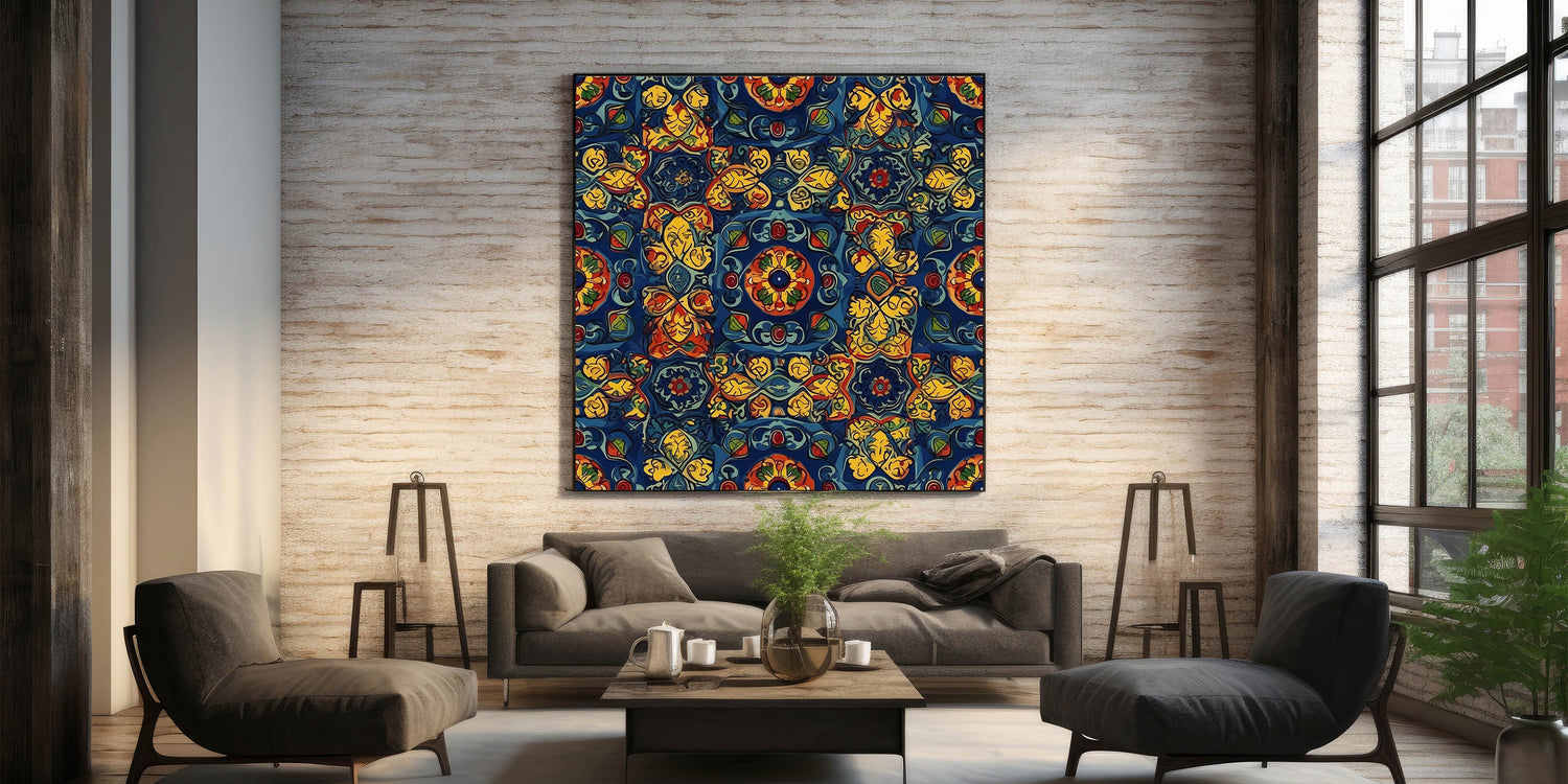 Bring the vibrant artistry of Oaxaca into your home with this stunning wall art featuring an intricate Mexican tile pattern. The rich combination of bold colors, including shades of blue, yellow, orange, and red, creates a captivating visual that adds a cultural flair to any space. Inspired by traditional Oaxacan motifs, this artwork highlights the craftsmanship and attention to detail that is characteristic of Mexican decorative arts.