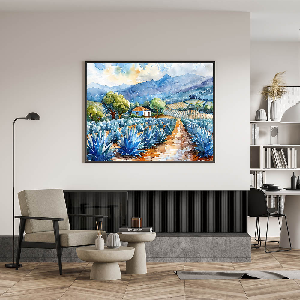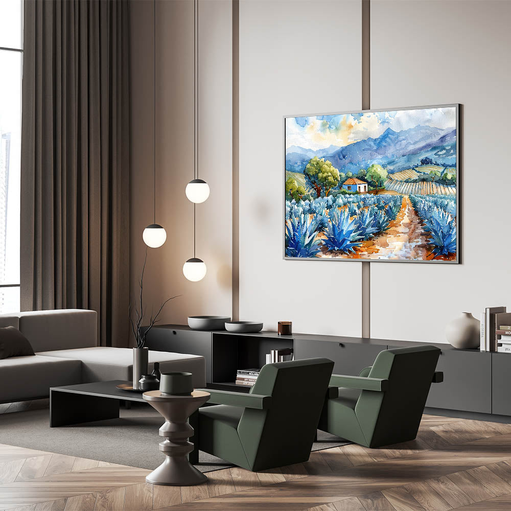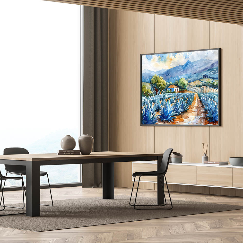 Oaxaca Wall Art – Tranquil Agave Fields and Mountains in Watercolor Art