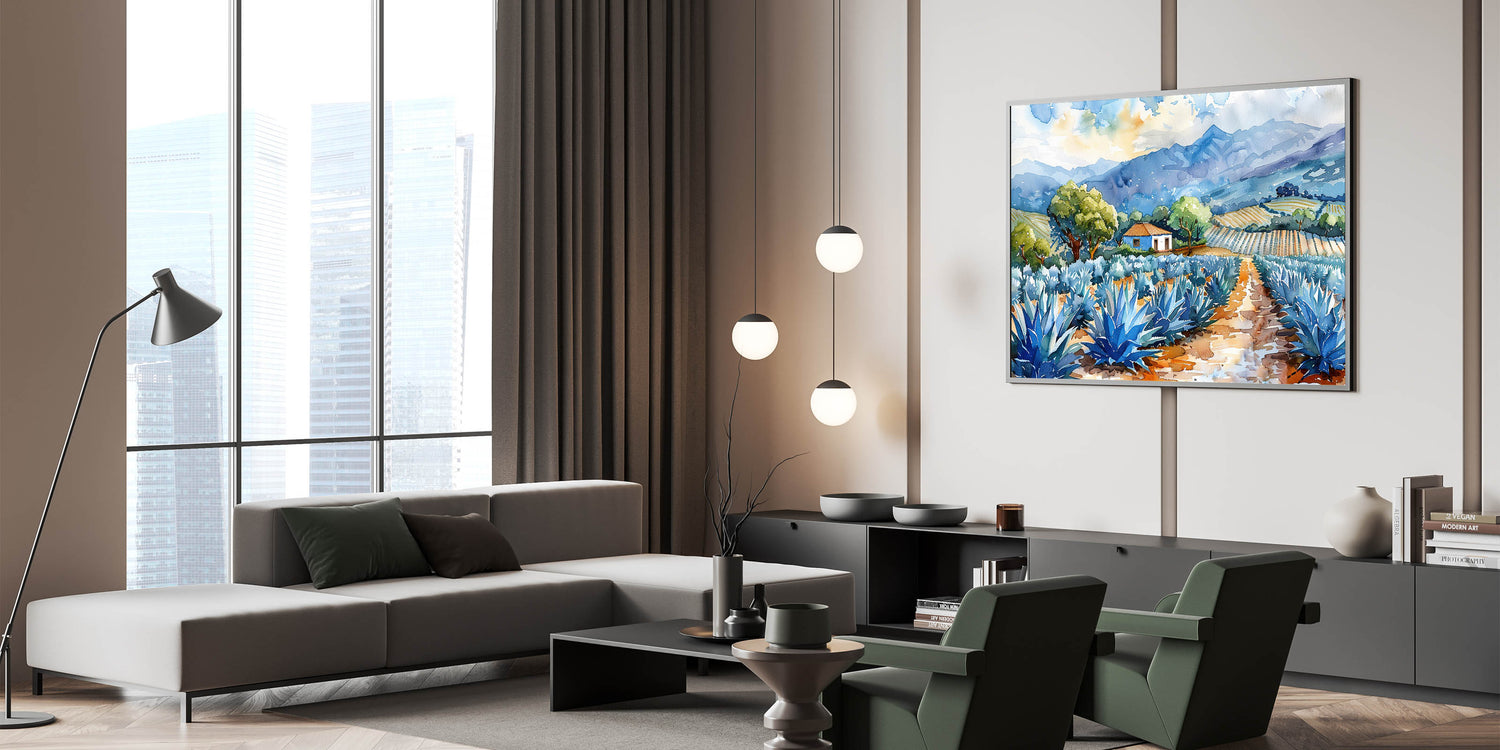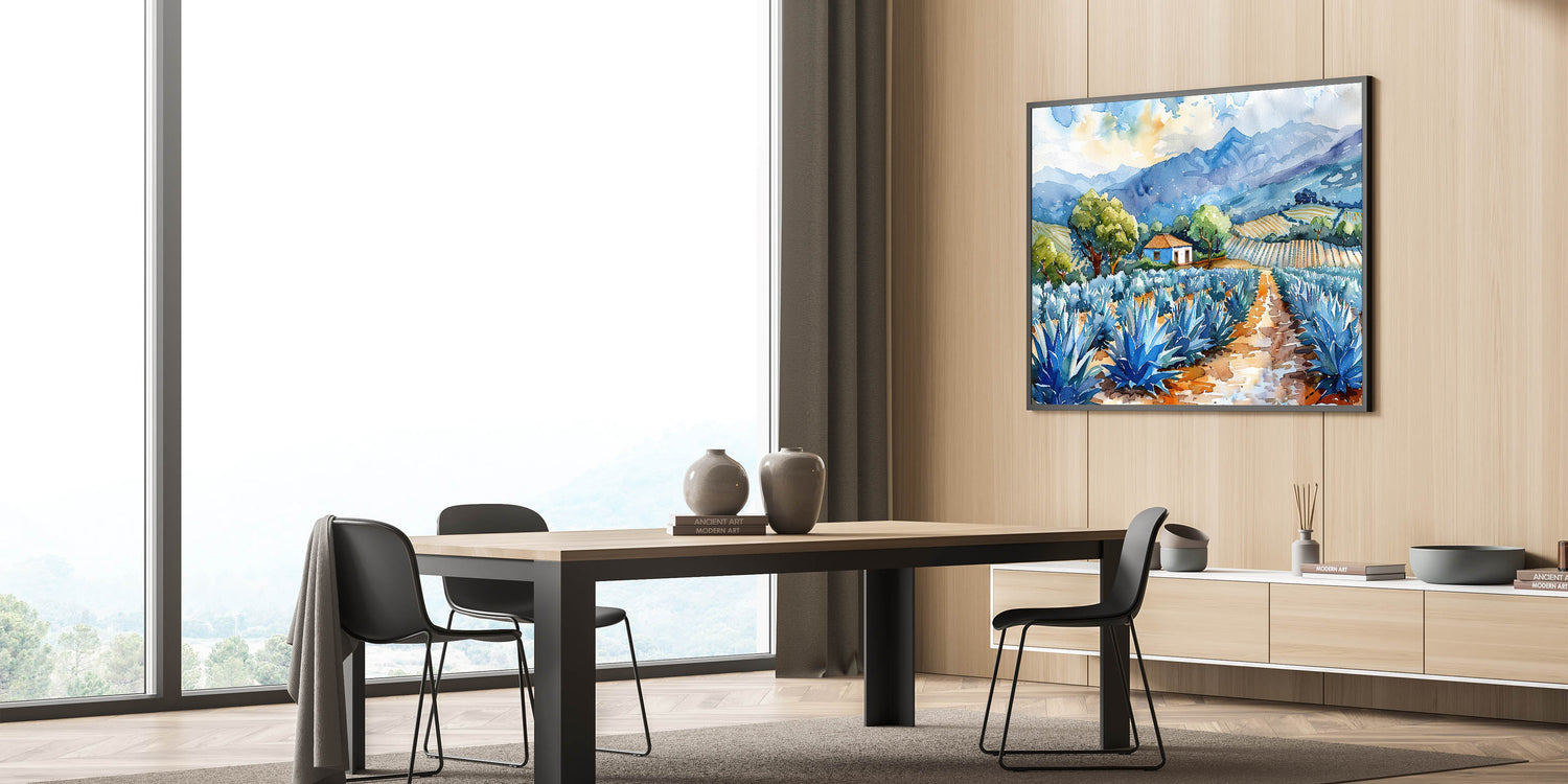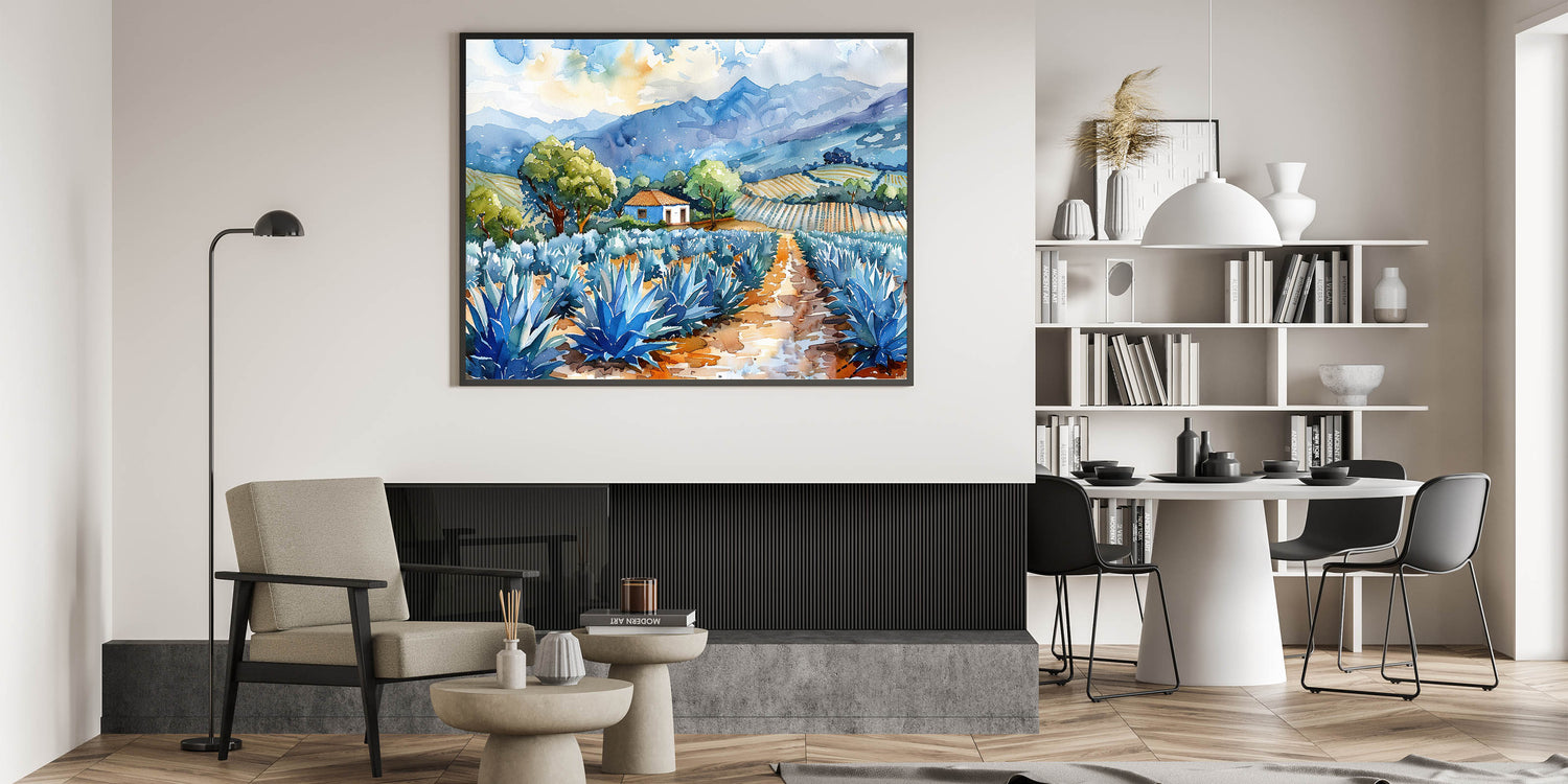 Oaxaca Wall Art – Tranquil Agave Fields and Mountains in Watercolor Art