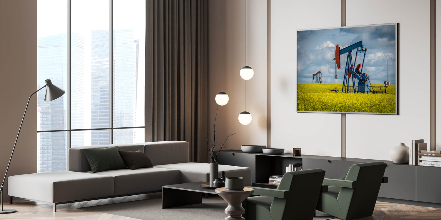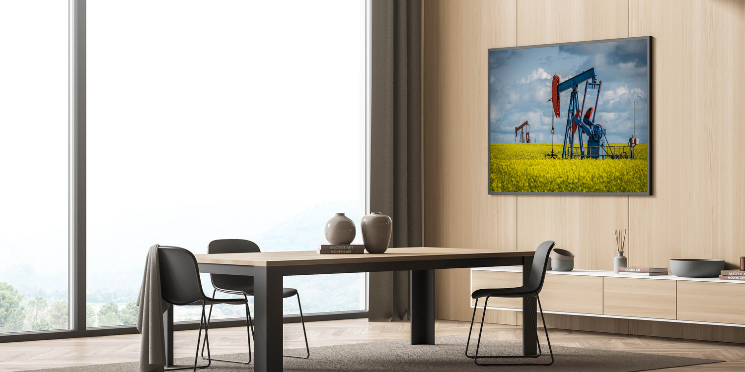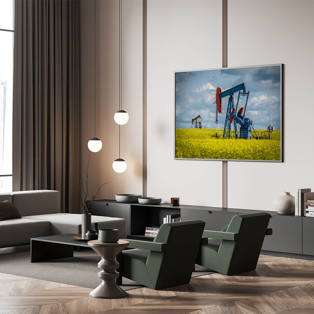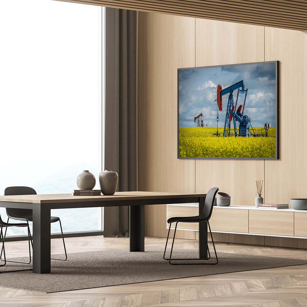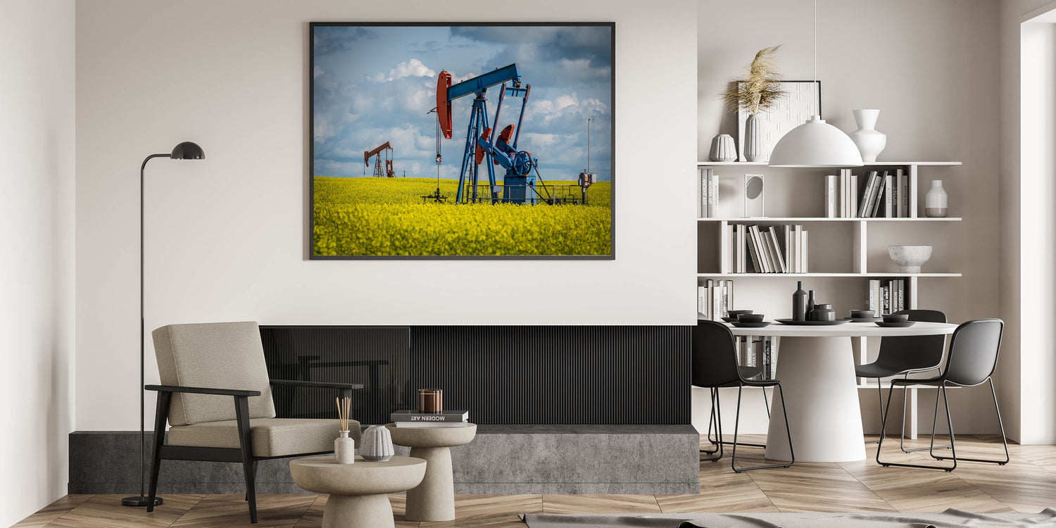 - High-quality Saskatchewan prints showcasing vibrant yellow canola fields and industrial pumpjacks.