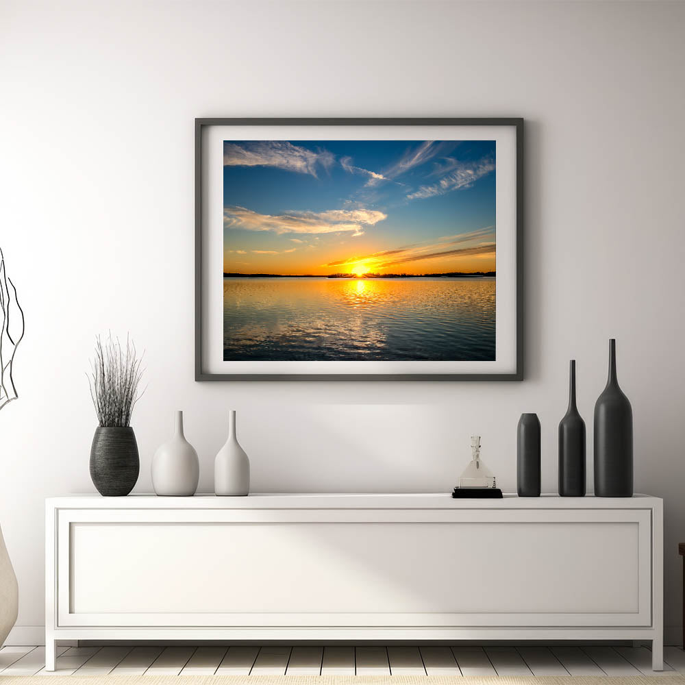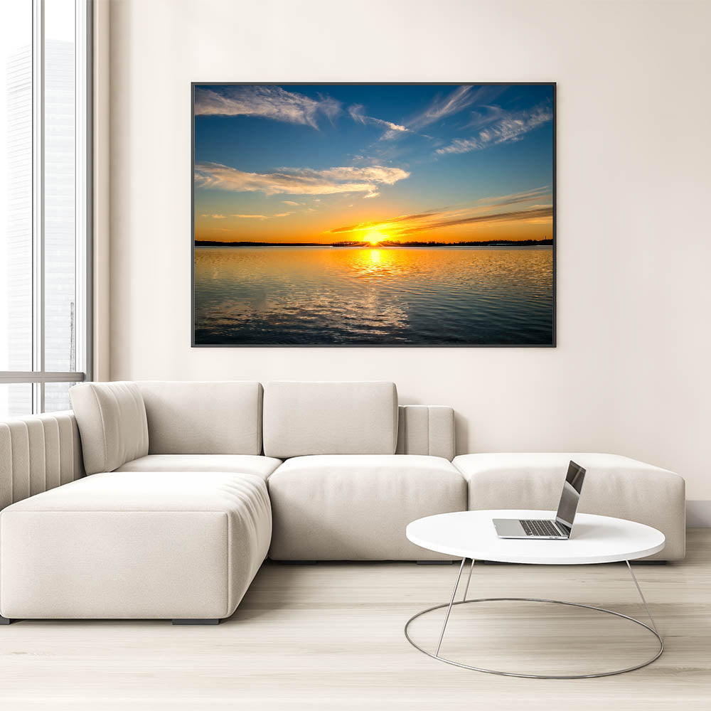 Capture the radiant beauty of an Oklahoma sunset with this stunning wall art featuring the vibrant colors of the sun dipping below the horizon over a peaceful lake. The rich golden hues and soft blues in the sky reflect off the calm waters, creating a mesmerizing and tranquil scene. This beautiful piece of Oklahoma scenic art is available in various formats, including stretched canvas, framed prints, and acrylic glass, making it the perfect addition to any living room, bedroom, or office.