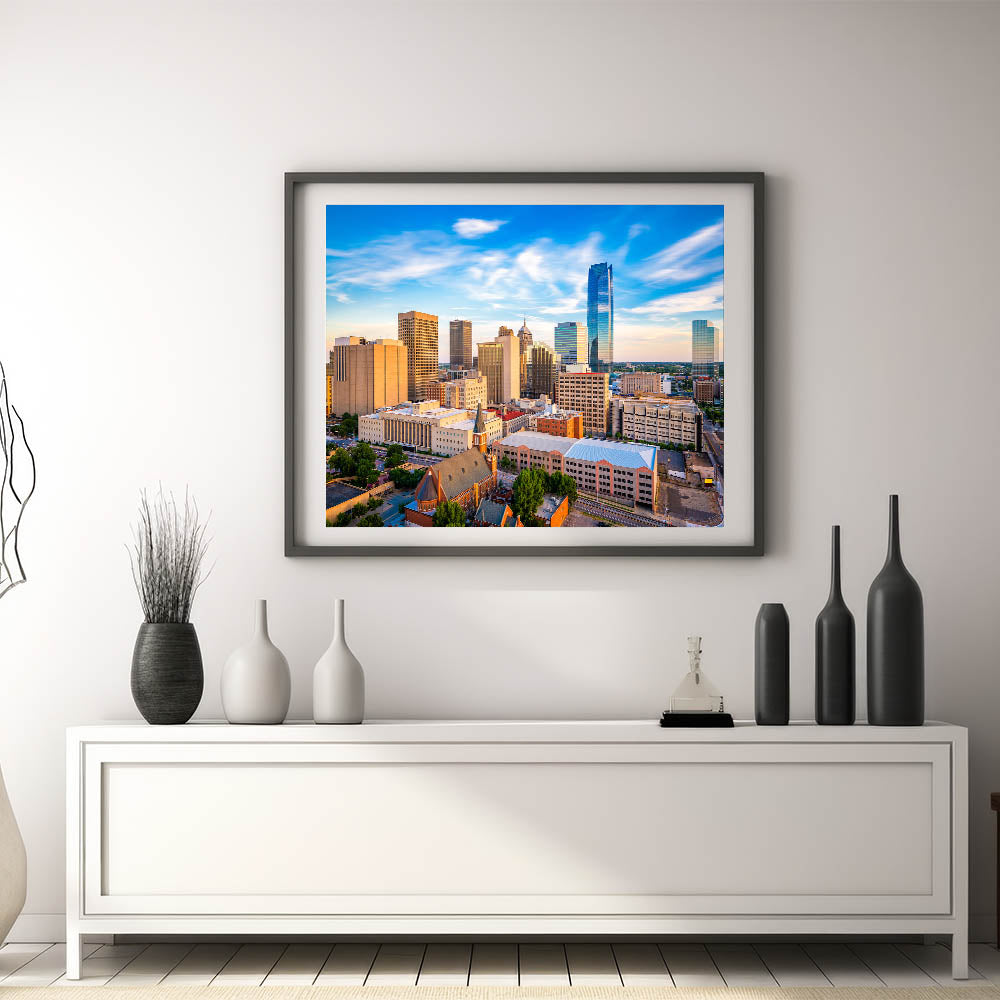 - Beautiful Oklahoma skyline art capturing the modern architecture of downtown Oklahoma City