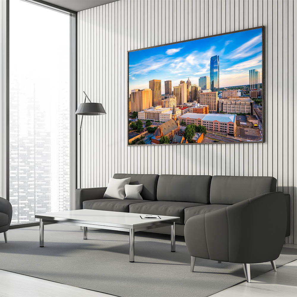 Elevate your space with the vibrant energy of Oklahoma City’s skyline. This custom-framed Oklahoma art piece will add a modern, urban touch to any room while celebrating the state’s capital city.