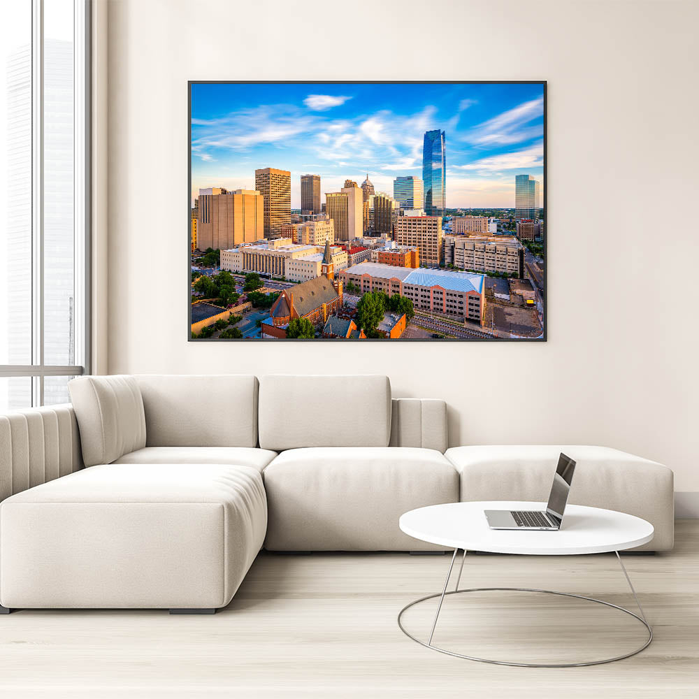 Showcase the energy and modern beauty of Oklahoma City with this vibrant skyline wall art. Captured in stunning detail, this artwork highlights the iconic downtown skyline, featuring its towering buildings and unique architecture under a bright blue sky. Perfect for city lovers or those looking to bring a modern and sophisticated touch to their home or office, this Oklahoma skyline art is available in multiple formats, including stretched canvas, framed prints, and acrylic glass. Whether you're an Oklahoma native or a visitor who loves the city's charm, this artwork is a timeless addition to any decor.