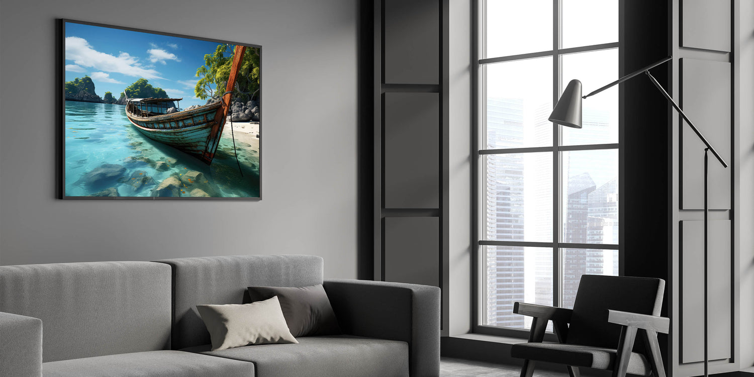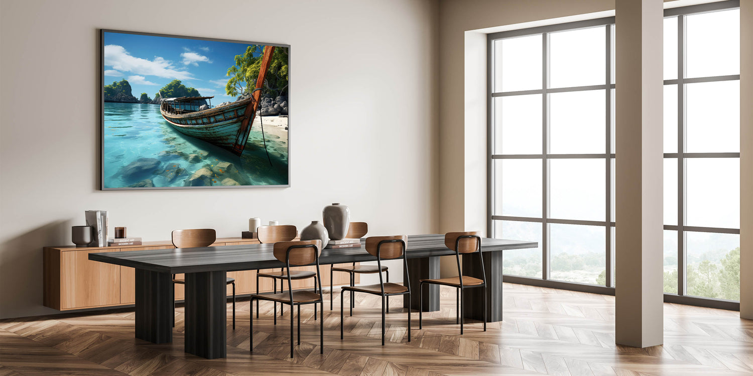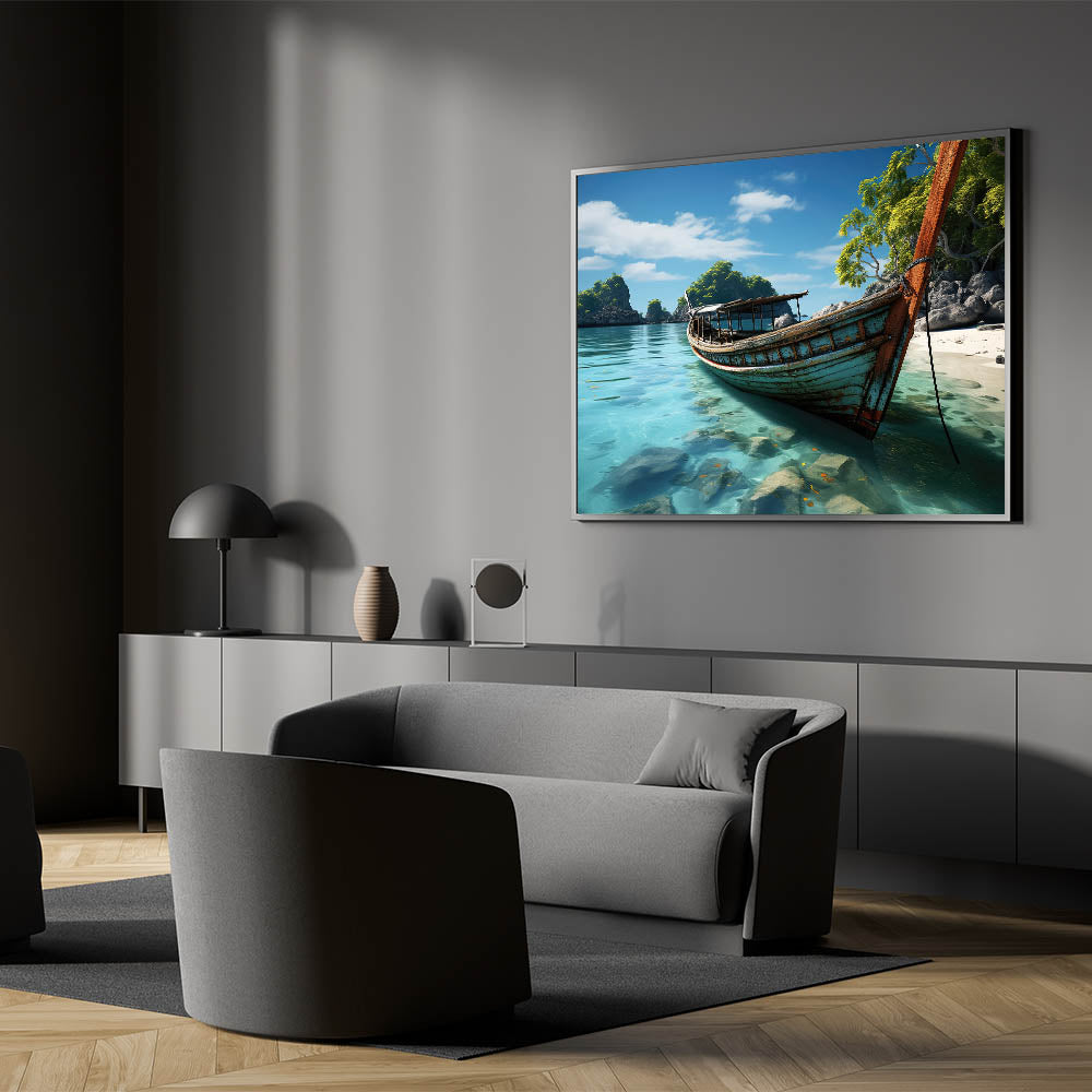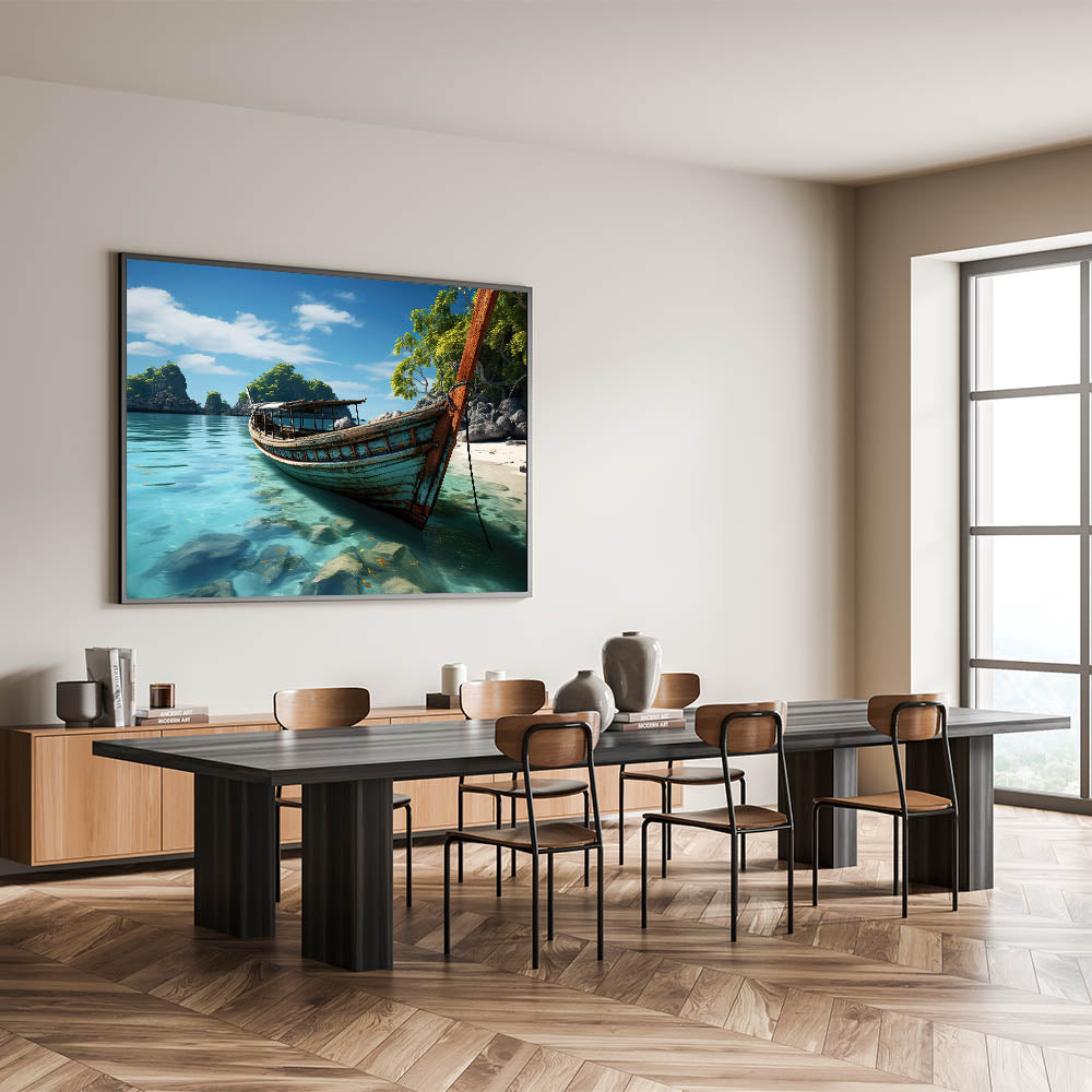 Discover the untouched charm of Thailand with our "Old Thai Boat on Tranquil Beach - Tropical Canvas Art." This artwork captures a peaceful moment on a secluded Thai beach, where a time-worn boat rests on the crystal-clear waters, surrounded by lush tropical greenery and dramatic rock formations.