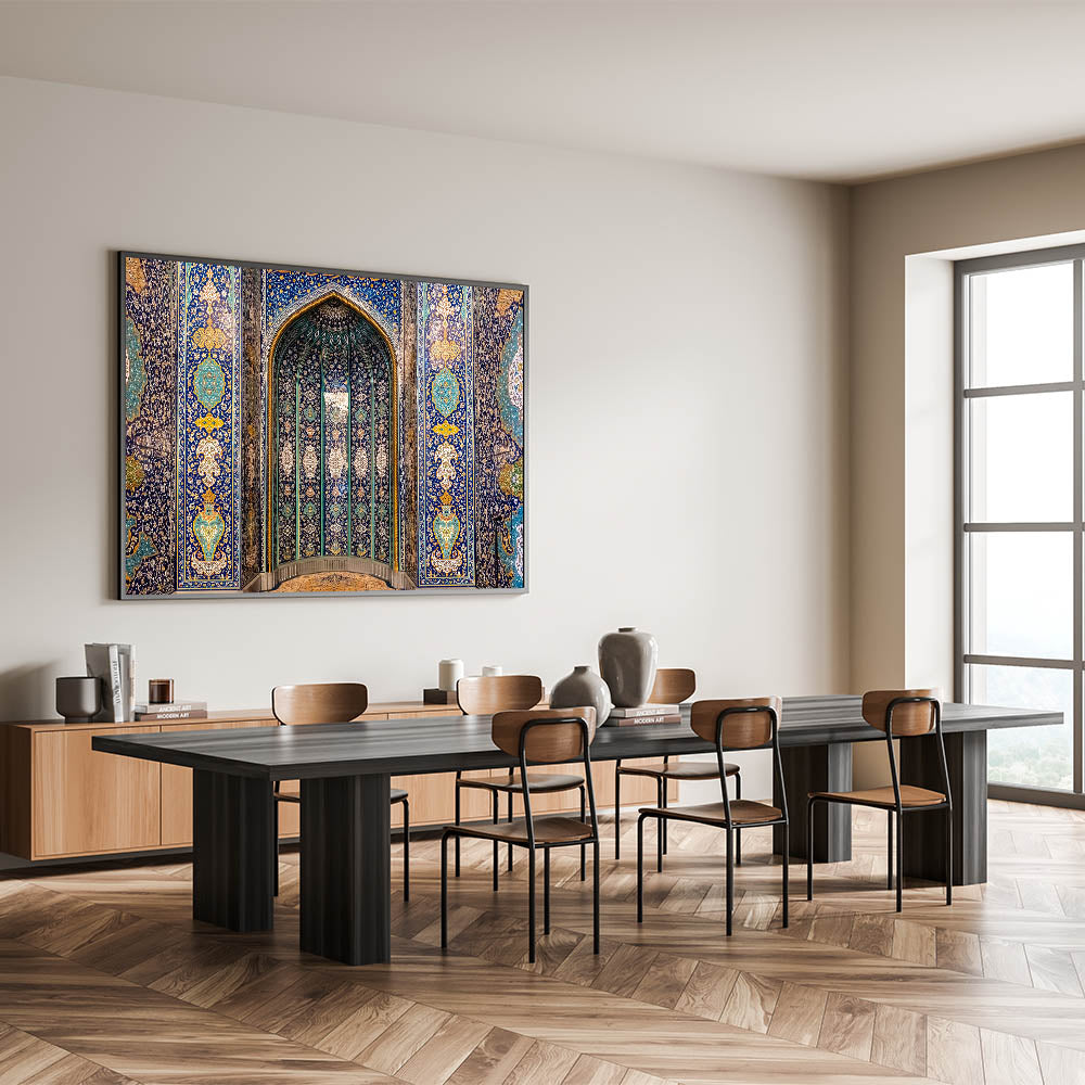 Enhance your home with the intricate beauty of this Oman wall art, showcasing the vibrant tilework and decorative motifs found in traditional Islamic architecture. This high-quality Oman wall art features ornate patterns in rich blues, greens, and golds, creating a striking and elegant piece that brings the craftsmanship of the Middle East into your space.