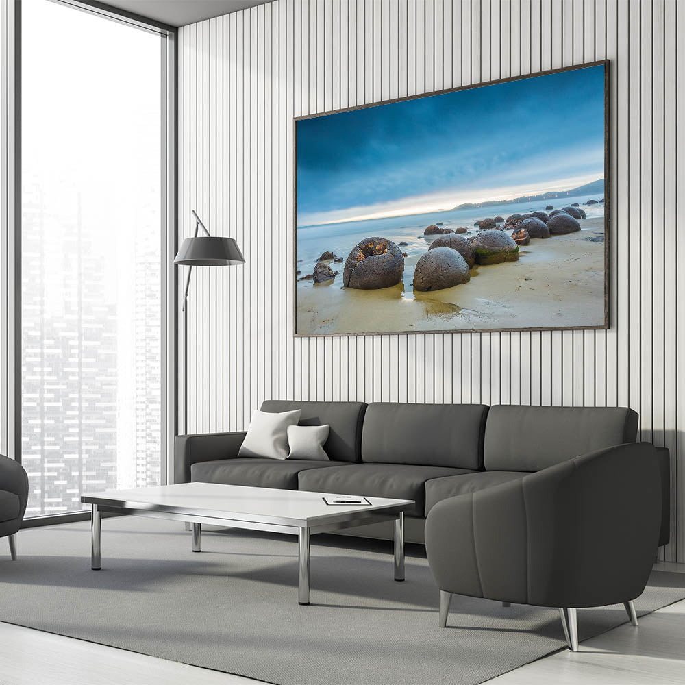 Transform your living space with the unique beauty of the Moeraki Boulders, captured in this breathtaking Otago wall art. This coastal scene highlights the mystical, spherical boulders scattered along the shore, contrasting against the soft blues of the sky and ocean. It's the perfect piece for those who love natural wonders and New Zealand scenery.