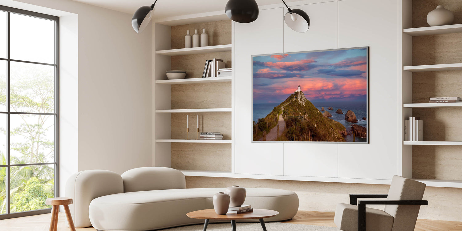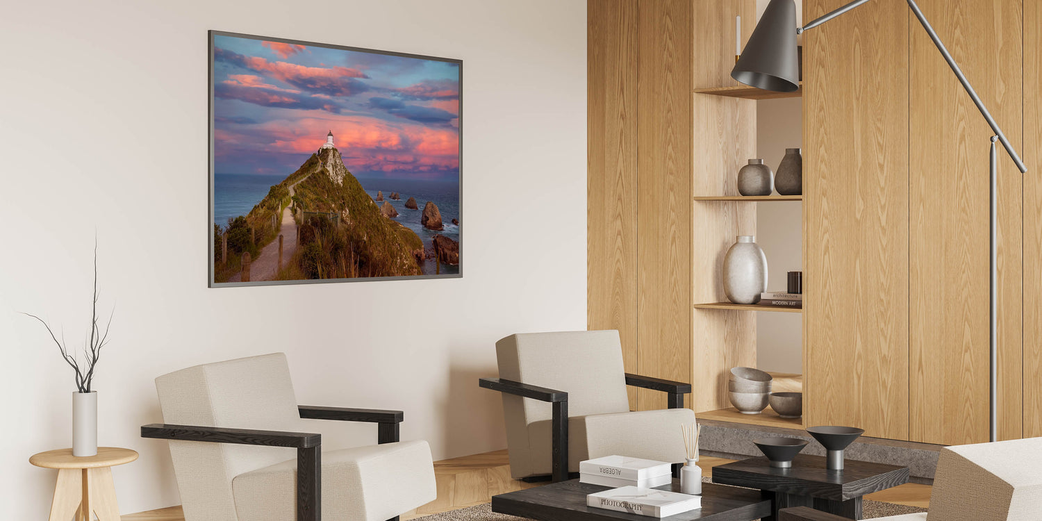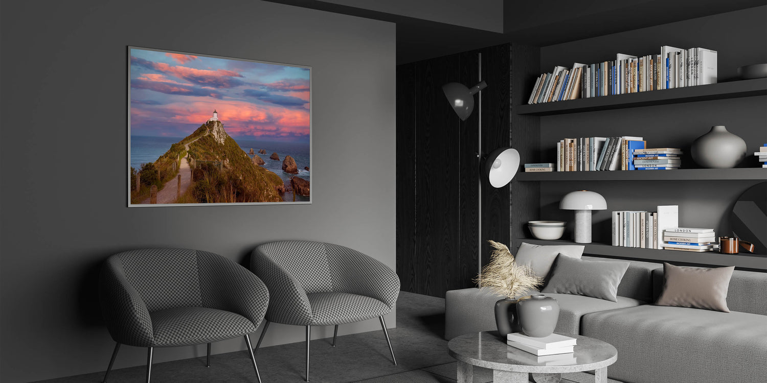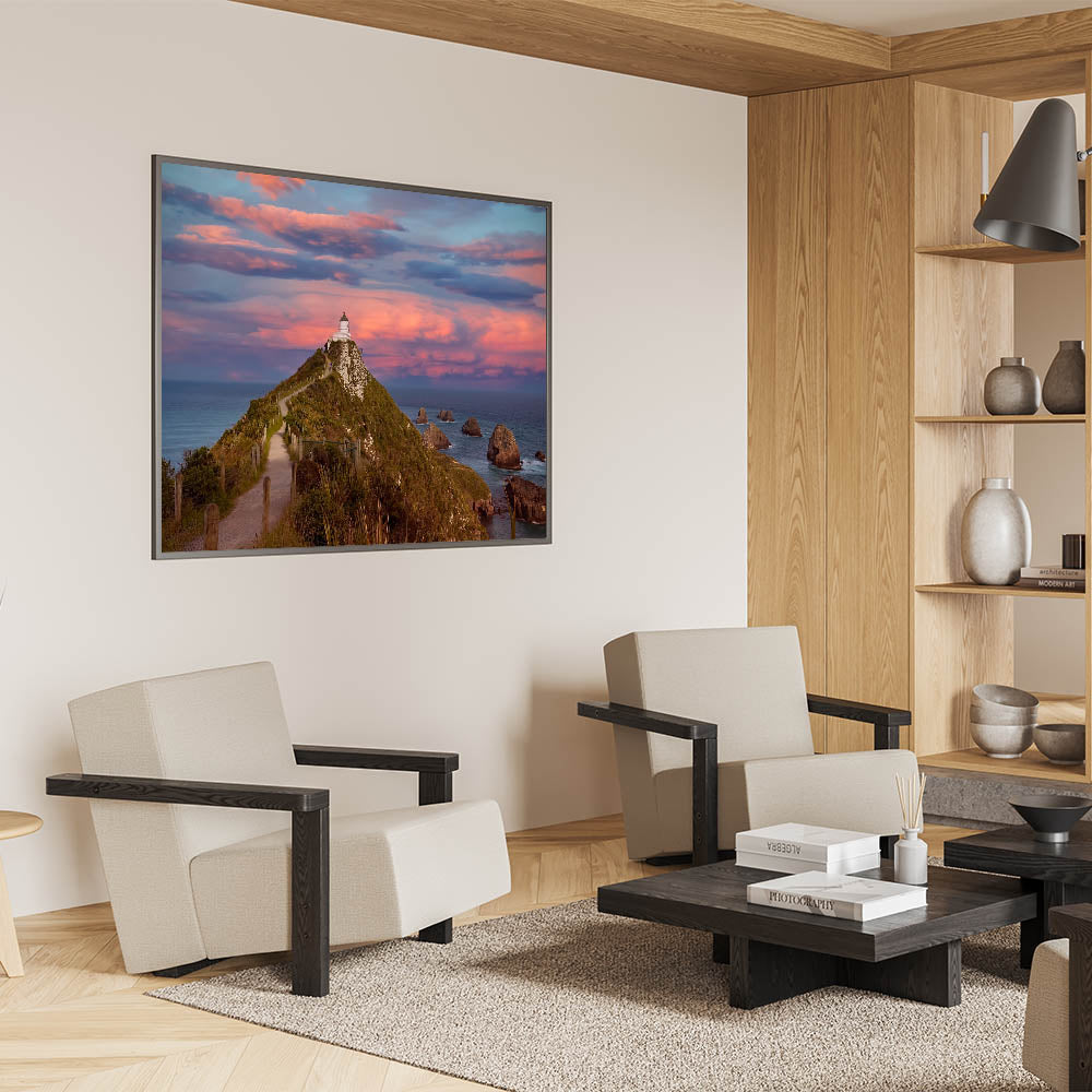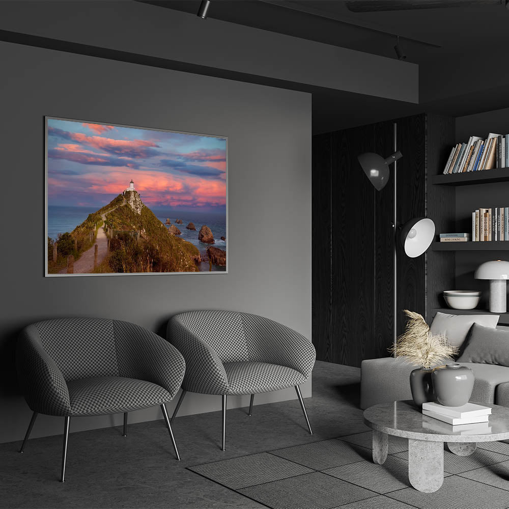 Capture the dramatic beauty of New Zealand's Otago Peninsula with this stunning print of a lighthouse perched on a rugged hill, set against a breathtaking sunset sky. The vibrant colors of the sky, ranging from soft pinks to deep purples, create a striking contrast with the deep blues of the ocean, making this piece an ideal focal point for any room. This Otago art print beautifully encapsulates the natural wonder of New Zealand's coastal scenery.