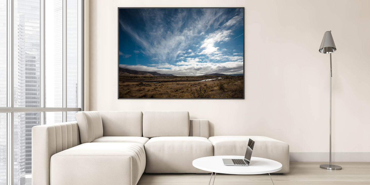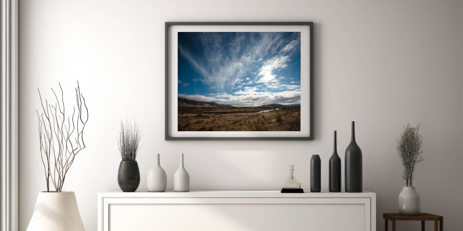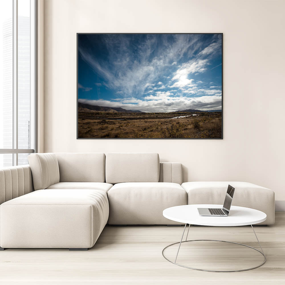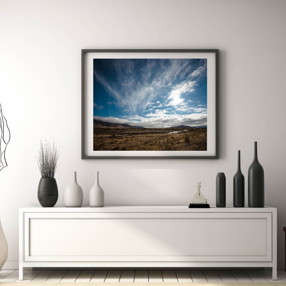 Immerse yourself in the vast beauty of Central Otago with this stunning landscape wall art. Featuring the wide-open skies and rolling hills of Otago, this artwork captures the serene expanse of nature. The soft clouds against the deep blue sky create a feeling of tranquility and endless horizon, making this piece a perfect addition to any space where you want to evoke a sense of calm and nature’s beauty.