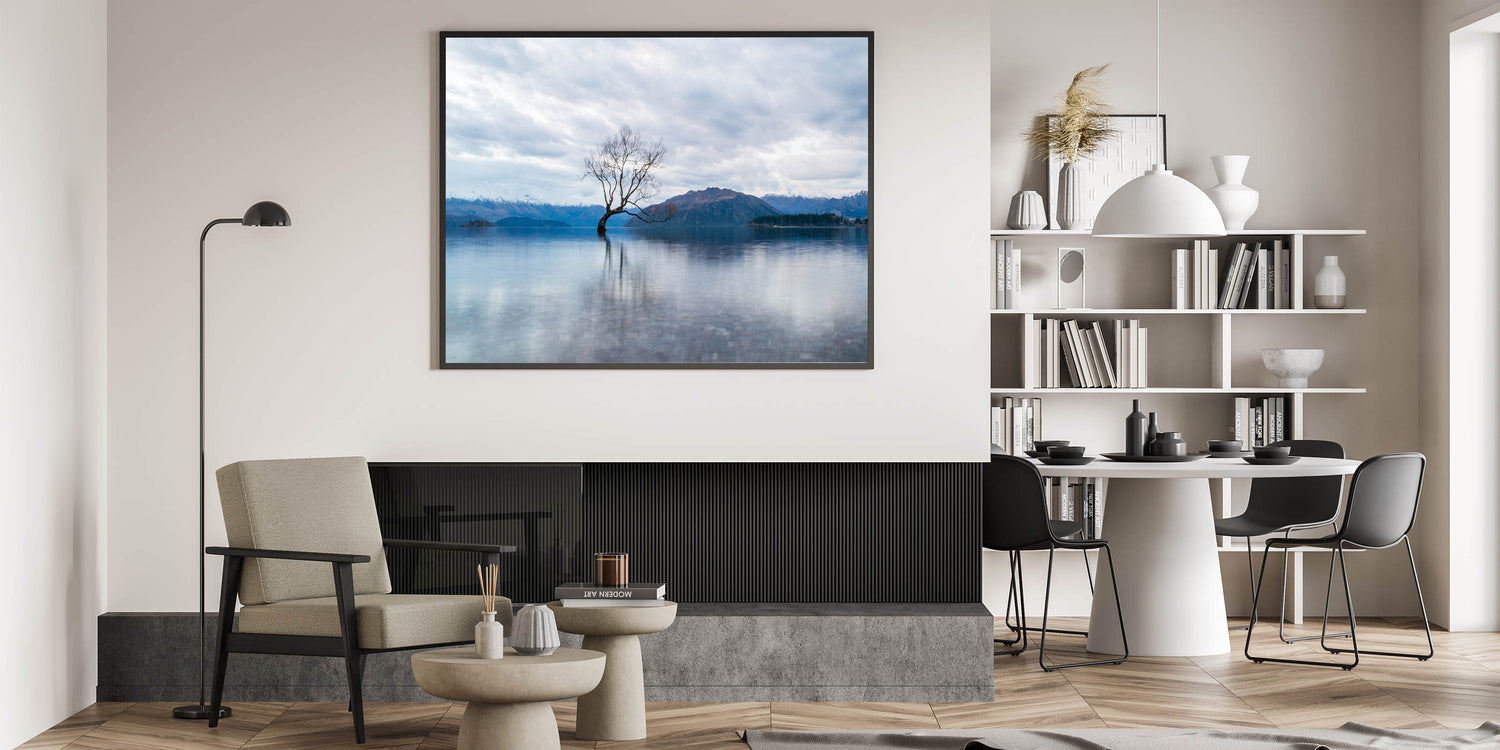 Embrace the quiet beauty of Lake Wanaka with this stunning Otago wall art featuring the iconic Wanaka tree. This peaceful scene showcases the solitary tree standing in the calm waters, backed by the misty mountains and a soft, moody sky. The delicate balance between light and shadow gives this photograph a timeless feel, perfect for those who appreciate subtle yet impactful New Zealand scenery.