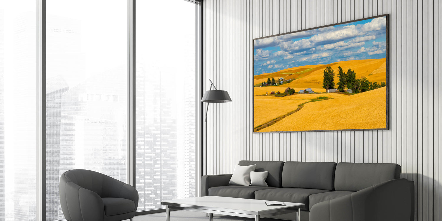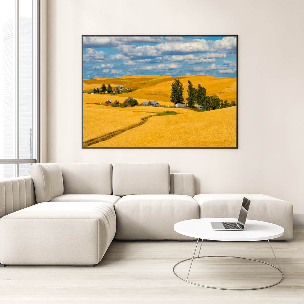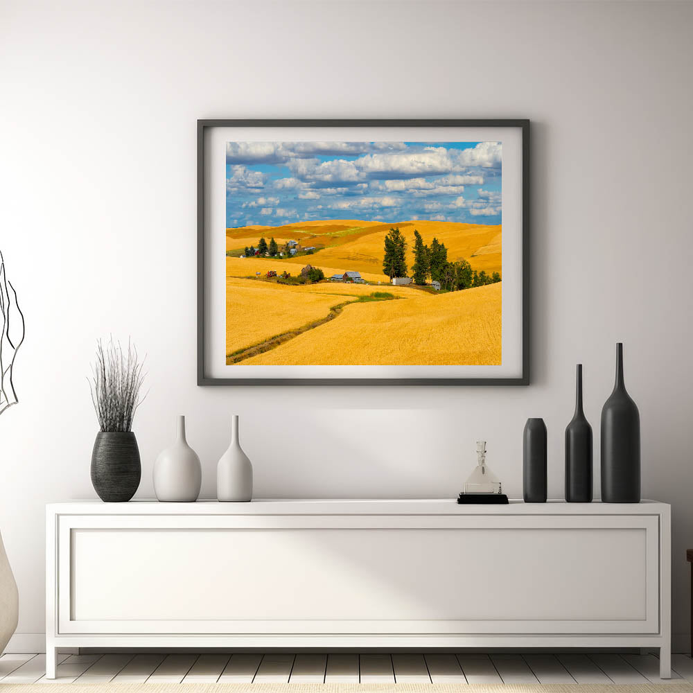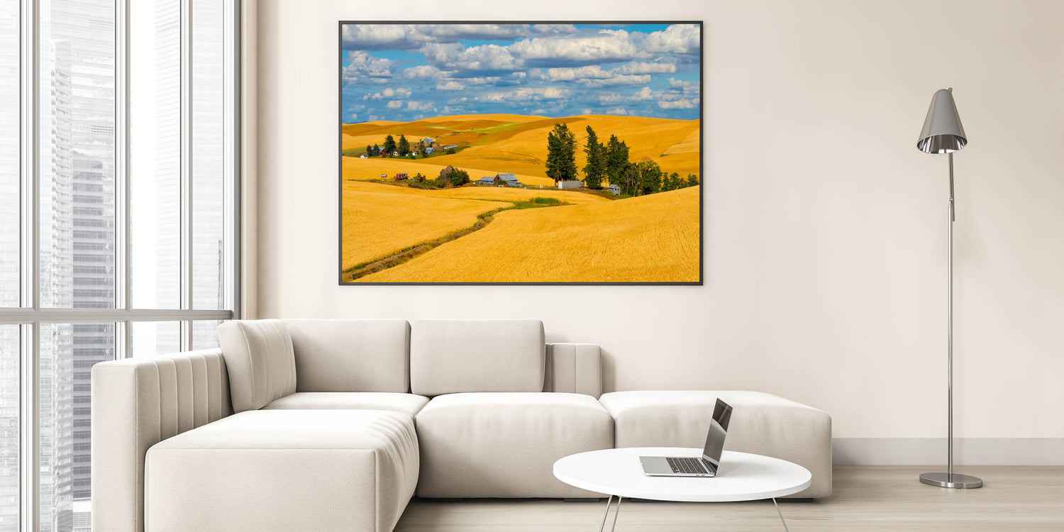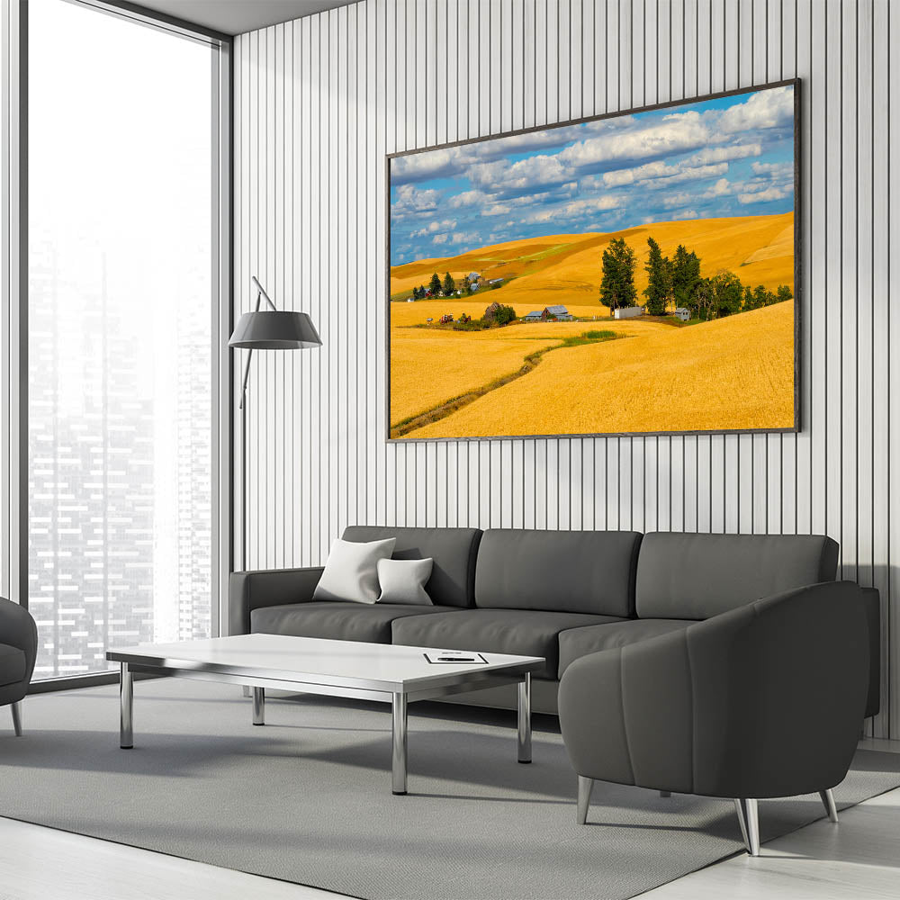 Celebrate the golden beauty of Washington's Palouse region with this stunning artwork, featuring rolling wheat fields and rustic farmhouses under a bright blue sky. This landscape art captures the essence of rural life, with vibrant golden hues and the warm tones of the farmland blending into the horizon. Whether you're a nature enthusiast or simply looking for a captivating piece to enhance your space, this Palouse photography will bring warmth and charm to any room.