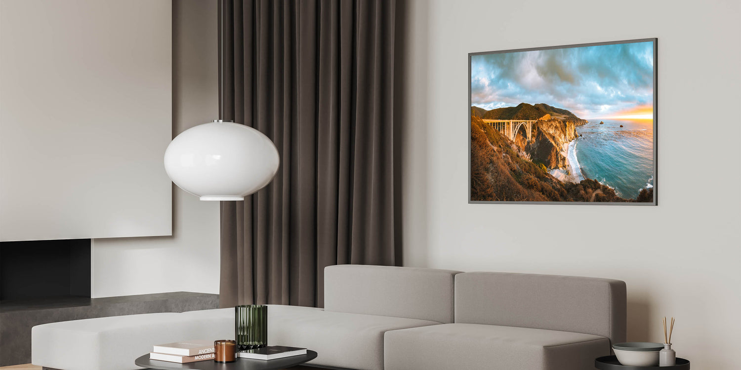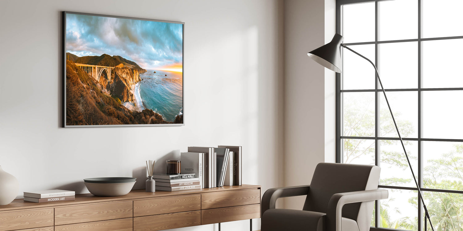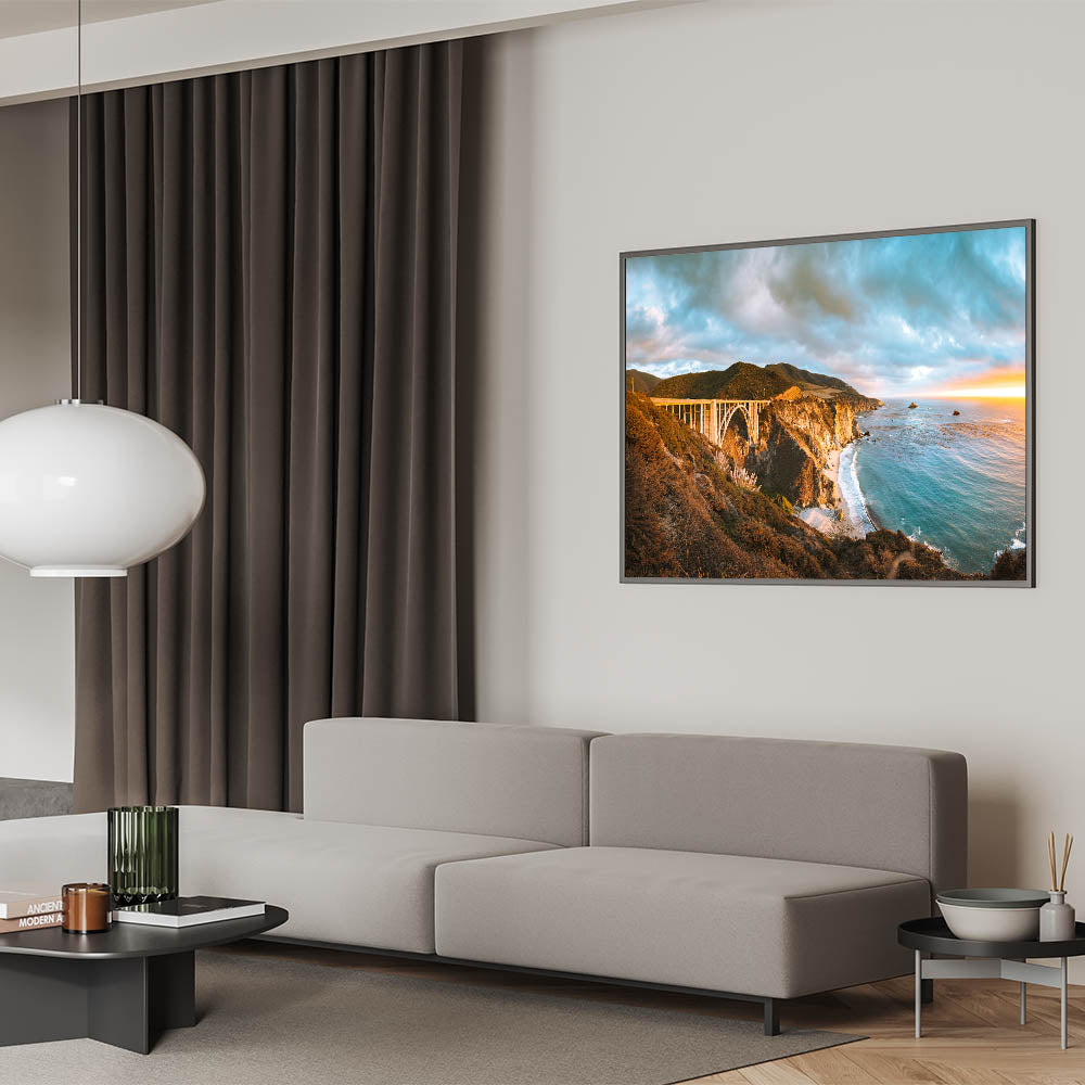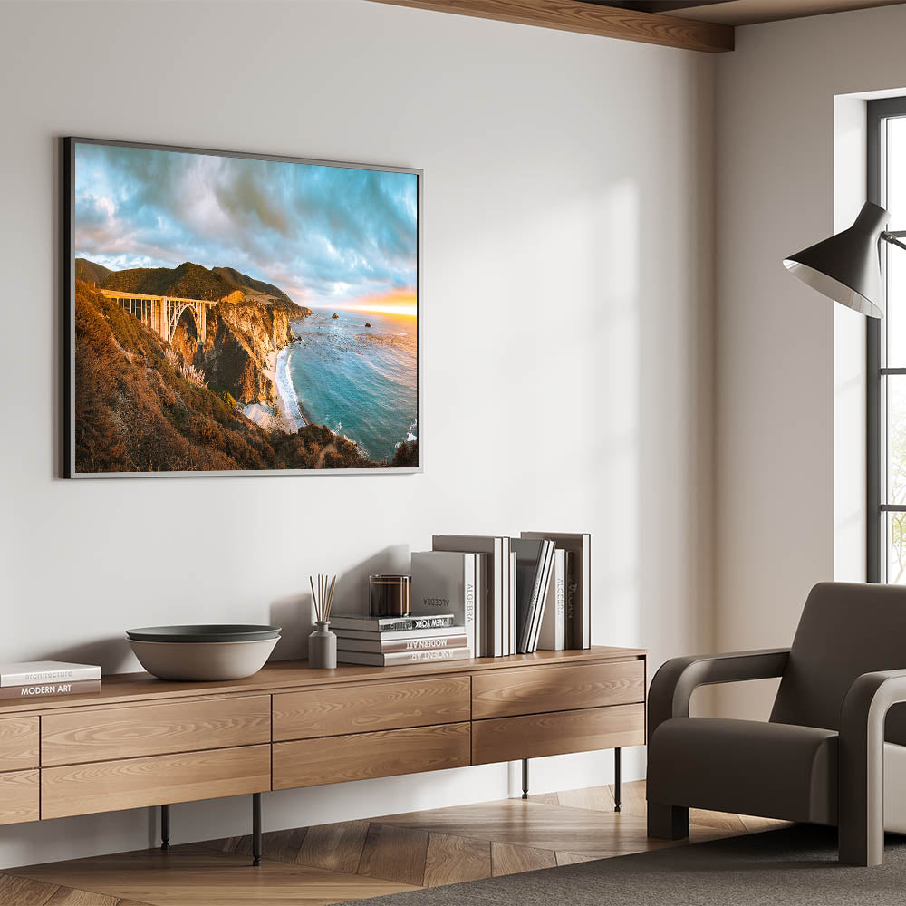 - High-quality scenic artwork showcasing Big Sur’s coastline and Bixby Bridge