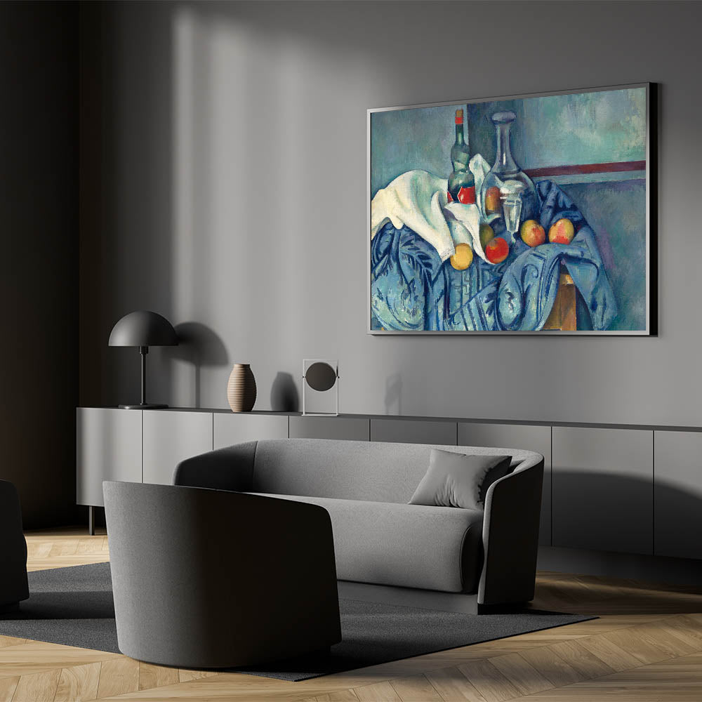 Add timeless elegance to your home with this exquisite reproduction of Paul Cézanne's still life featuring a bottle, fruit, and delicate drapery. The rich textures of the fabric and the reflective quality of the glass are beautifully rendered, showing Cézanne’s skillful handling of light and shadow. The vibrant colors of the fruit contrast with the cool blues and whites of the background, creating a balanced composition that is both serene and dynamic.