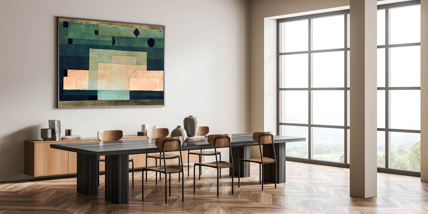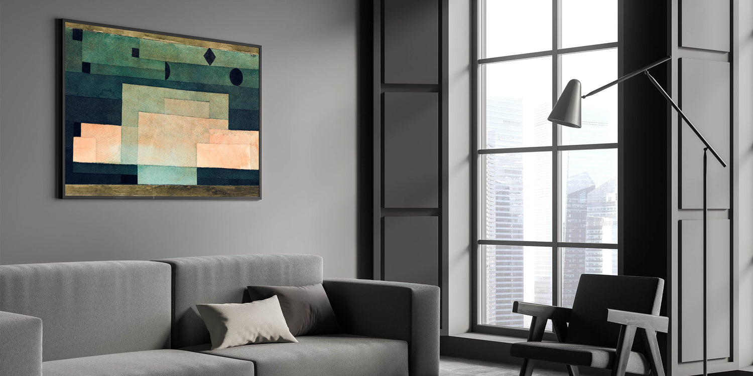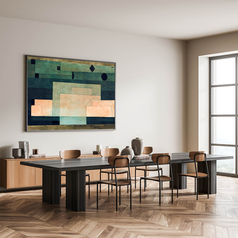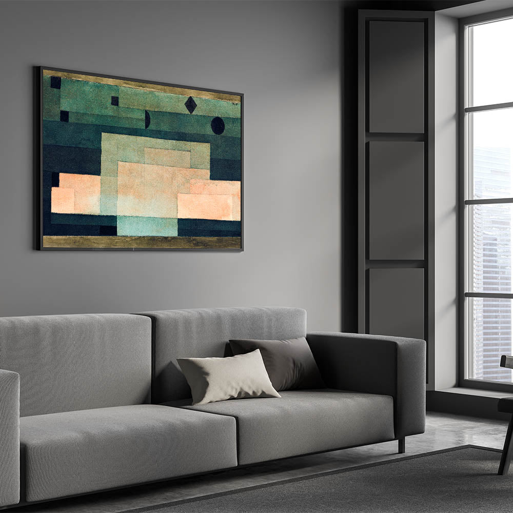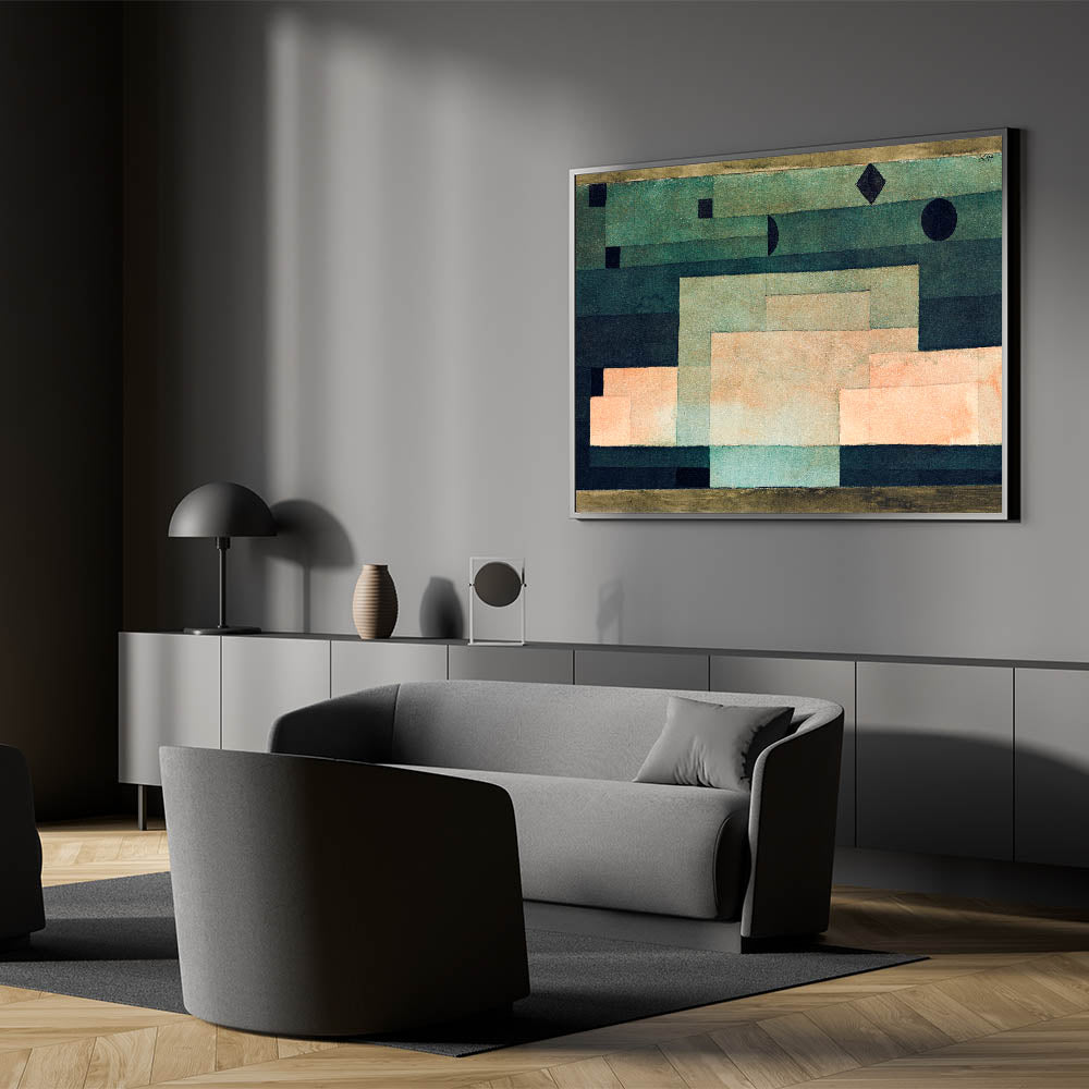Discover the minimalist beauty of Paul Klee's geometric abstraction with this artwork from 1929. Featuring a harmonious blend of warm peach and green tones, Klee skillfully uses clean lines and geometric shapes to create a calming yet thought-provoking composition. This Paul Klee artwork is perfect for those seeking a balance between modernism and abstract art in their decor. The muted, earthy tones will complement any interior, bringing both elegance and an avant-garde edge to your space.