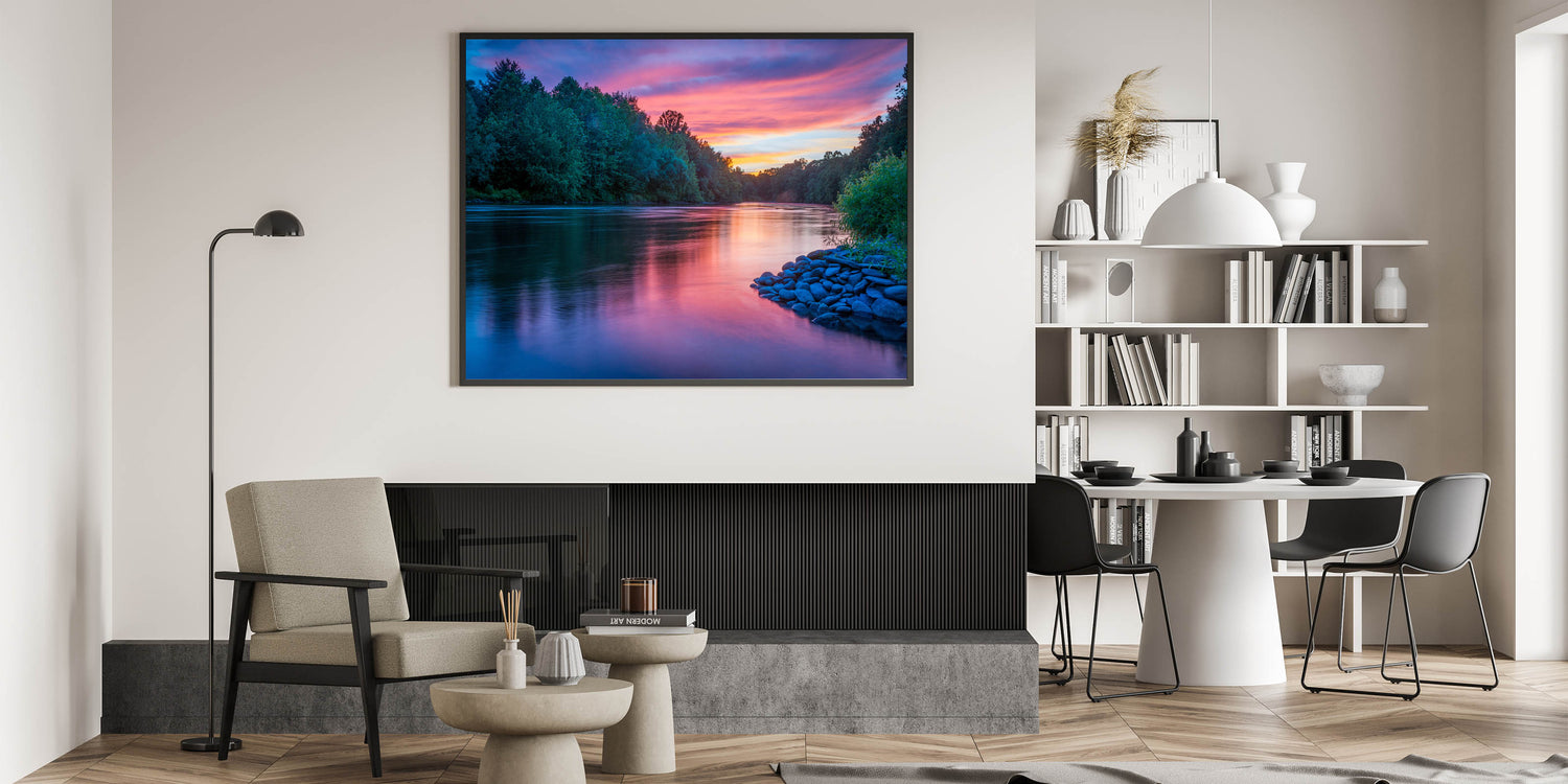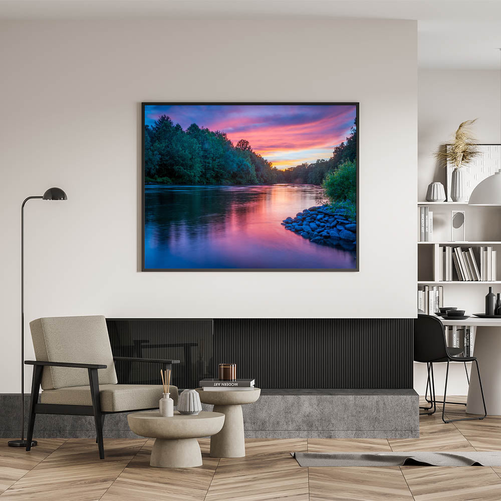 Add a touch of serenity and vibrant color to your space with this beautiful Pennsylvania scenic view featuring a sunset over a peaceful river. This high-quality Pennsylvania canvas art captures the stunning interplay of light as the sky reflects off the calm water, blending hues of pink, purple, and orange. The lush greenery along the riverbank completes the scene, making this artwork a perfect choice for nature lovers and those seeking to bring the beauty of Pennsylvania's landscapes into their home or office.