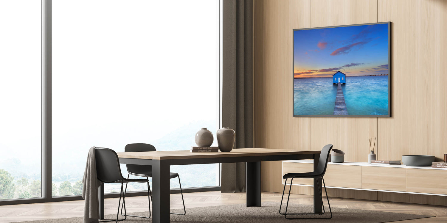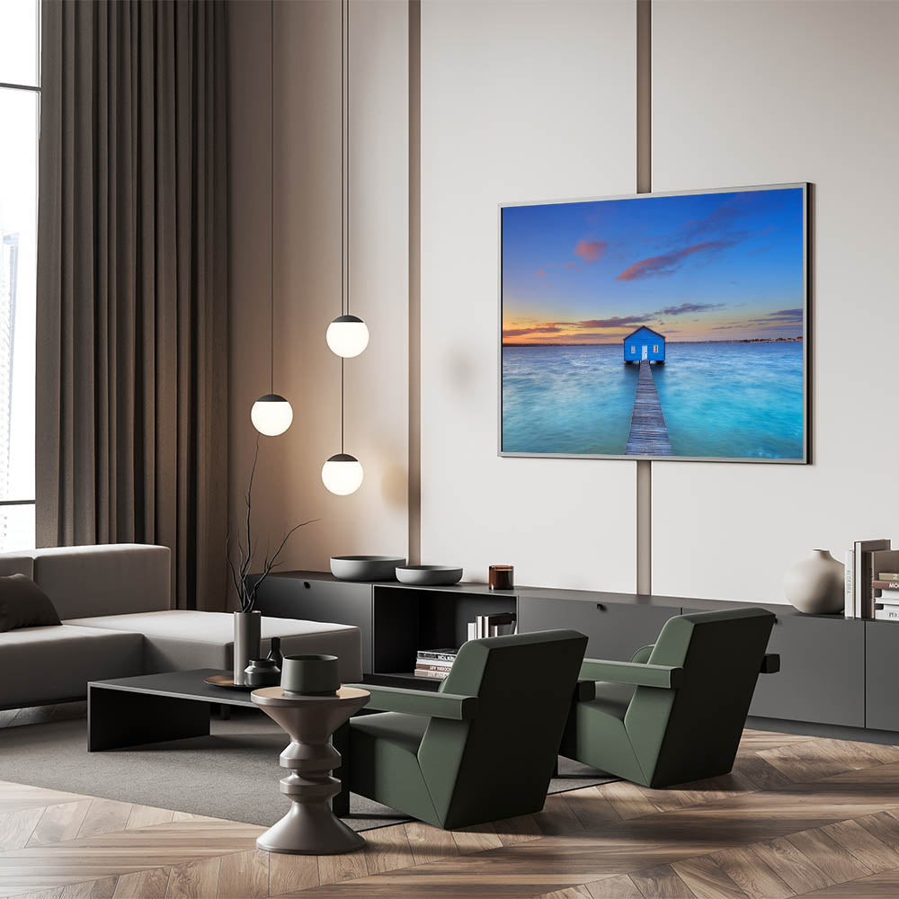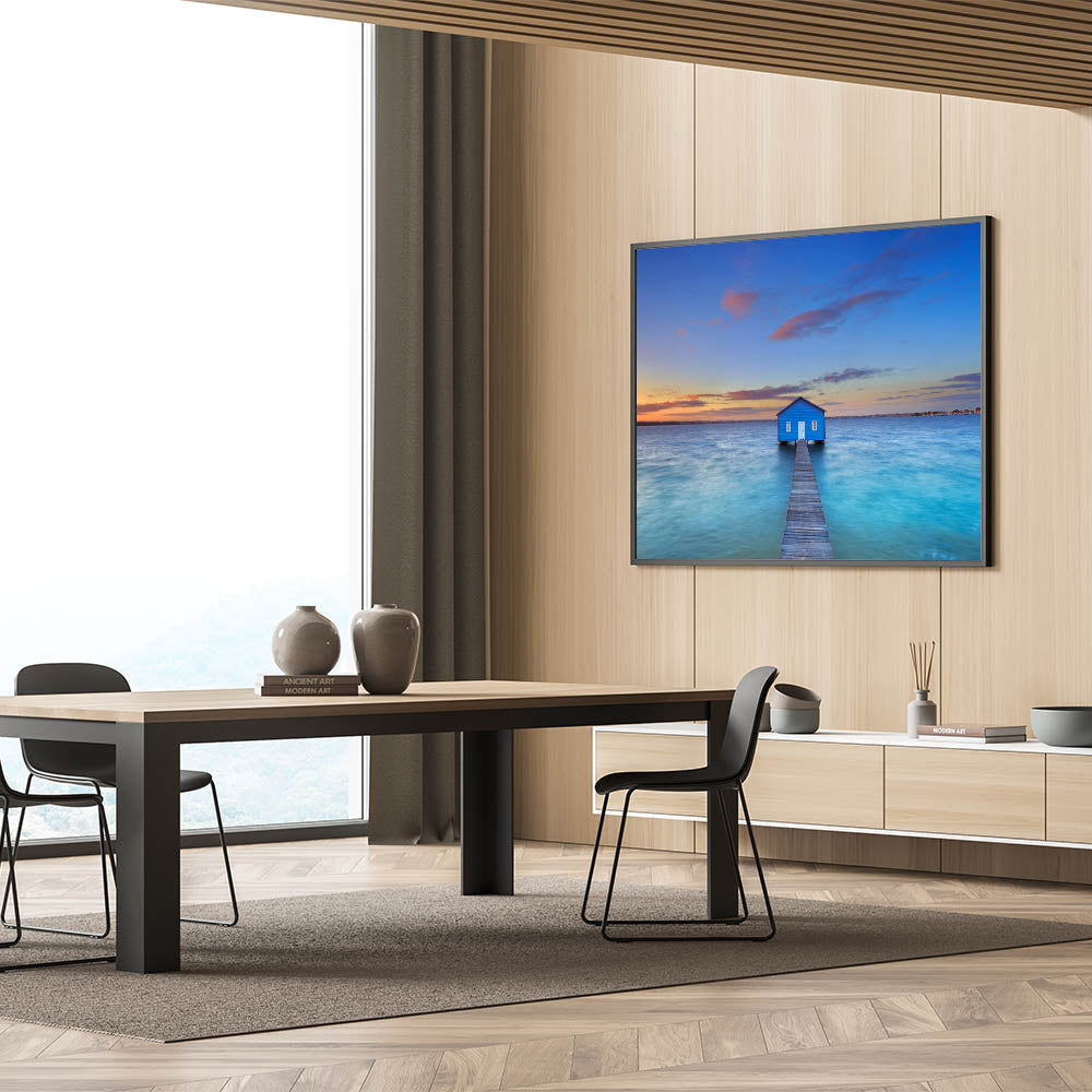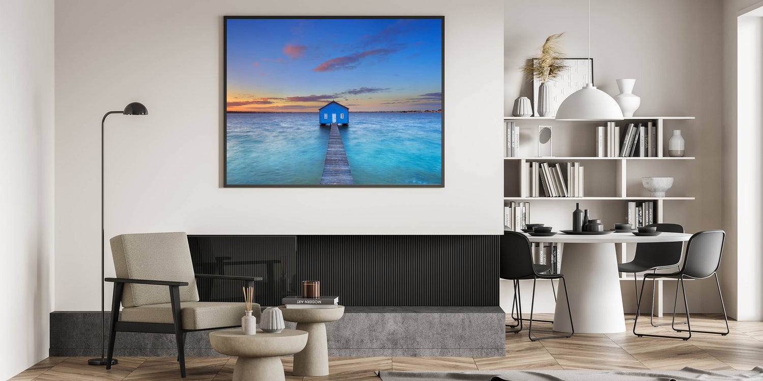 Celebrate the tranquil beauty of the famous Blue Boat House with this stunning Perth Wall Art. Capturing the perfect moment at sunset, the rich blue tones of the water blend seamlessly with the soft orange hues of the sky. This Perth Landscape Canvas brings a calming and peaceful atmosphere to any room.