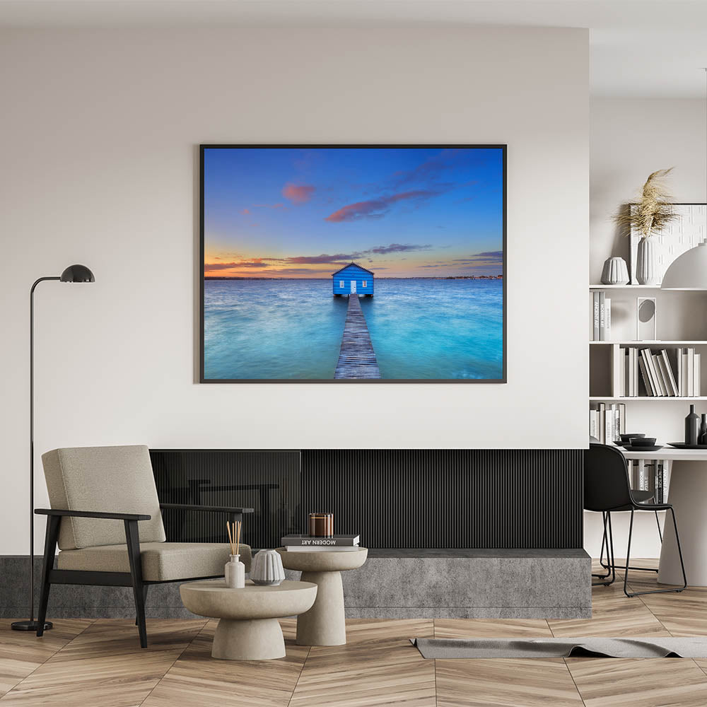 - High-quality Scenic Perth Artwork showcasing the iconic Blue Boat House at sunset