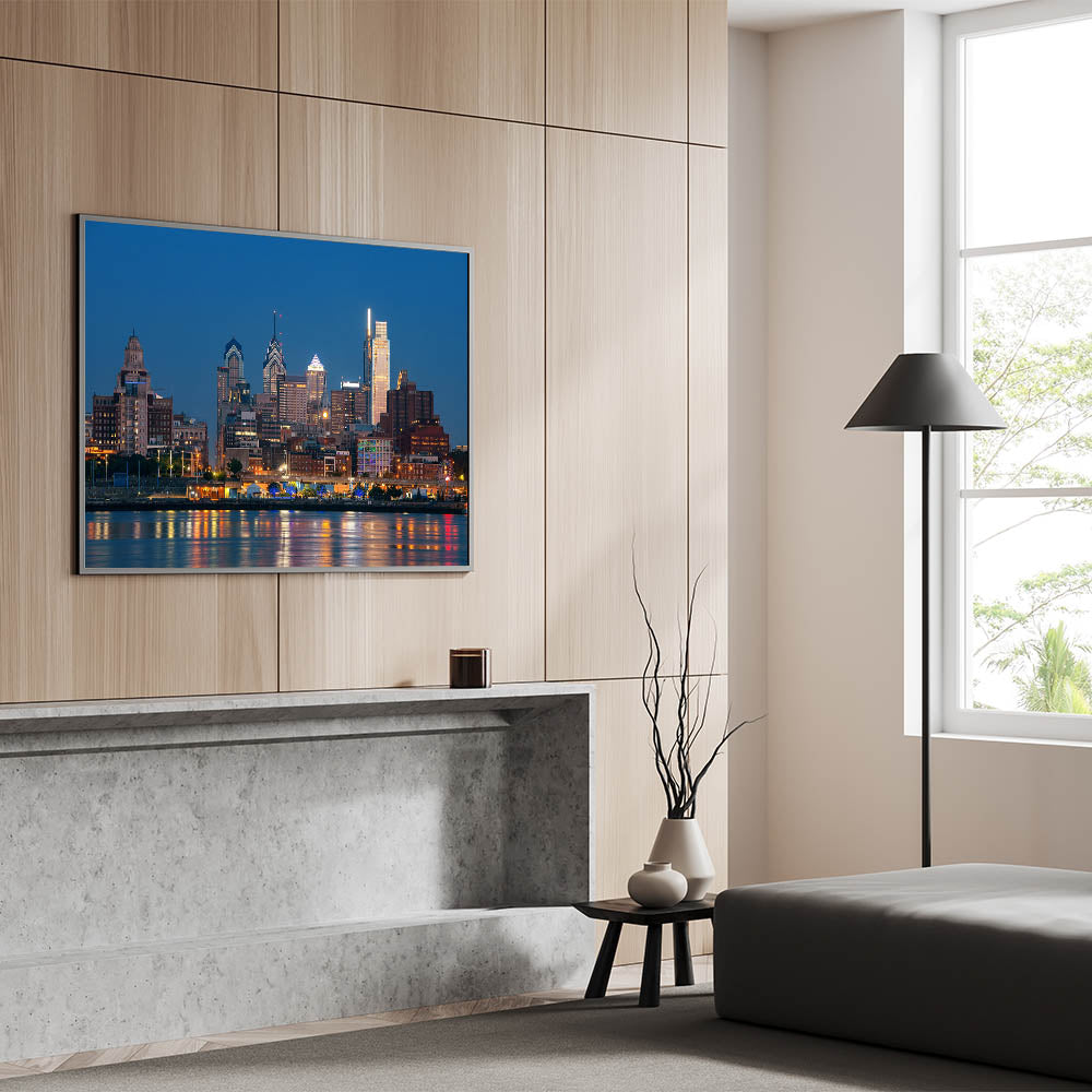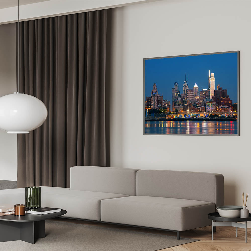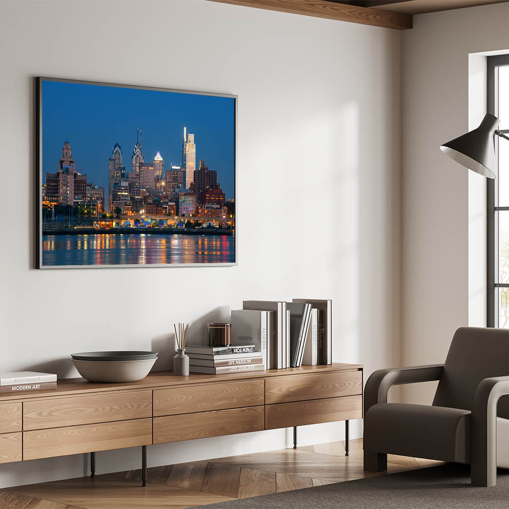 Illuminate your space with the captivating glow of Philadelphia’s night skyline. This stunning cityscape art captures the vibrant lights of the city as they reflect off the calm waters, creating a mesmerizing scene that brings the energy of Philadelphia to life. The deep blue sky contrasts beautifully with the radiant lights of the buildings, making this piece a perfect focal point for any room.