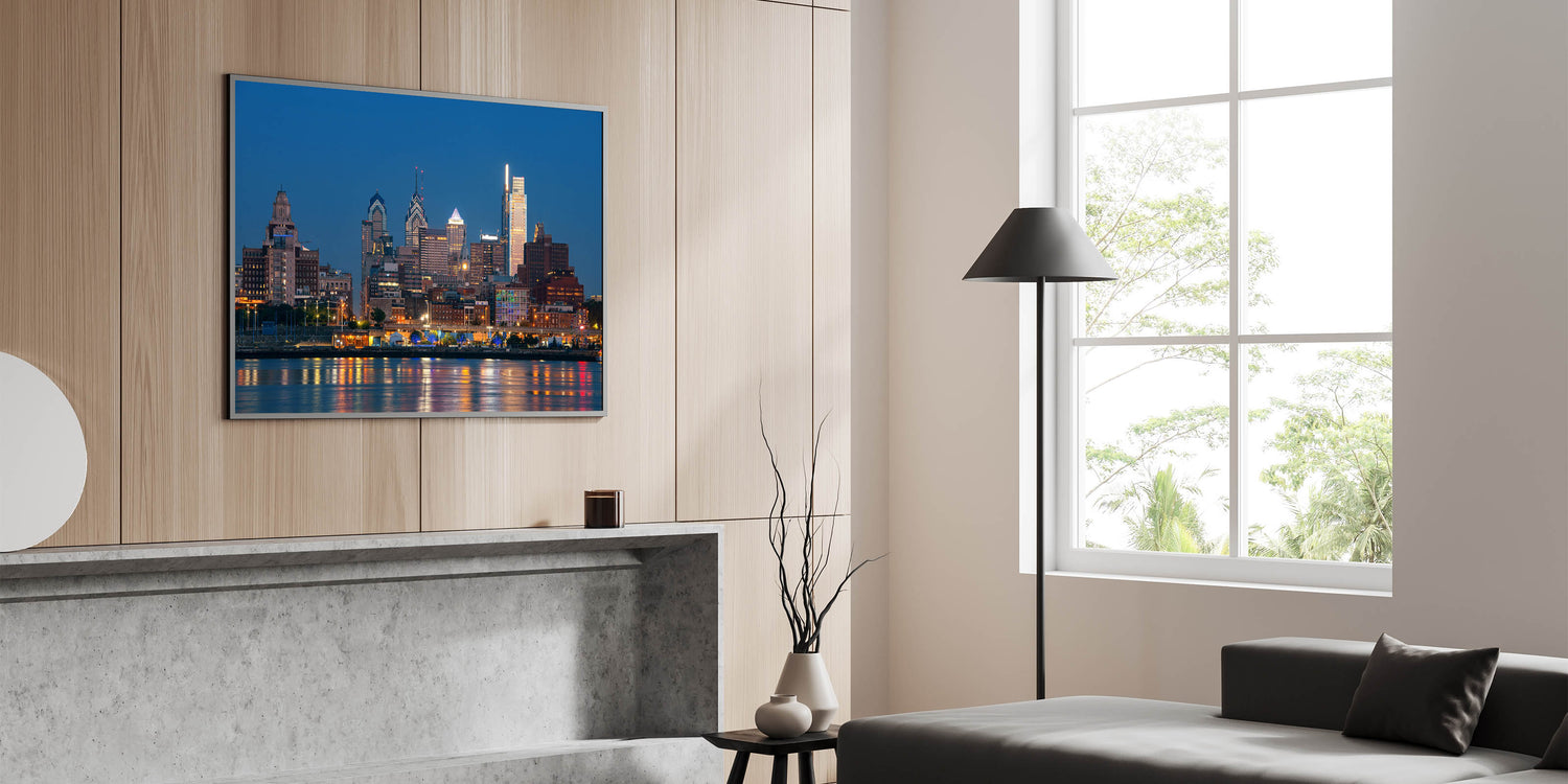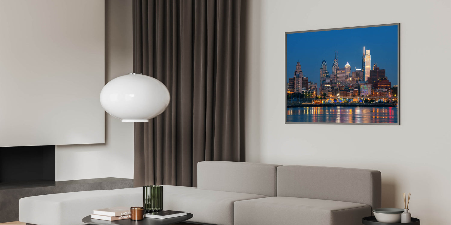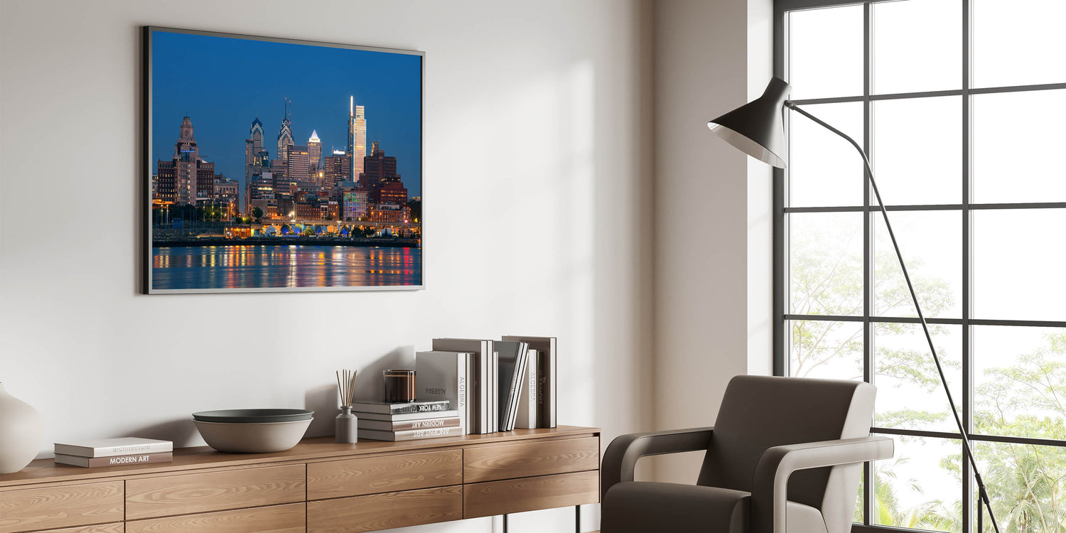 Illuminate your space with the captivating glow of Philadelphia’s night skyline. This stunning cityscape art captures the vibrant lights of the city as they reflect off the calm waters, creating a mesmerizing scene that brings the energy of Philadelphia to life. The deep blue sky contrasts beautifully with the radiant lights of the buildings, making this piece a perfect focal point for any room.