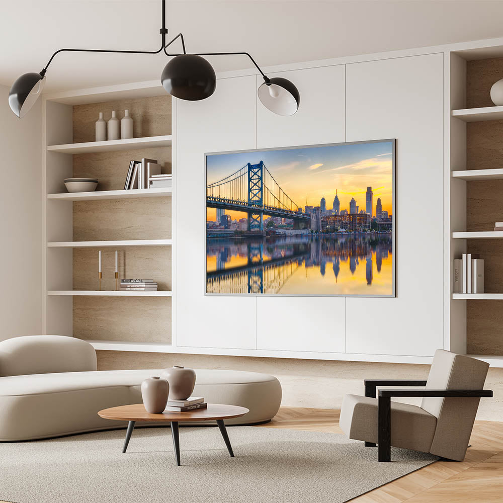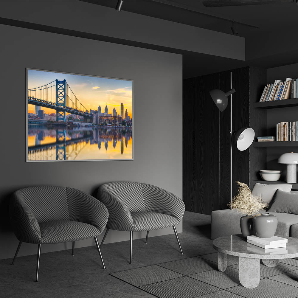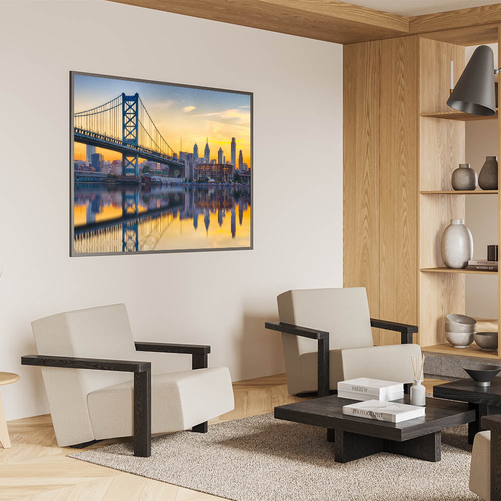 Capture the iconic beauty of Philadelphia with this stunning skyline art featuring the Ben Franklin Bridge at sunset. The majestic bridge spans across the scene, reflecting perfectly in the calm waters below, while the city's skyline basks in the warm glow of the setting sun. This artwork encapsulates the harmony between urban architecture and natural beauty, making it an exquisite addition to any space.