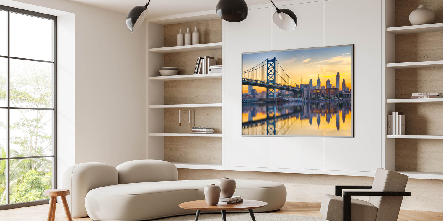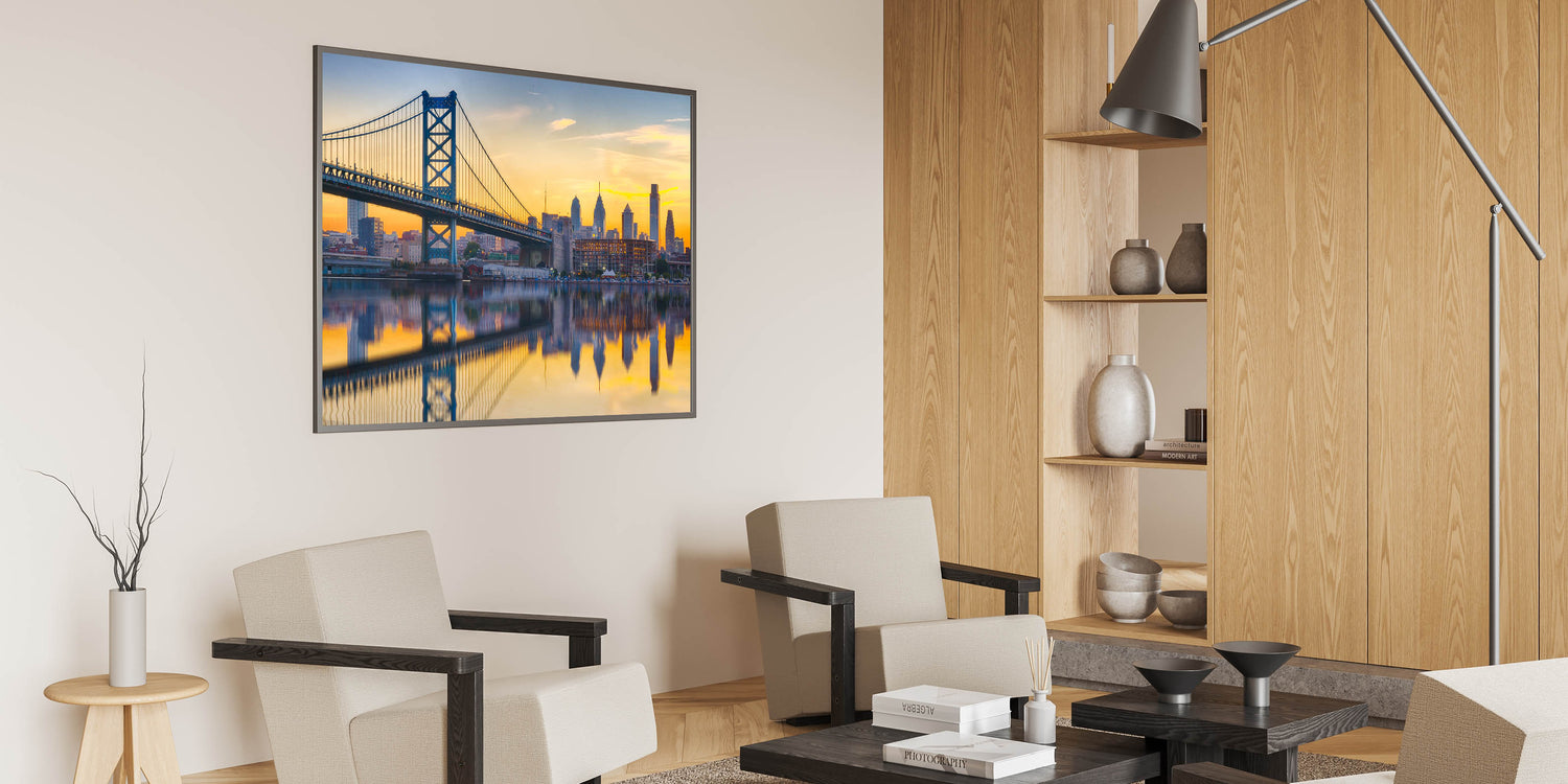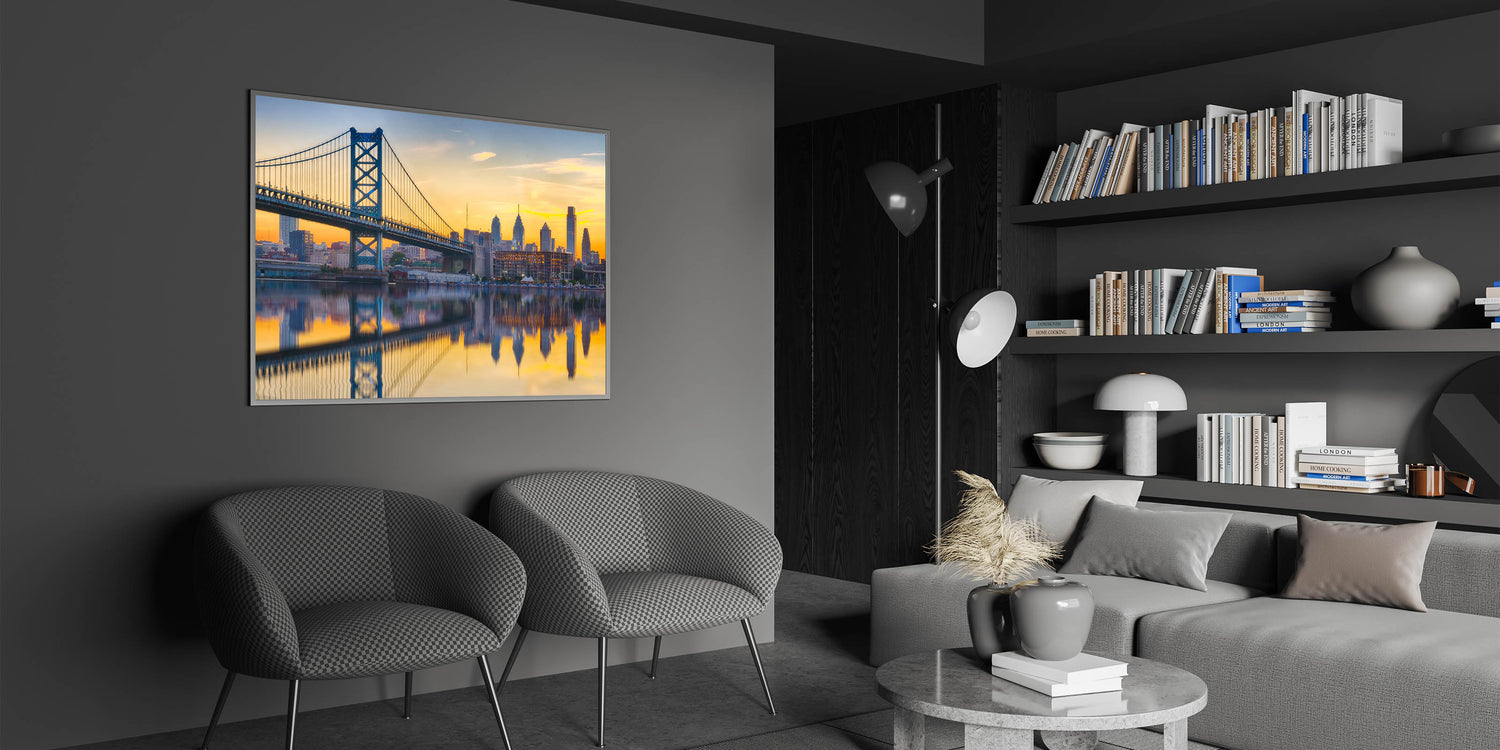 Capture the iconic beauty of Philadelphia with this stunning skyline art featuring the Ben Franklin Bridge at sunset. The majestic bridge spans across the scene, reflecting perfectly in the calm waters below, while the city's skyline basks in the warm glow of the setting sun. This artwork encapsulates the harmony between urban architecture and natural beauty, making it an exquisite addition to any space.