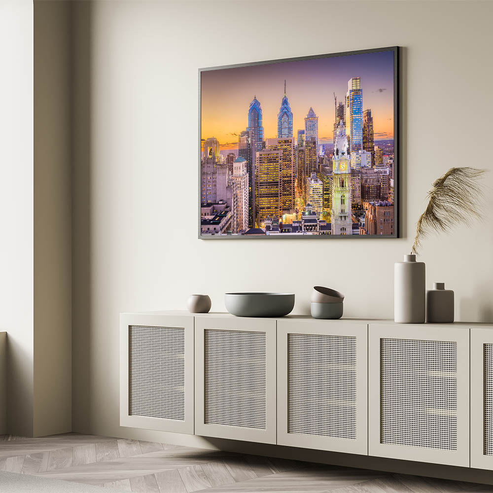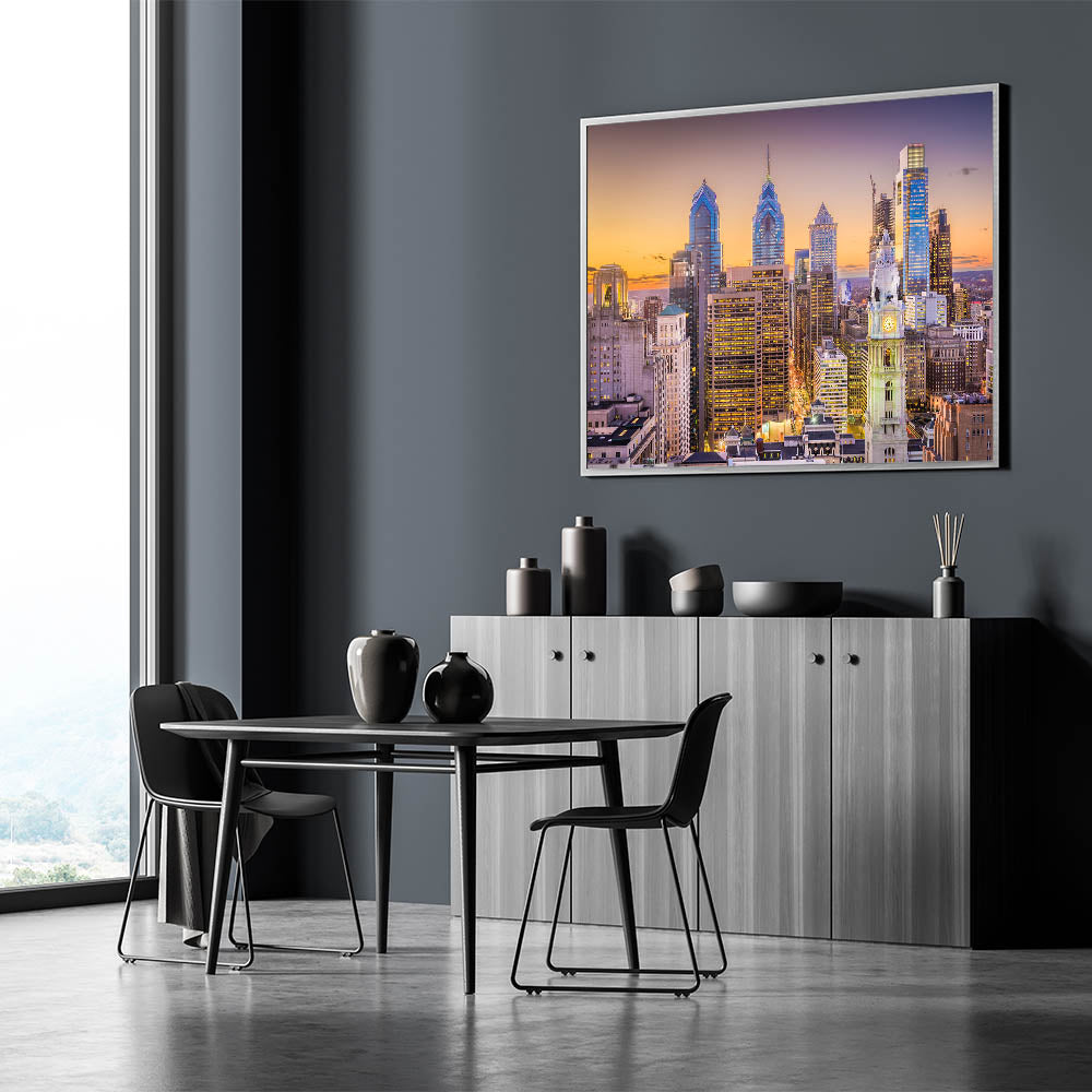 This Philadelphia cityscape art not only serves as a striking visual piece but also as a celebration of the city's rich history and vibrant energy. Perfect for homes, offices, or galleries, this artwork will bring a touch of elegance and warmth to your surroundings. Order today and let the beauty of Philadelphia brighten your space.