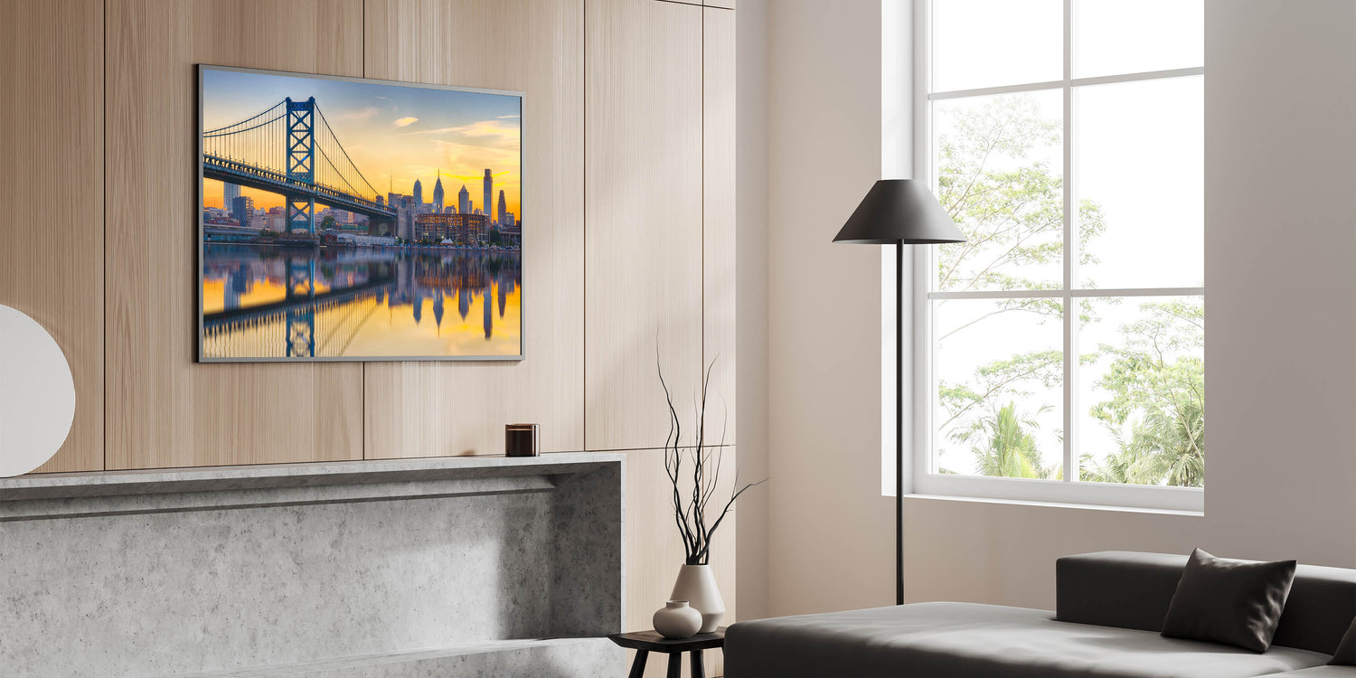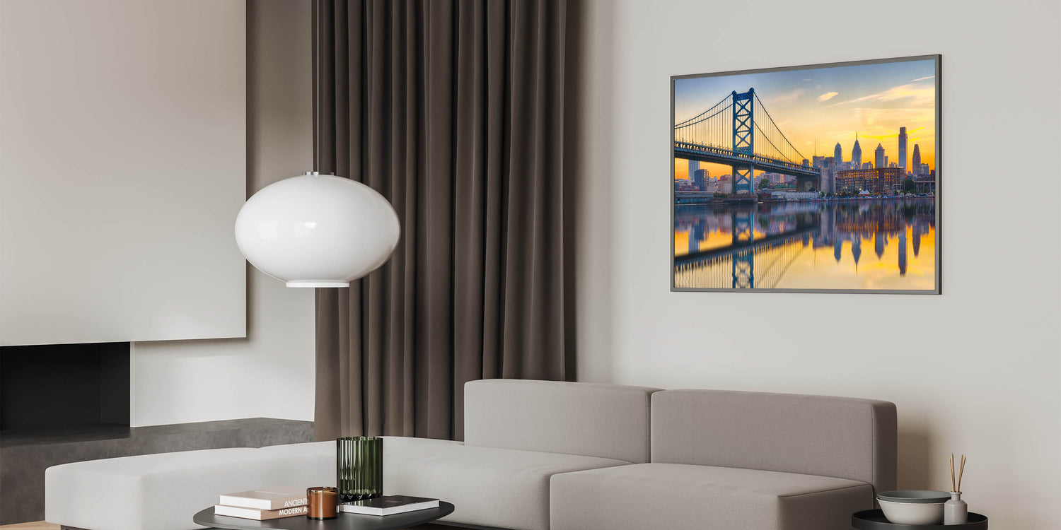 Elevate your space with this stunning piece of Philadelphia skyline art. The combination of the iconic bridge, the city, and the breathtaking sunset reflection creates a timeless scene that will captivate anyone who sees it.