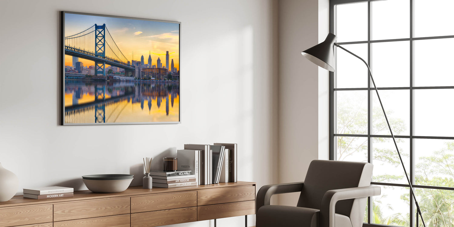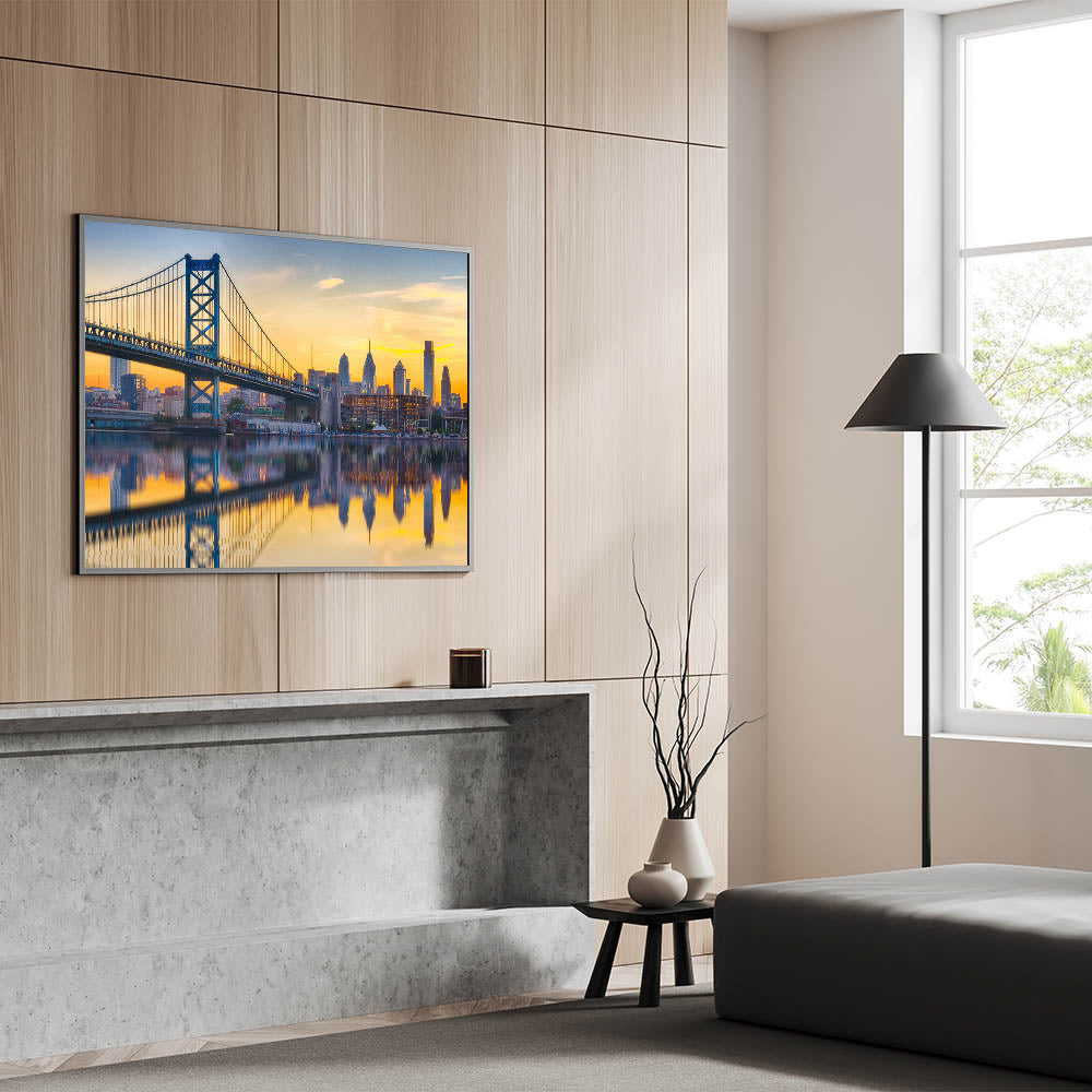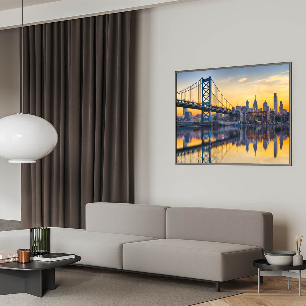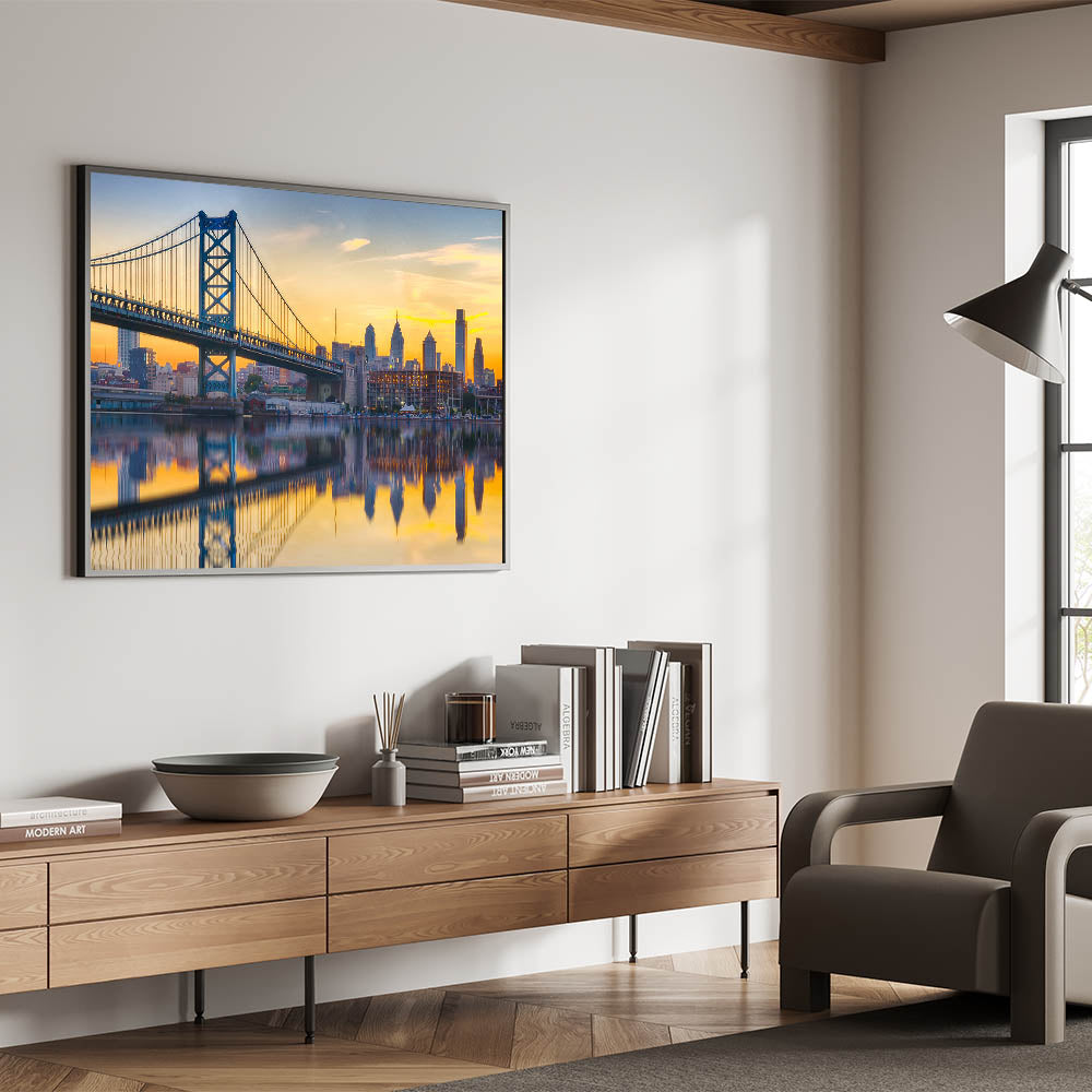 This stunning Philadelphia skyline wall art features the Ben Franklin Bridge during a serene sunset, with the skyline reflected beautifully in the water below. The golden hues of the sky blend perfectly with the calm waters, creating a mesmerizing reflection of the city and bridge. Ideal for those who love cityscapes and sunsets, this artwork brings both tranquility and vibrant energy into any space.