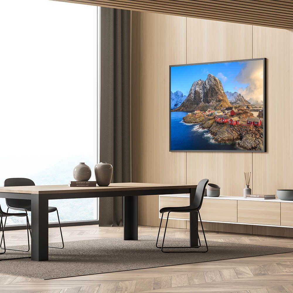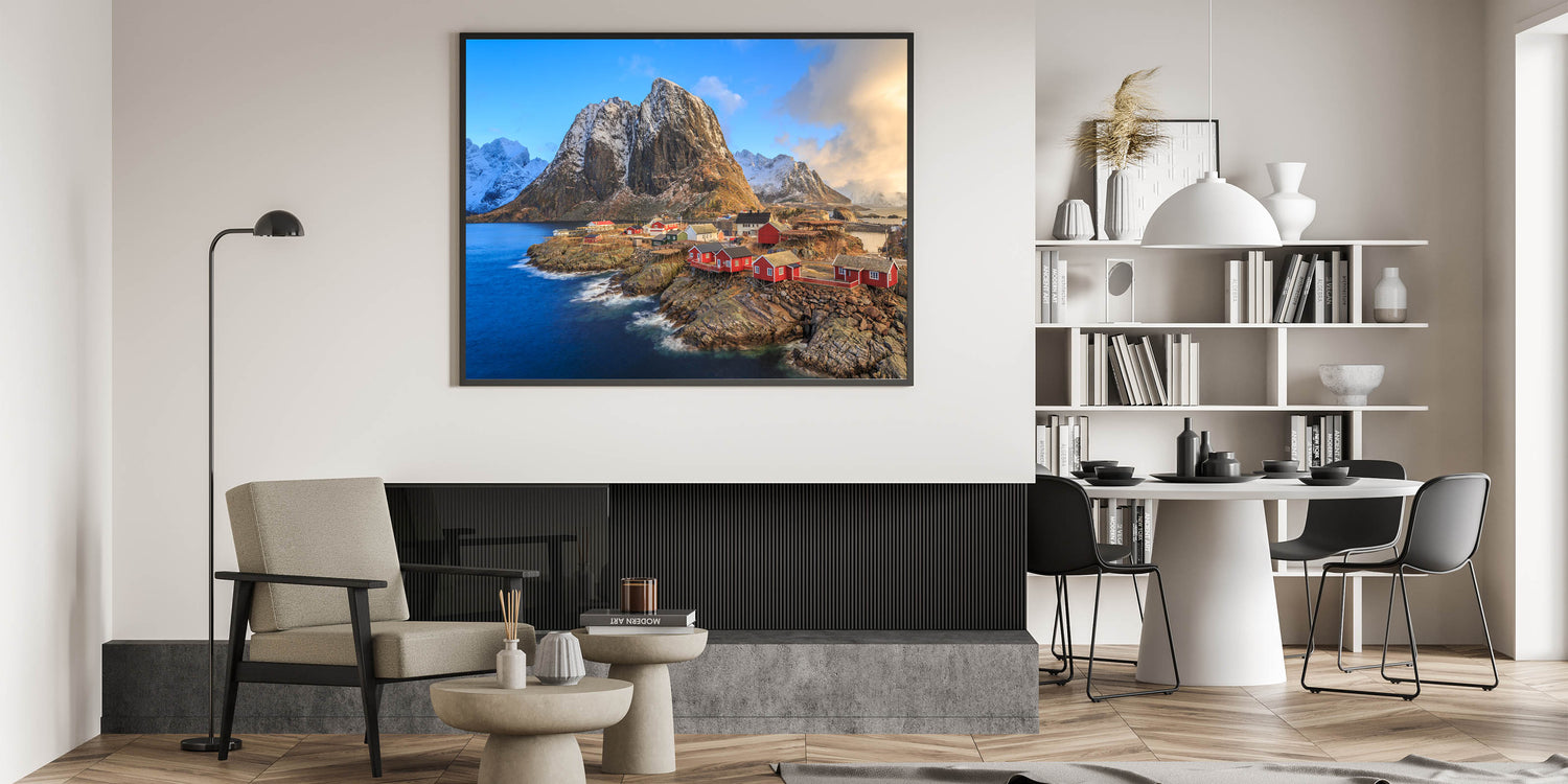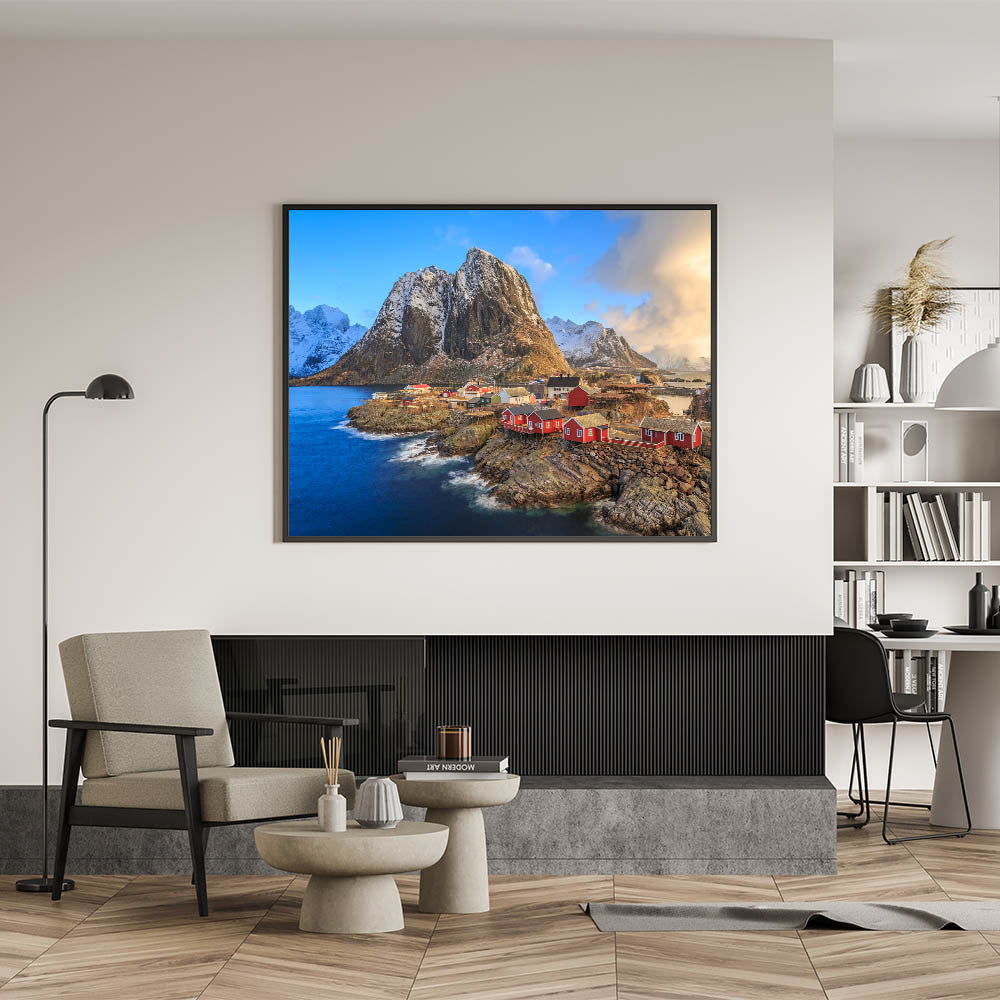 Bring the serene beauty of a remote village by the sea into your home with this stunning piece of village landscape art. This artwork captures a breathtaking scene of red houses perched on rocky shores, surrounded by snow-capped mountains and a tranquil blue sea. The vivid colors and detailed composition of this painting evoke a sense of peace and timelessness, making it a perfect addition to any living room, bedroom, or office space.