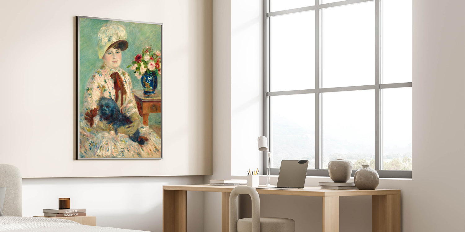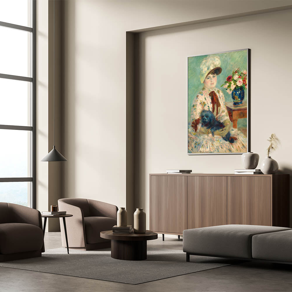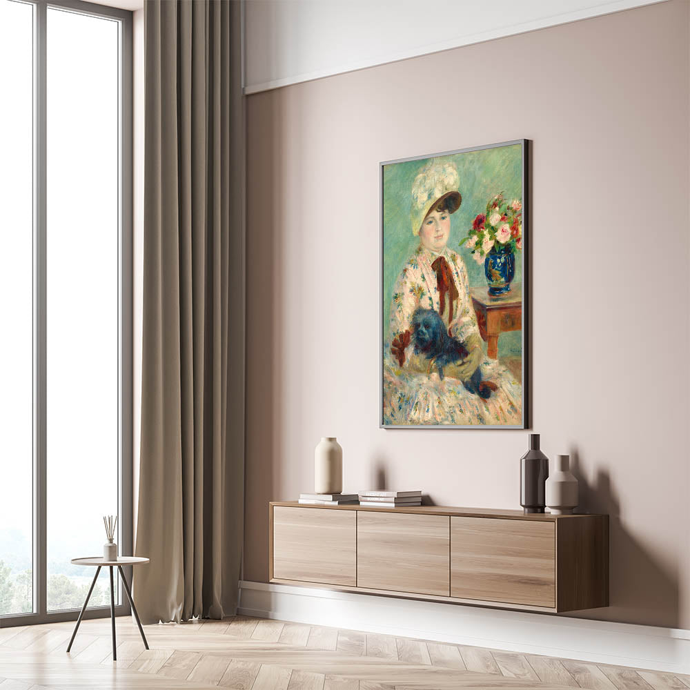 Celebrate the timeless beauty of Pierre-Auguste Renoir's art with this delightful portrait featuring a woman with her dog, surrounded by vibrant floral arrangements. Renoir, one of the most celebrated Impressionist painters, is known for his mastery of light and color. This piece reflects his signature soft brushstrokes and the use of vibrant hues, adding an elegant touch to any room. The serenity of the scene, combined with Renoir's vibrant brushwork, makes this print a captivating focal point in any space.