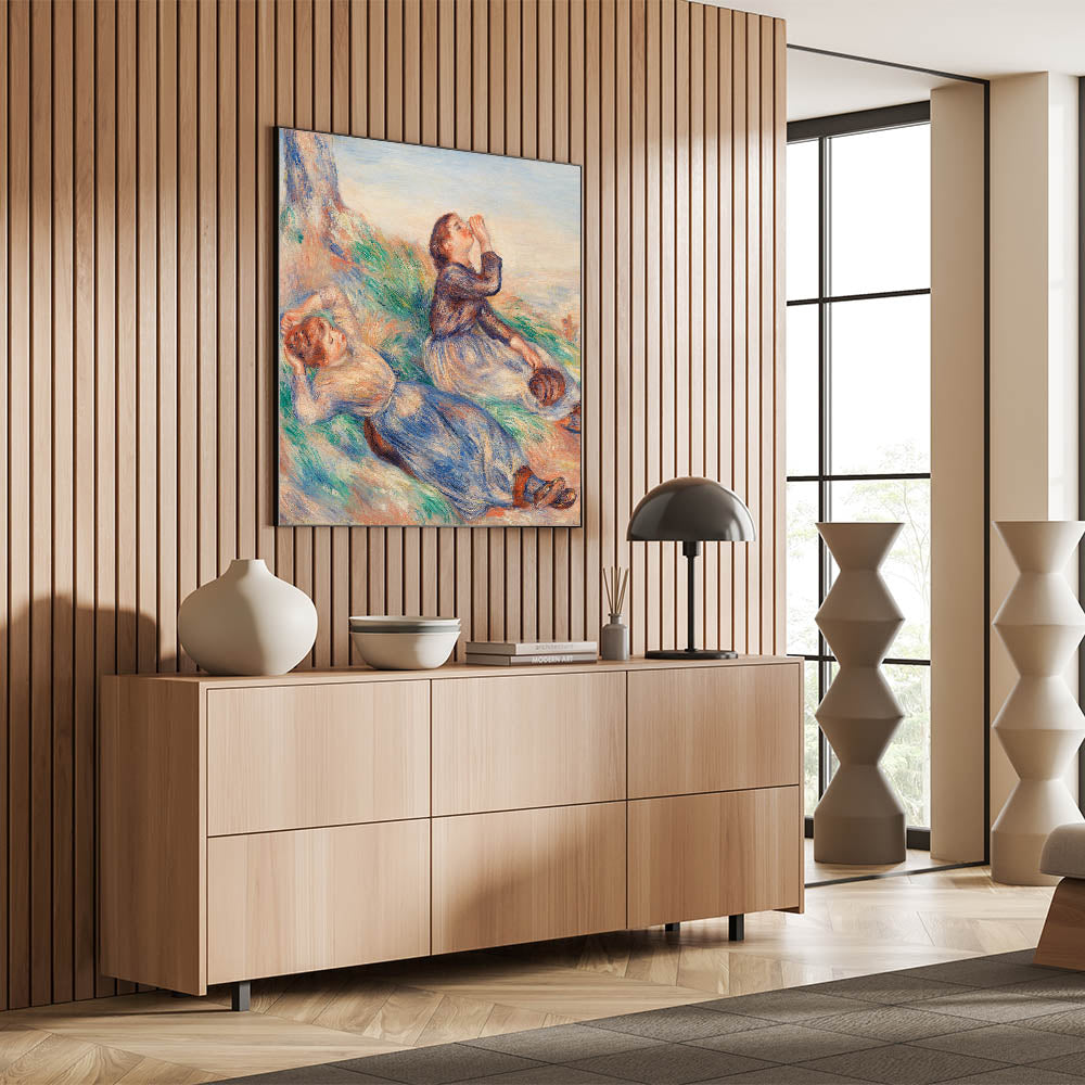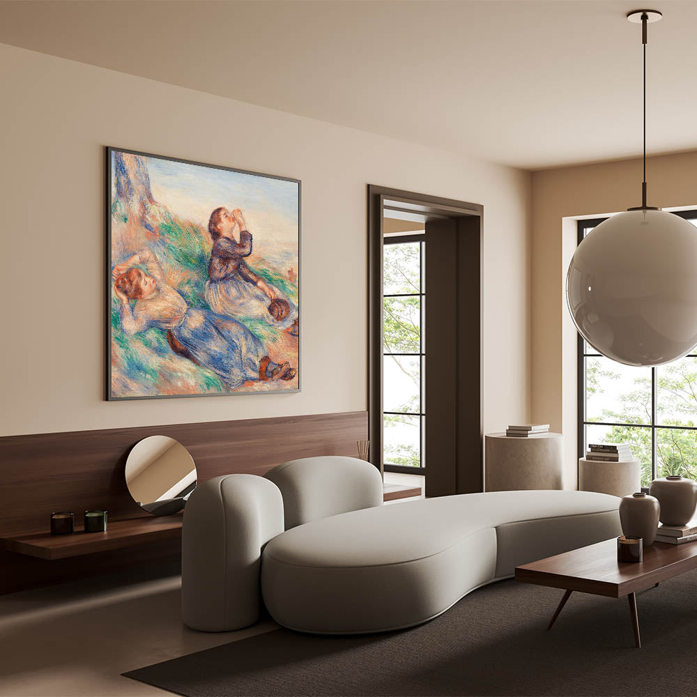 Transform your living space with this exquisite Pierre-Auguste Renoir painting, capturing a tranquil moment of leisure in nature. Renoir’s vibrant brushwork brings to life the soft, flowing movements of the figures and the gentle landscape in this Impressionist masterpiece. The painting showcases the timeless elegance of Renoir’s work, with its delicate interplay of light, color, and texture that characterizes French Impressionism.