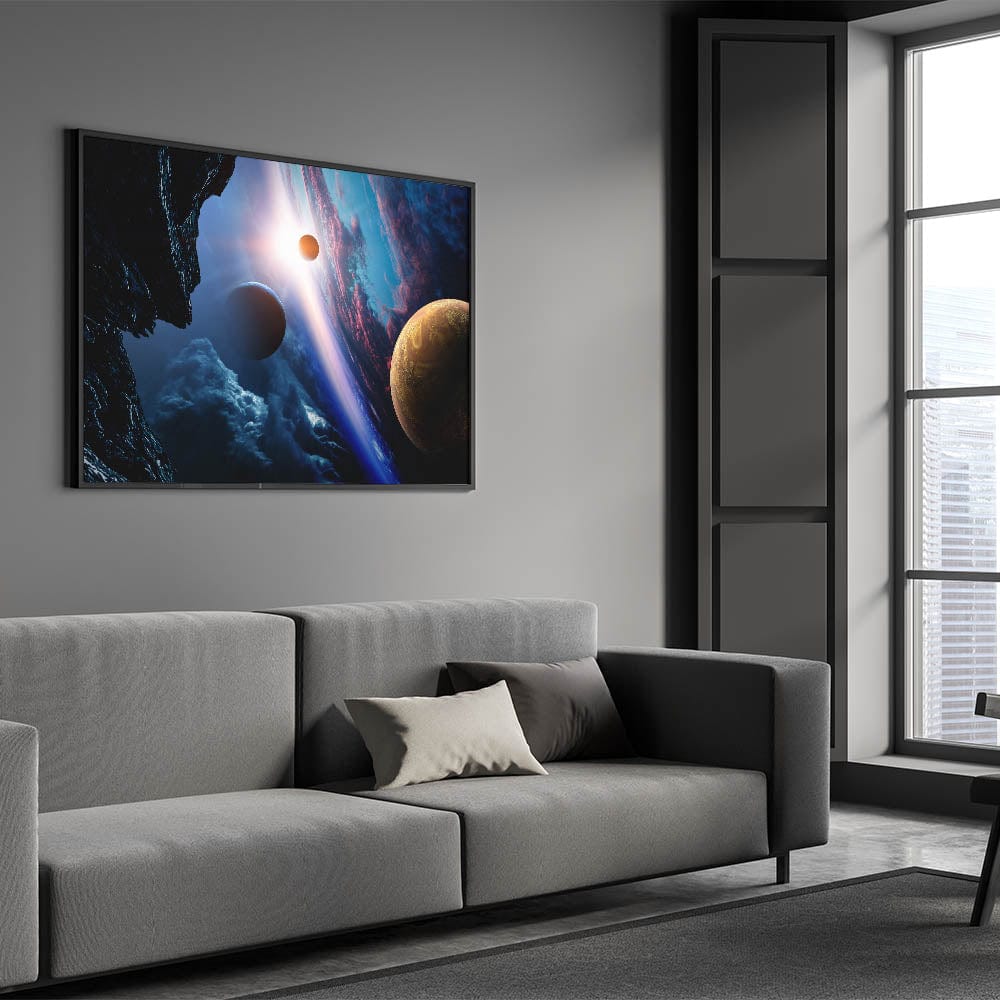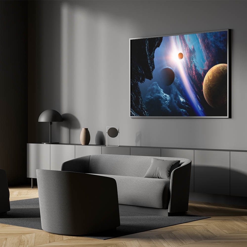 - Galaxy Art Print depicting a planetary sunrise, multiple moons, and vibrant cosmic colors.