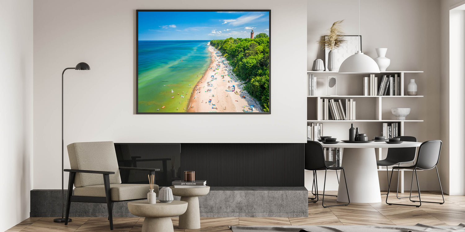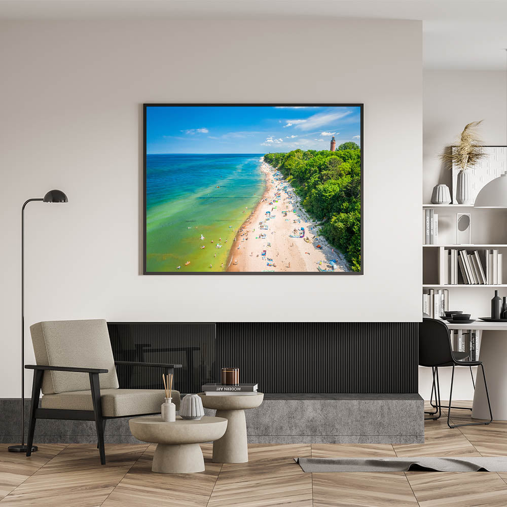Bring the vibrant energy of Poland’s Baltic Sea coast into your space with this stunning wall art of a lively beach scene. The image captures a sandy shoreline dotted with beachgoers, turquoise waters, and a charming lighthouse nestled among lush greenery. Perfect for those who love the seaside or want a reminder of summer, this artwork adds a splash of color and relaxation to any room.